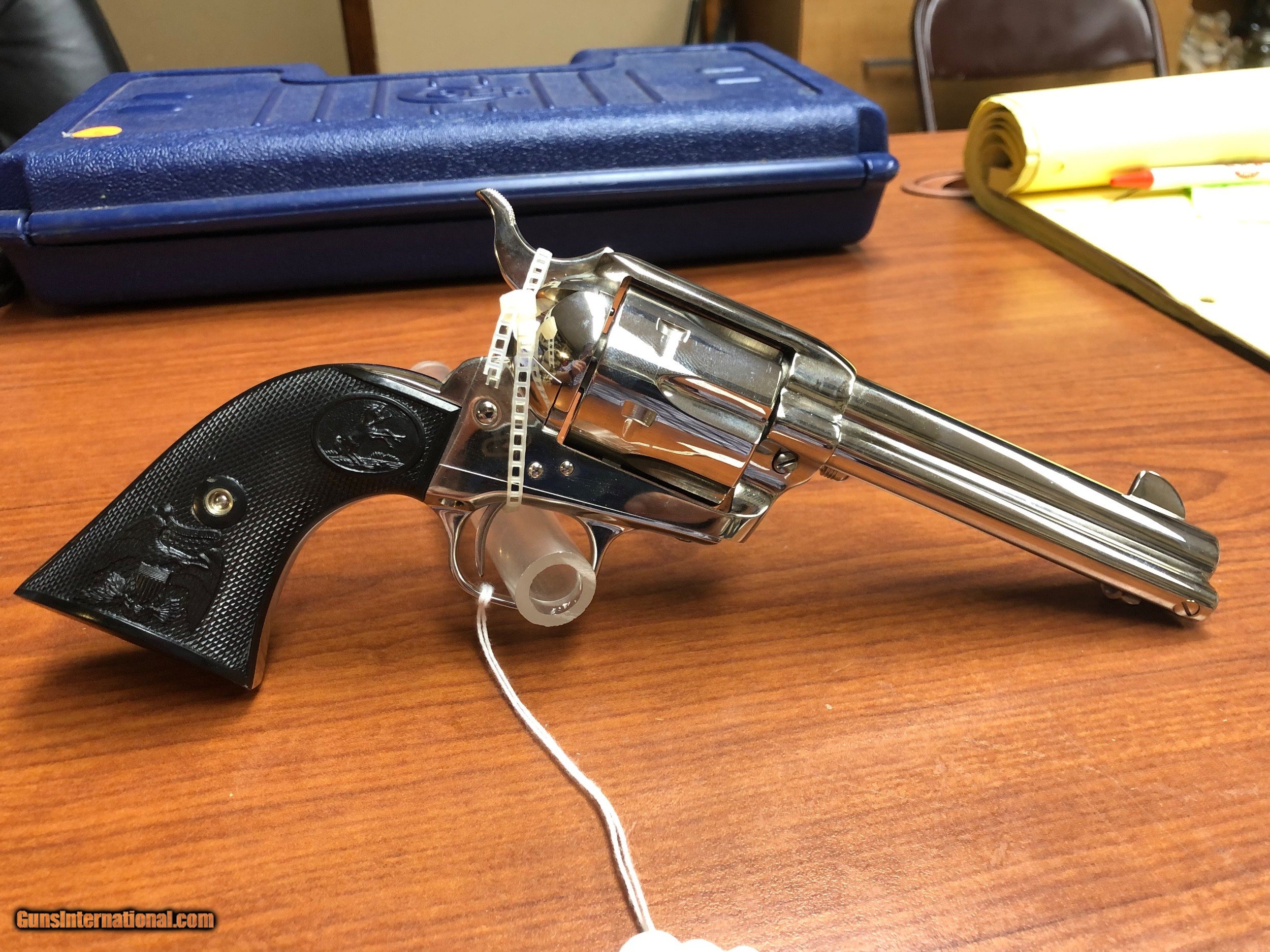 Description: This single action army caught revolver chambered in 45 created in 1998 it has a 5 inch barrel that throughout and black rubber grips. Nib SOLD Handgun Caliber: .45 Colt Manufacturer: Colt Model: SAA Barrel Length: 5 Condition: nib |