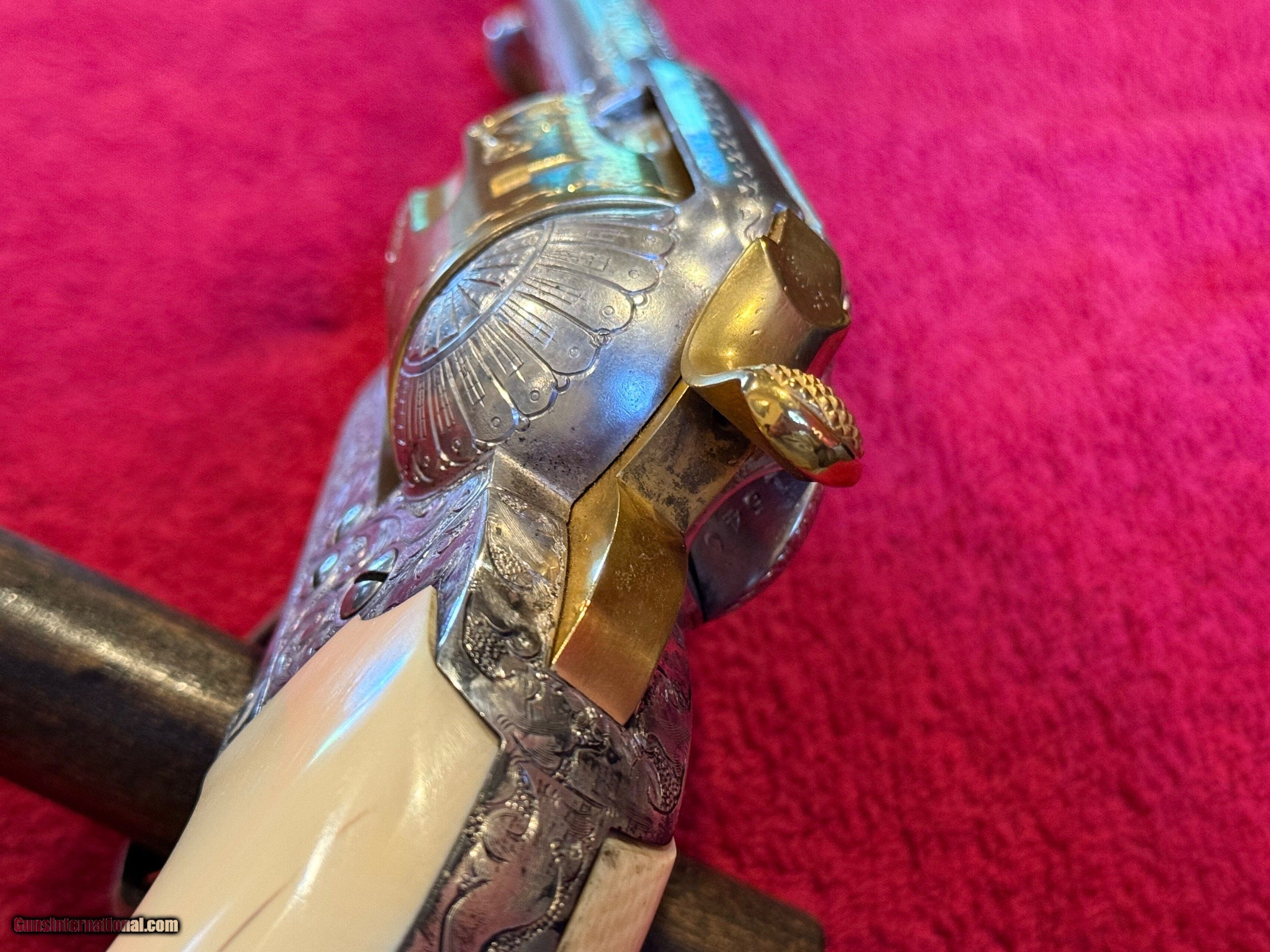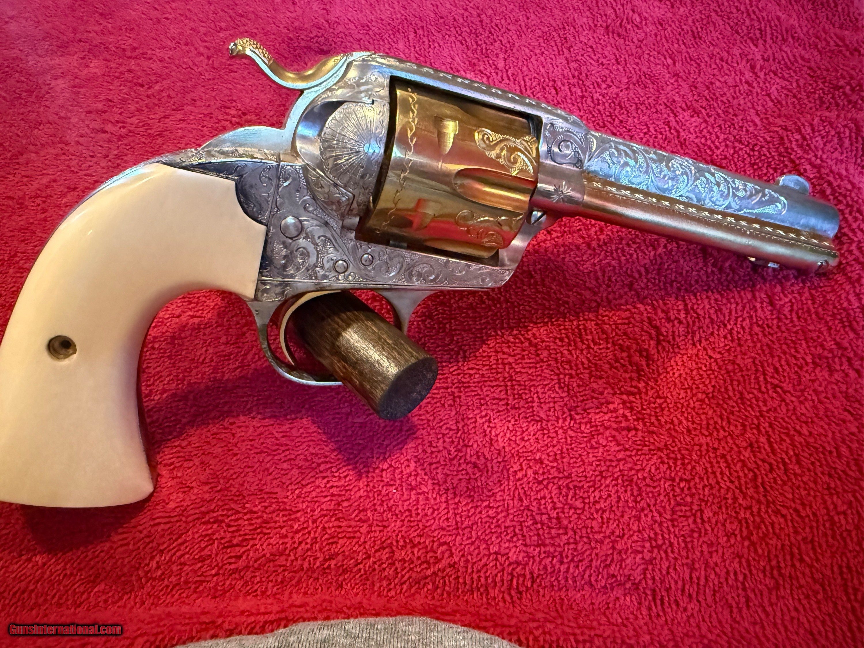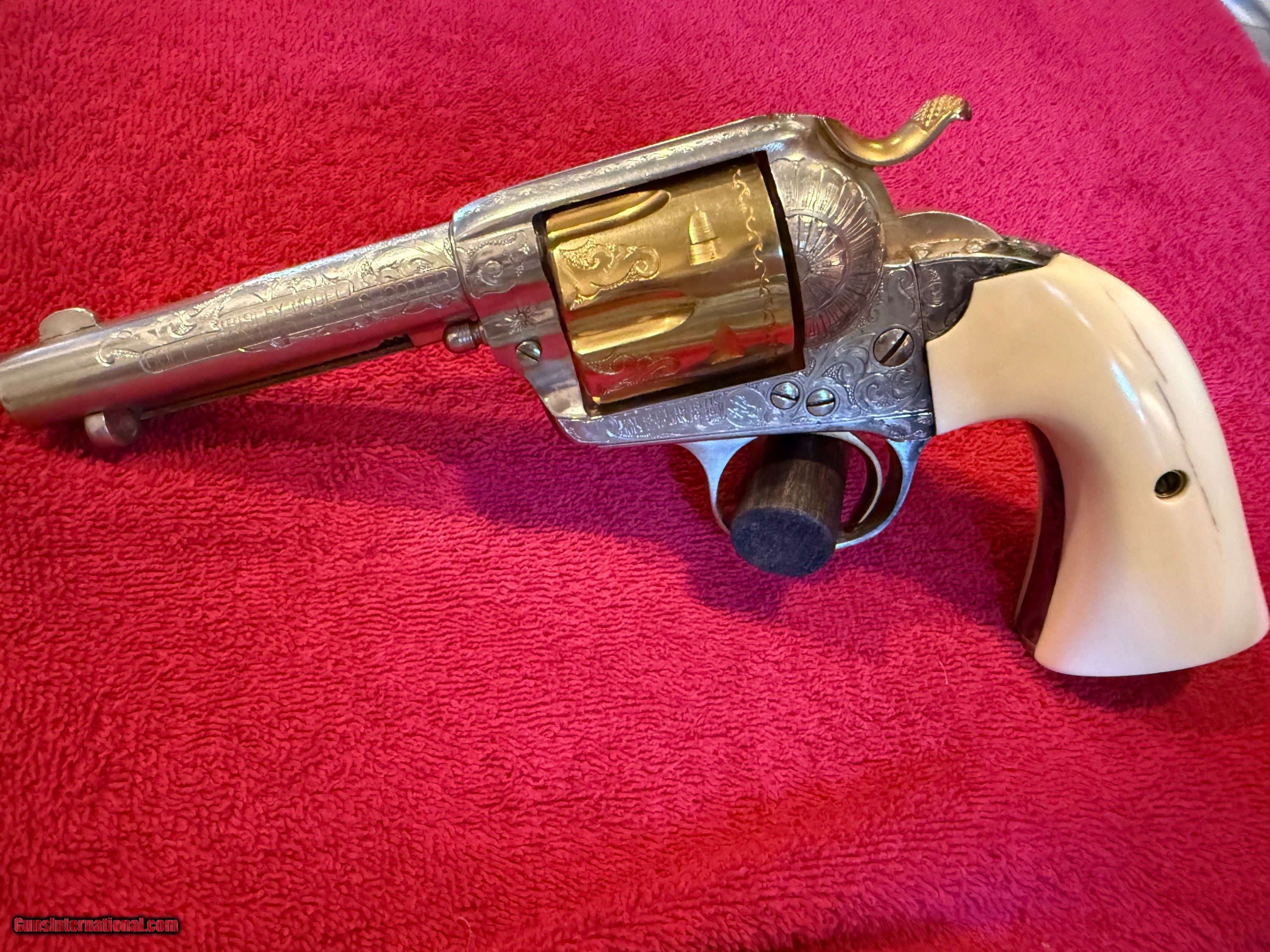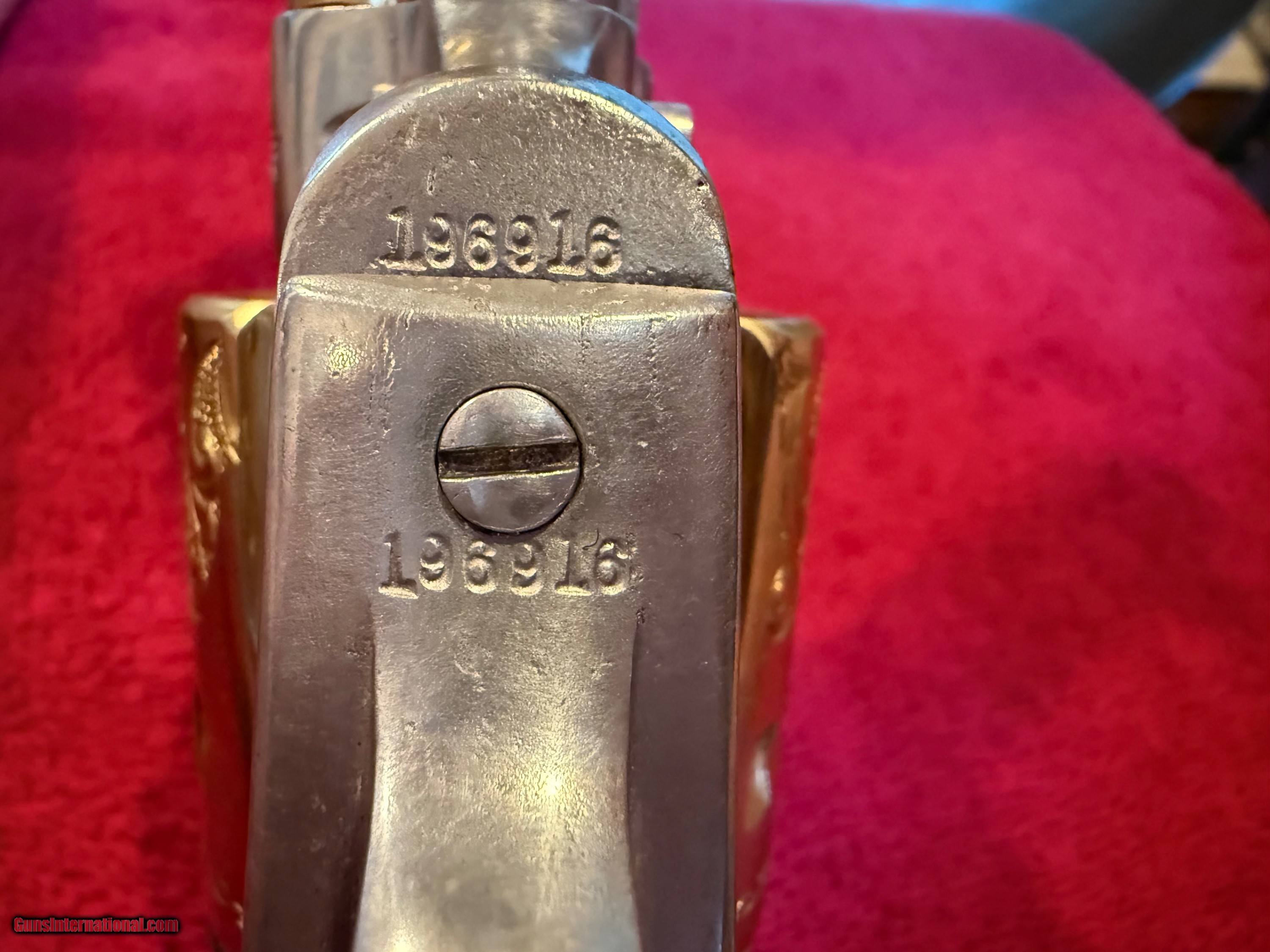 Description: Colt Beasley 44-40 caliber, 4 3/4" barrel, mfg 1900, silver and gold plated, beautifully engraved. Gold plated cylinder, hammer, trigger guard, trigger, and ejector with old ivory grips. Roll die stamped on left side of barrel 2-line BEASLEY MODEL (on top) COLT FRONTIER SIX-SHOOTER (underneath) indicating 44-40 caliber. 2-line address on top of barrel. Patent and Rampant Colt excellently stamped sharp and clear. Serial numbers are matching. Assembly numbers (bin numbers)are stamped appropriately. Antique: Yes Manufacturer: Colt Model: 44-40 Serial Number: 196916 Barrel Length: 4 3/4” Condition: Good Metal Condition: Good Manufacture Date: 1900 Engraving: Good Grips: Old ivory Price: $6,250.00 Buy Now Contact Seller |