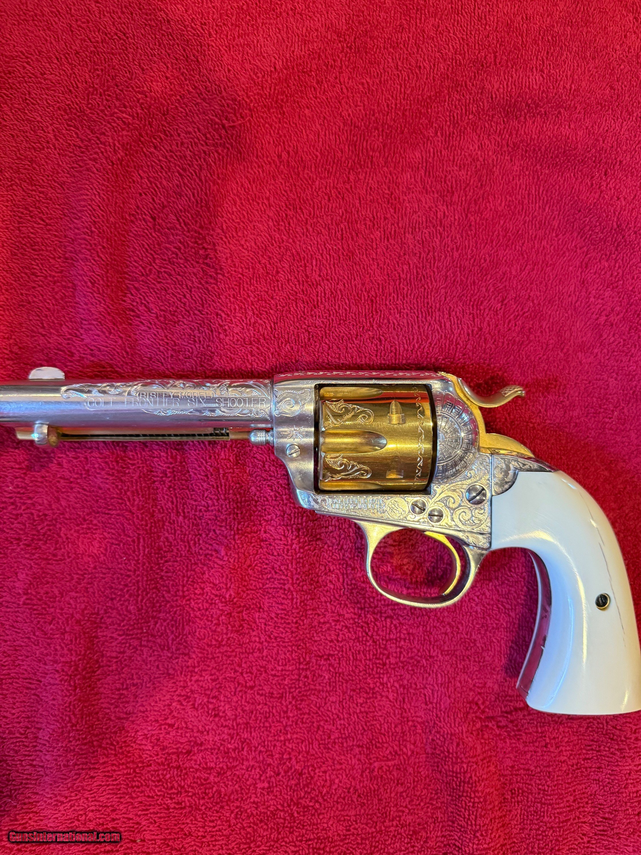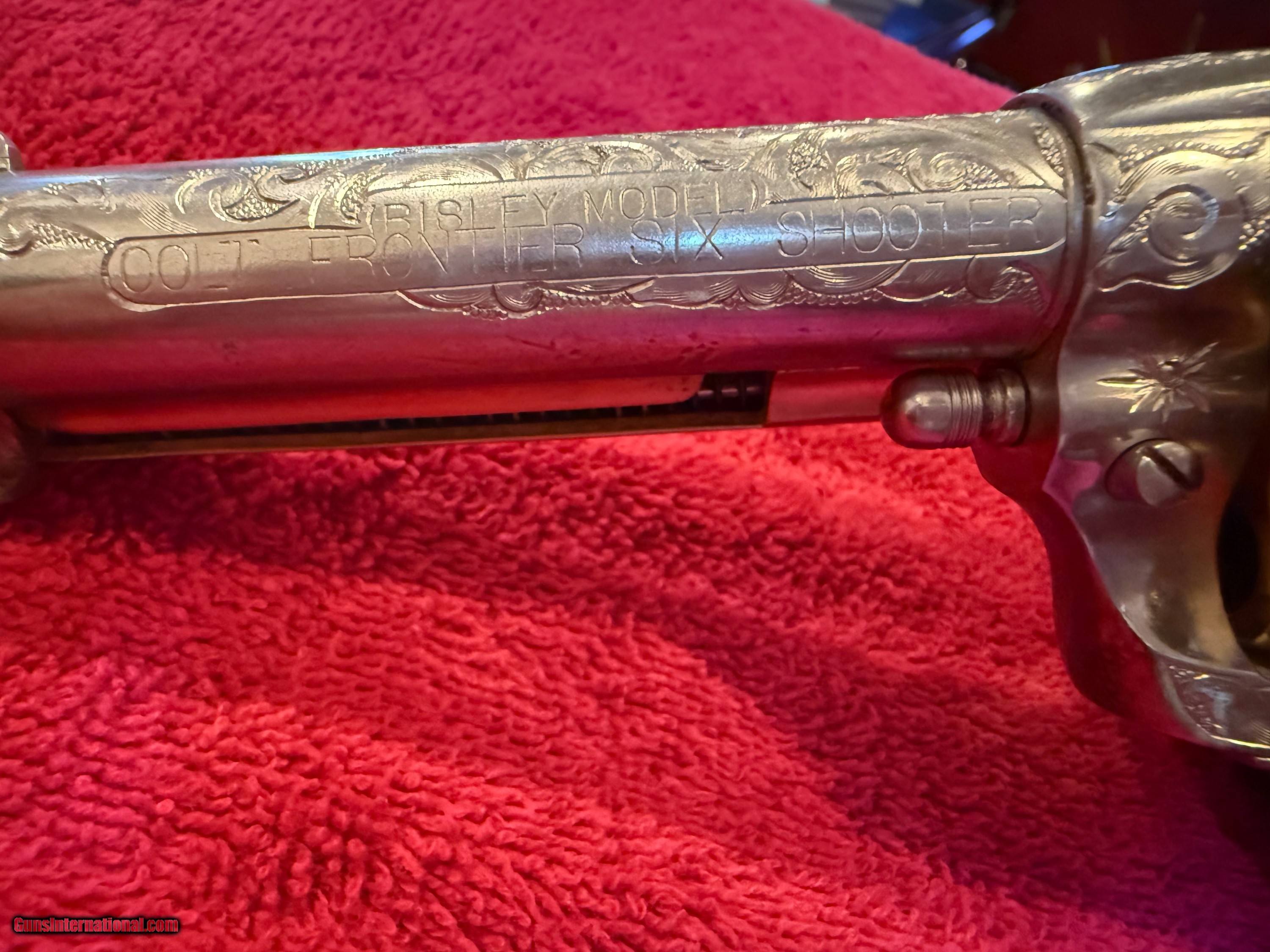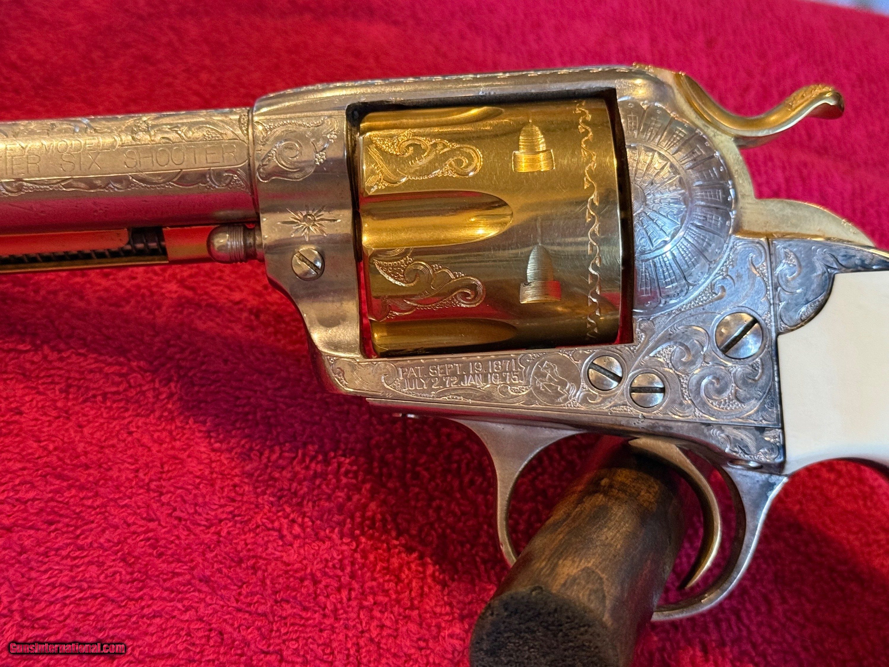 Description: Colt Beasley 44-40 caliber, 4 3/4" barrel, mfg 1900, silver and gold plated, beautifully engraved. Gold plated cylinder, hammer, trigger guard, trigger, and ejector with old ivory grips. Roll die stamped on left side of barrel 2-line BEASLEY MODEL (on top) COLT FRONTIER SIX-SHOOTER (underneath) indicating 44-40 caliber. 2-line address on top of barrel. Patent and Rampant Colt excellently stamped sharp and clear. Serial numbers are matching. Assembly numbers (bin numbers)are stamped appropriately. Antique: Yes Manufacturer: Colt Model: 44-40 Serial Number: 196916 Barrel Length: 4 3/4” Condition: Good Metal Condition: Good Manufacture Date: 1900 Engraving: Good Grips: Old ivory Price: $6,250.00 Buy Now Contact Seller |