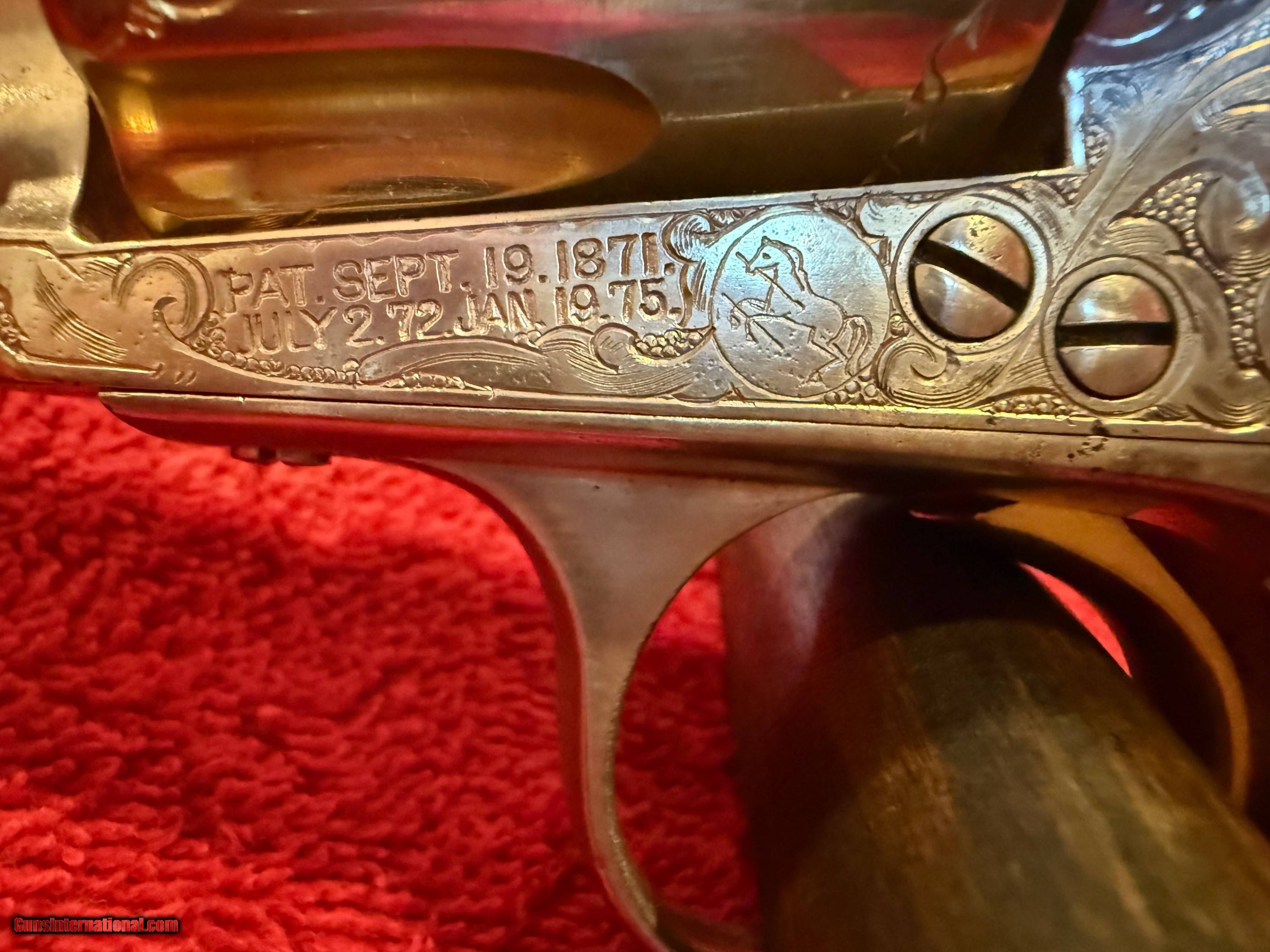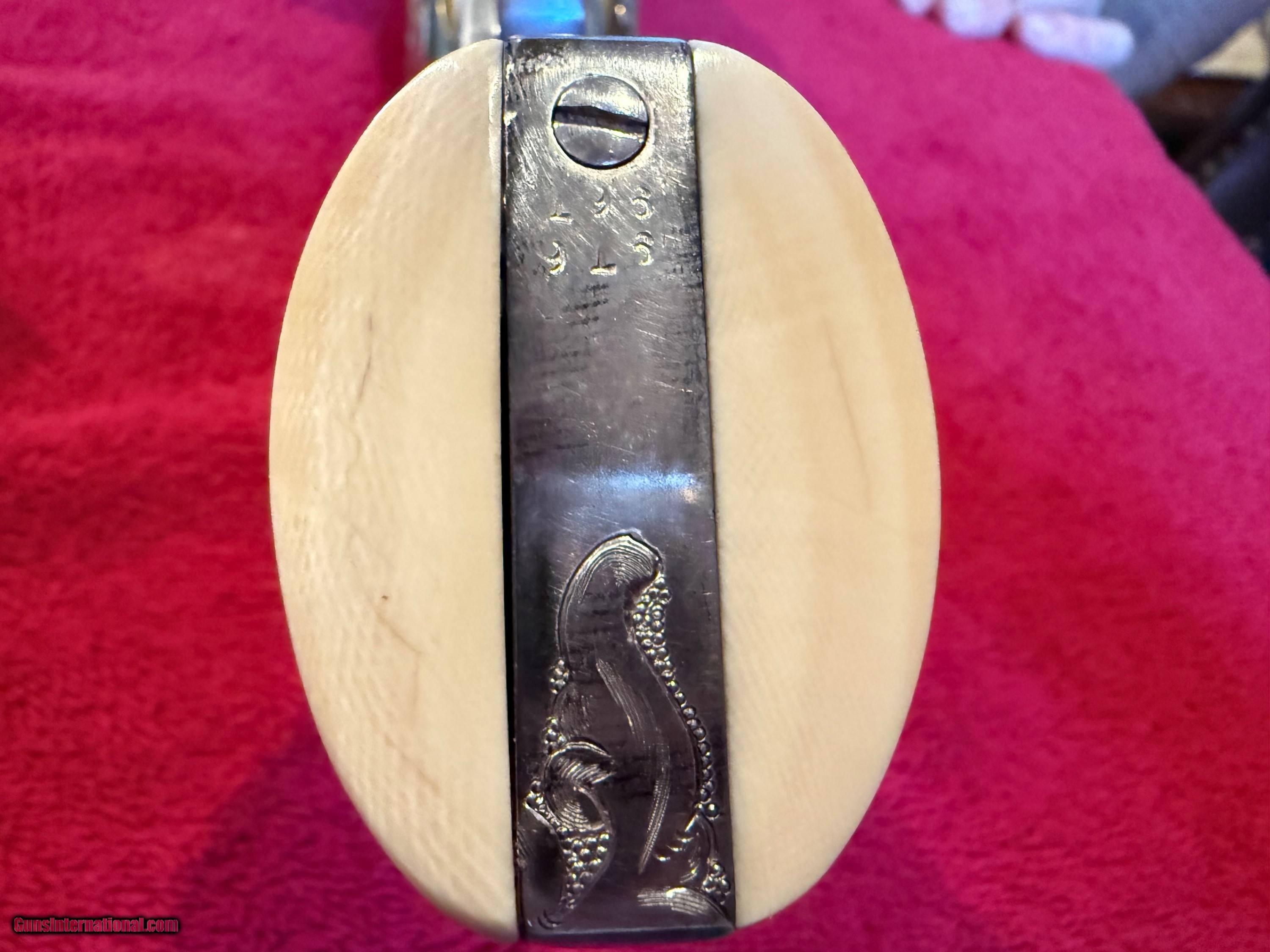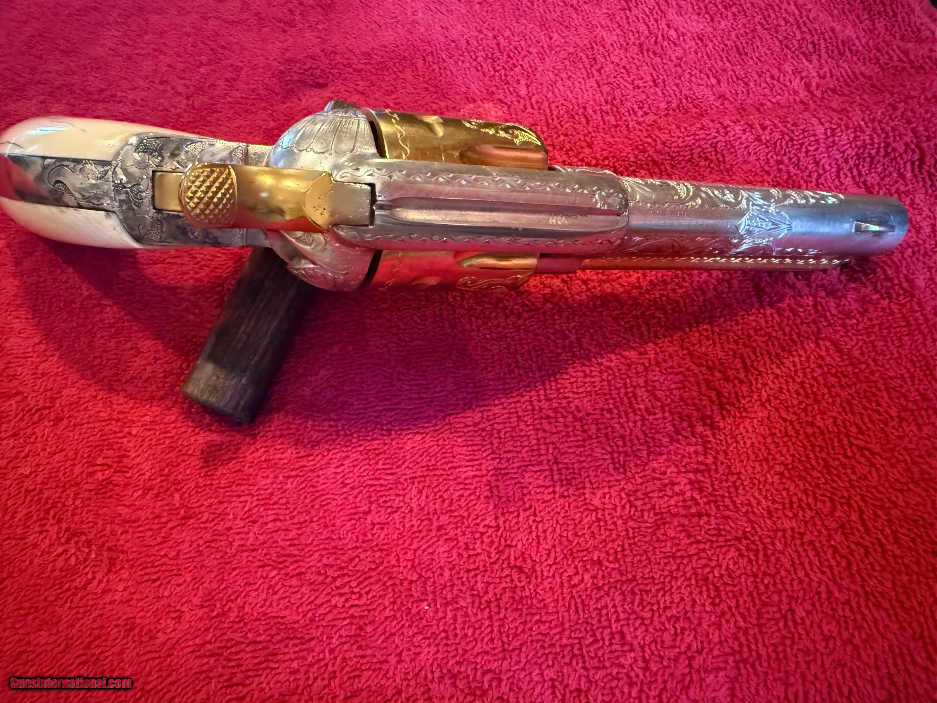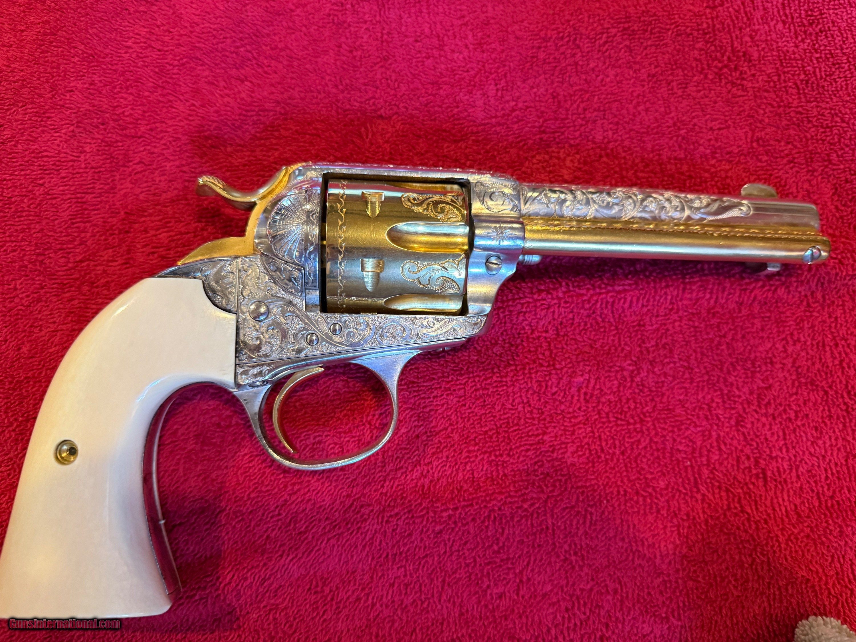 Description: Colt Beasley 44-40 caliber, 4 3/4" barrel, mfg 1900, silver and gold plated, beautifully engraved. Gold plated cylinder, hammer, trigger guard, trigger, and ejector with old ivory grips. Roll die stamped on left side of barrel 2-line BEASLEY MODEL (on top) COLT FRONTIER SIX-SHOOTER (underneath) indicating 44-40 caliber. 2-line address on top of barrel. Patent and Rampant Colt excellently stamped sharp and clear. Serial numbers are matching. Assembly numbers (bin numbers)are stamped appropriately. Antique: Yes Manufacturer: Colt Model: 44-40 Serial Number: 196916 Barrel Length: 4 3/4” Condition: Good Metal Condition: Good Manufacture Date: 1900 Engraving: Good Grips: Old ivory Price: $6,250.00 Buy Now Contact Seller |