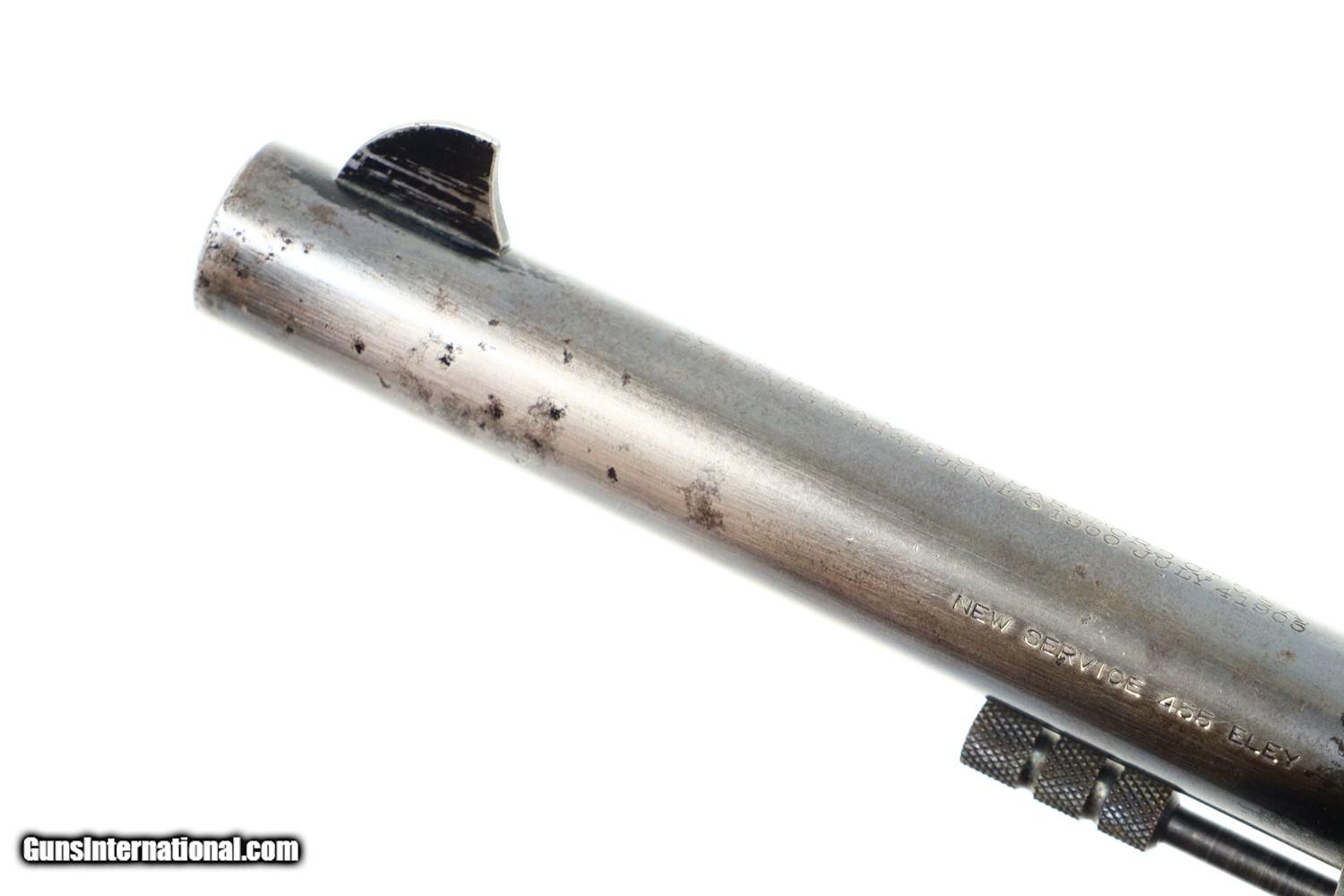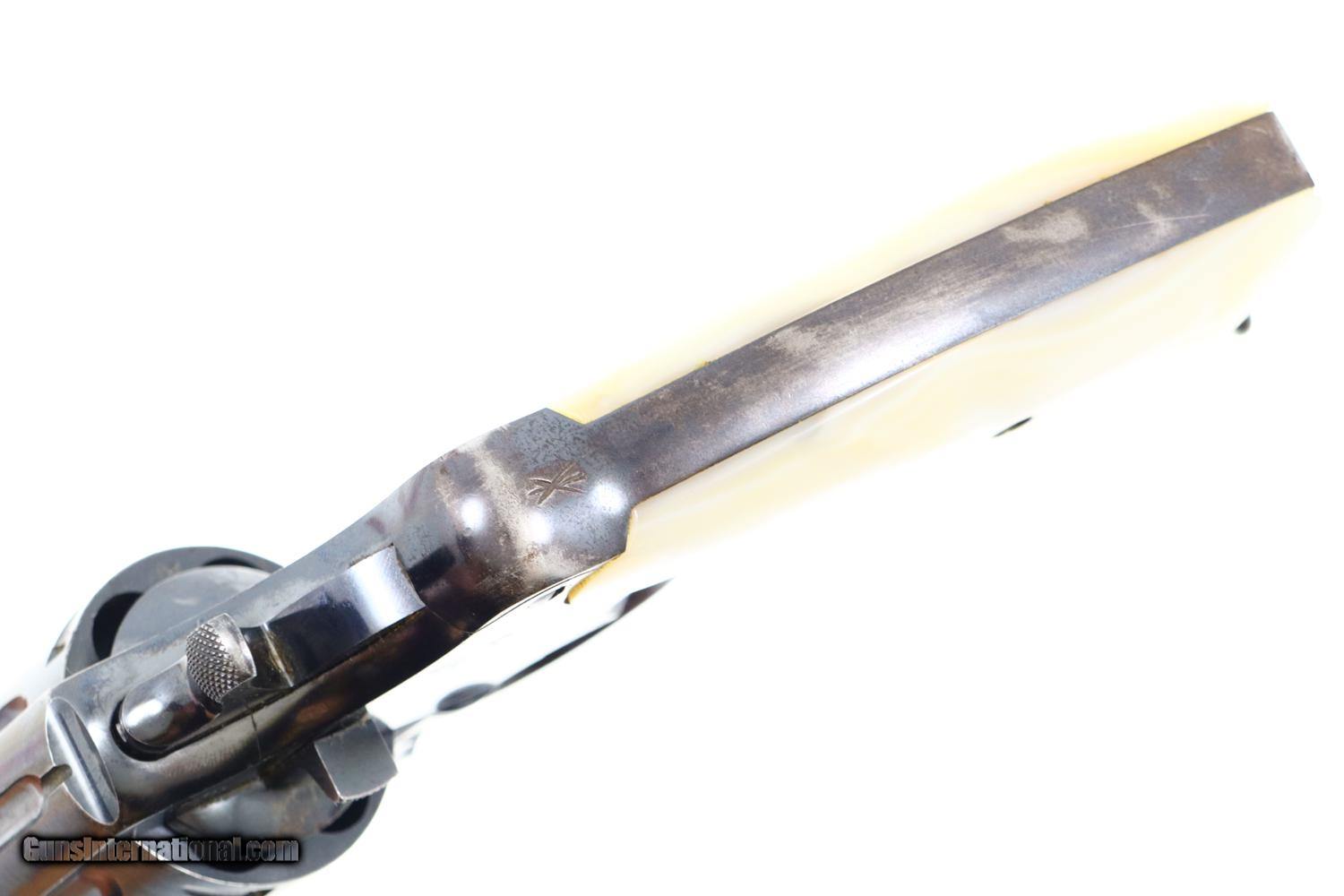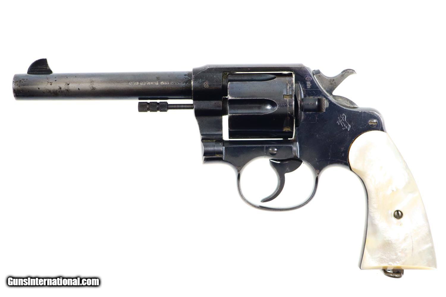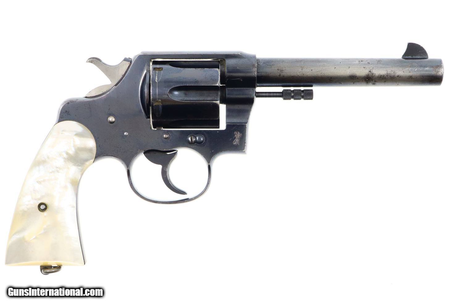 Description: Synopsis: Scarce Colt British New Service Revolver with MOP grips, .455 ELEY, 65007, FB00776 Description: Scarce Colt New Service made for England in 1914, caliber .455 ELEY, with 5.5" barrel, fixed sights, with two-line address/patent markings on top of the barrel, caliber marking on the left side of barrel, "VP" on the left trigger guard and the Rampant Colt on the sideplate. Matching serial numbers on frame and crane. Fitted with special order smooth mother-of- pearl grips. Landyard ring on butt. As typical for English revolvers, a generous scattering of British proofs on left/right/back of frame along with rear surface of cylinder. Condition: G orginal finish with the majority wear/light cleaning on barrel. Balance of pistol VG. Exc grips with no splits or chips. Cylinder indexs correctly against light resistance. Mirror bore. One of the more unusual New Service, both in caliber and with respect to the MOP grips. ~~Insured shipping fee of $55; most packages shipped using FedEx 2nd Day.~~ SOLD Curio/Relic: Yes Manufacturer: Colt Serial Number: 65007 Caliber Info: .455 ELEY |