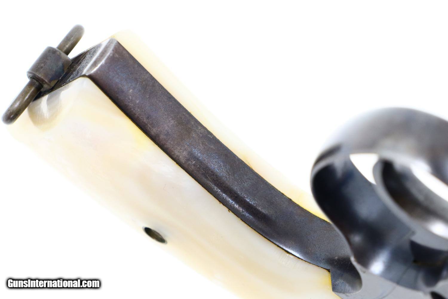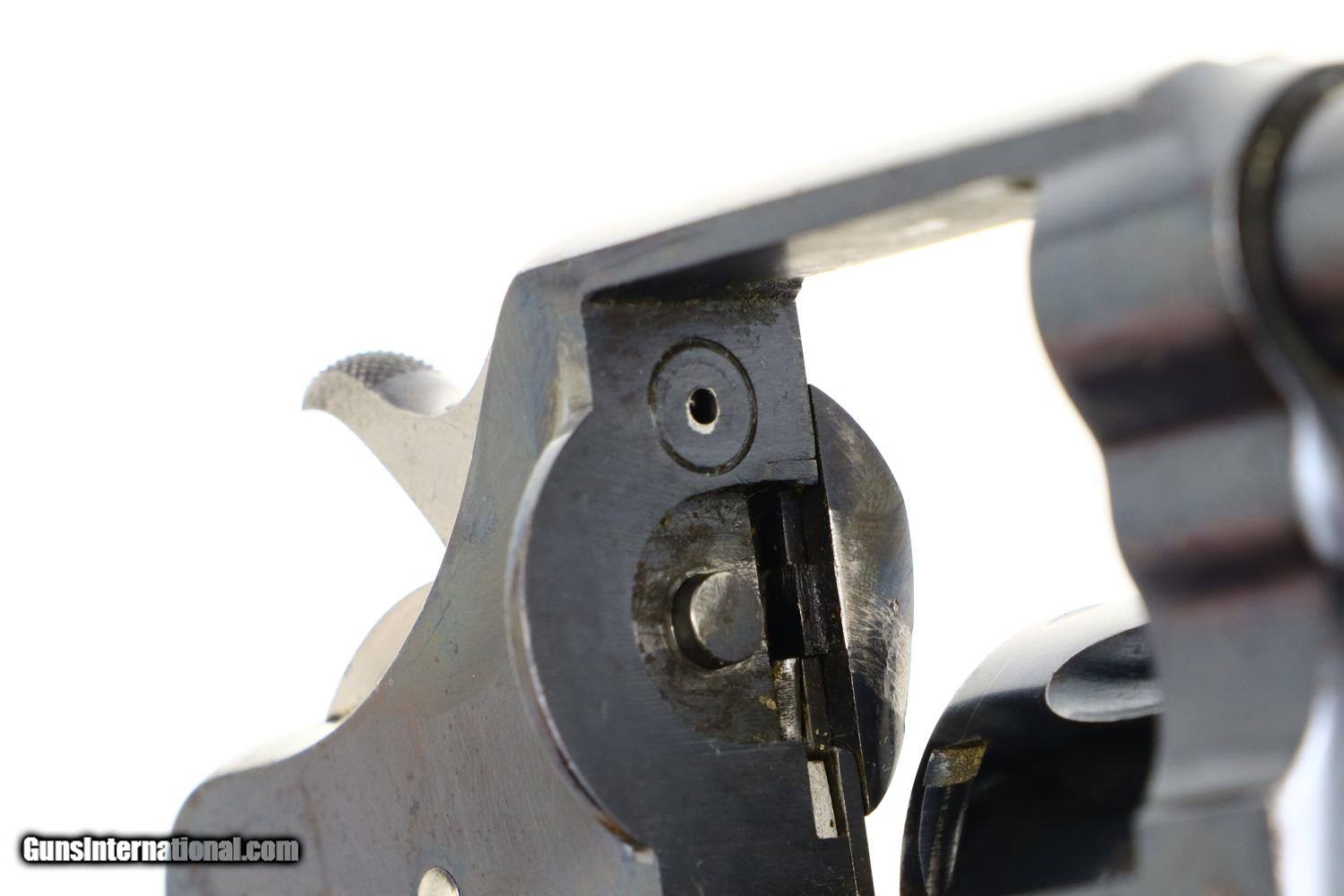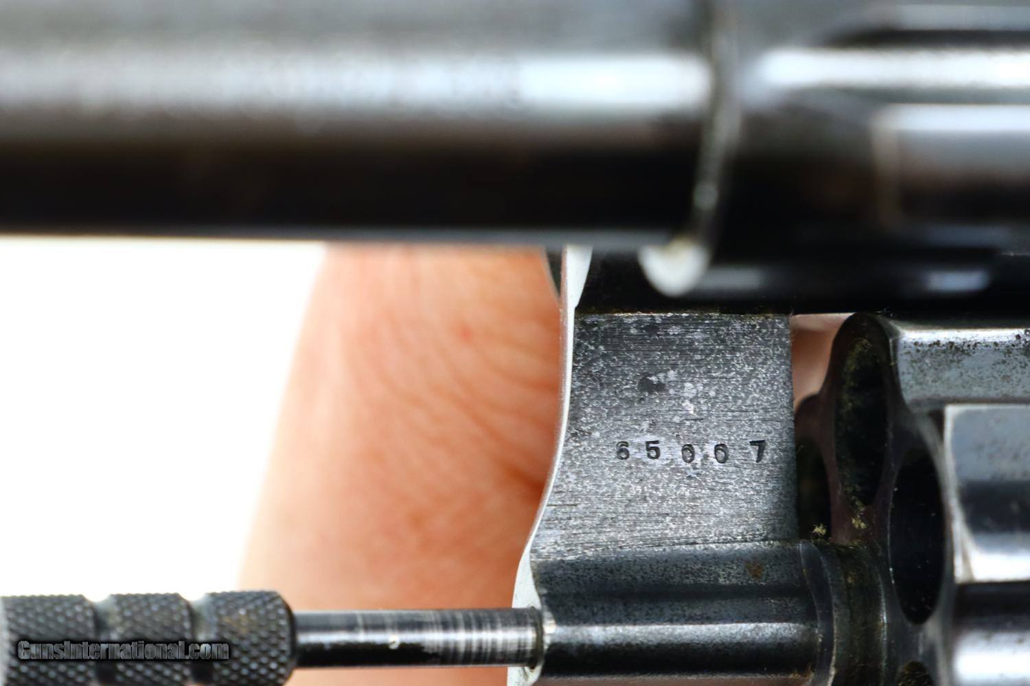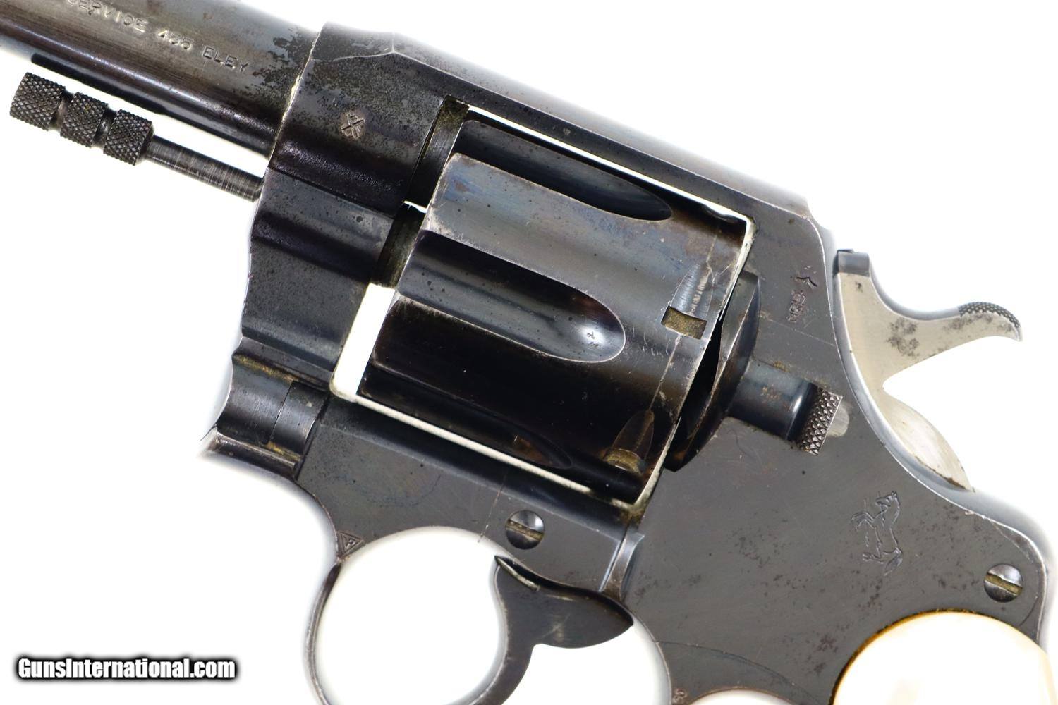 Description: Synopsis: Scarce Colt British New Service Revolver with MOP grips, .455 ELEY, 65007, FB00776 Description: Scarce Colt New Service made for England in 1914, caliber .455 ELEY, with 5.5" barrel, fixed sights, with two-line address/patent markings on top of the barrel, caliber marking on the left side of barrel, "VP" on the left trigger guard and the Rampant Colt on the sideplate. Matching serial numbers on frame and crane. Fitted with special order smooth mother-of- pearl grips. Landyard ring on butt. As typical for English revolvers, a generous scattering of British proofs on left/right/back of frame along with rear surface of cylinder. Condition: G orginal finish with the majority wear/light cleaning on barrel. Balance of pistol VG. Exc grips with no splits or chips. Cylinder indexs correctly against light resistance. Mirror bore. One of the more unusual New Service, both in caliber and with respect to the MOP grips. ~~Insured shipping fee of $55; most packages shipped using FedEx 2nd Day.~~ SOLD Curio/Relic: Yes Manufacturer: Colt Serial Number: 65007 Caliber Info: .455 ELEY |