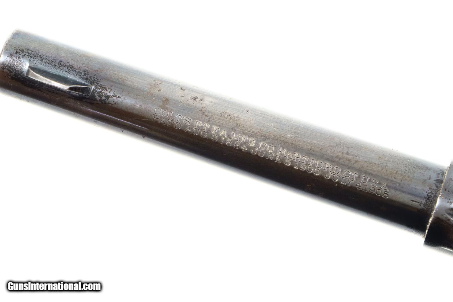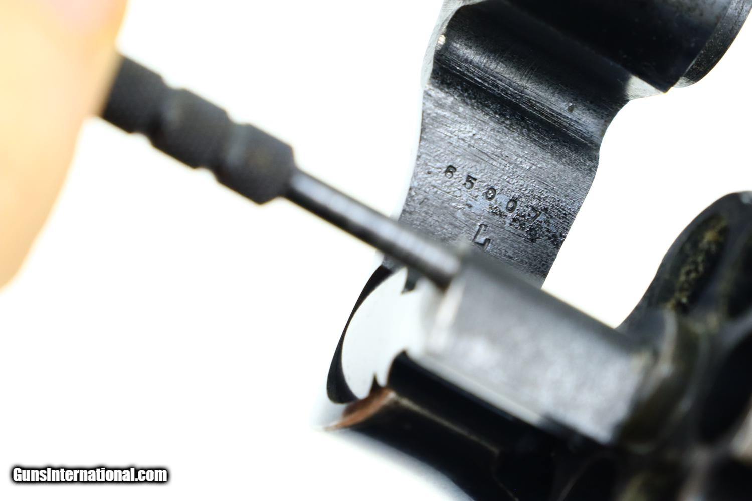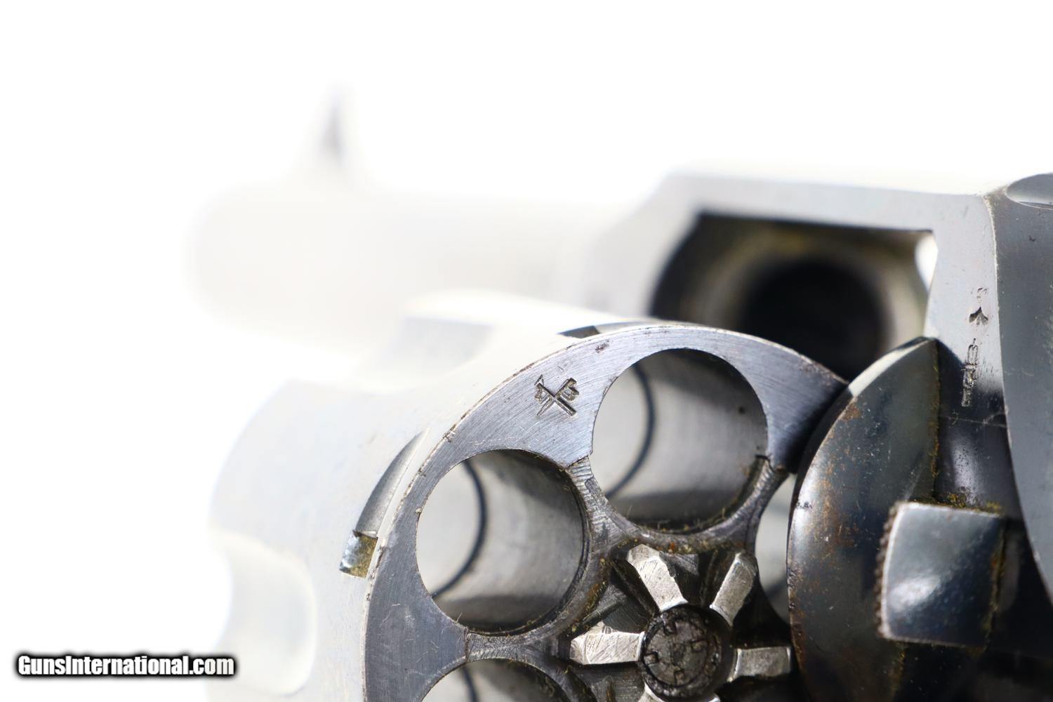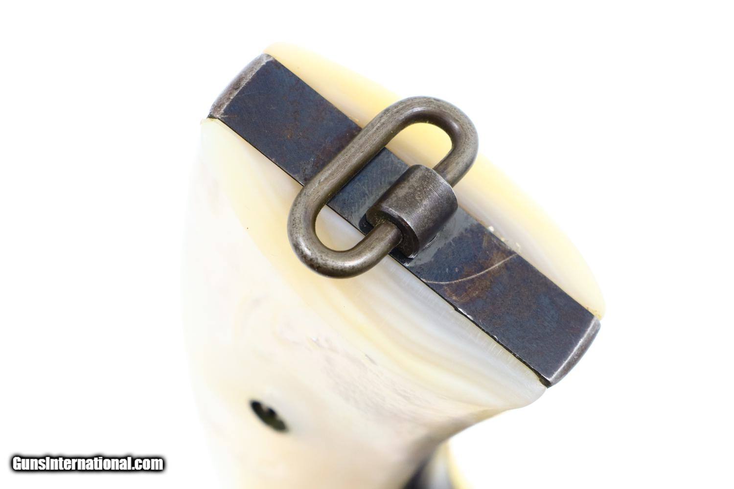 Description: Synopsis: Scarce Colt British New Service Revolver with MOP grips, .455 ELEY, 65007, FB00776 Description: Scarce Colt New Service made for England in 1914, caliber .455 ELEY, with 5.5" barrel, fixed sights, with two-line address/patent markings on top of the barrel, caliber marking on the left side of barrel, "VP" on the left trigger guard and the Rampant Colt on the sideplate. Matching serial numbers on frame and crane. Fitted with special order smooth mother-of- pearl grips. Landyard ring on butt. As typical for English revolvers, a generous scattering of British proofs on left/right/back of frame along with rear surface of cylinder. Condition: G orginal finish with the majority wear/light cleaning on barrel. Balance of pistol VG. Exc grips with no splits or chips. Cylinder indexs correctly against light resistance. Mirror bore. One of the more unusual New Service, both in caliber and with respect to the MOP grips. ~~Insured shipping fee of $55; most packages shipped using FedEx 2nd Day.~~ SOLD Curio/Relic: Yes Manufacturer: Colt Serial Number: 65007 Caliber Info: .455 ELEY |
