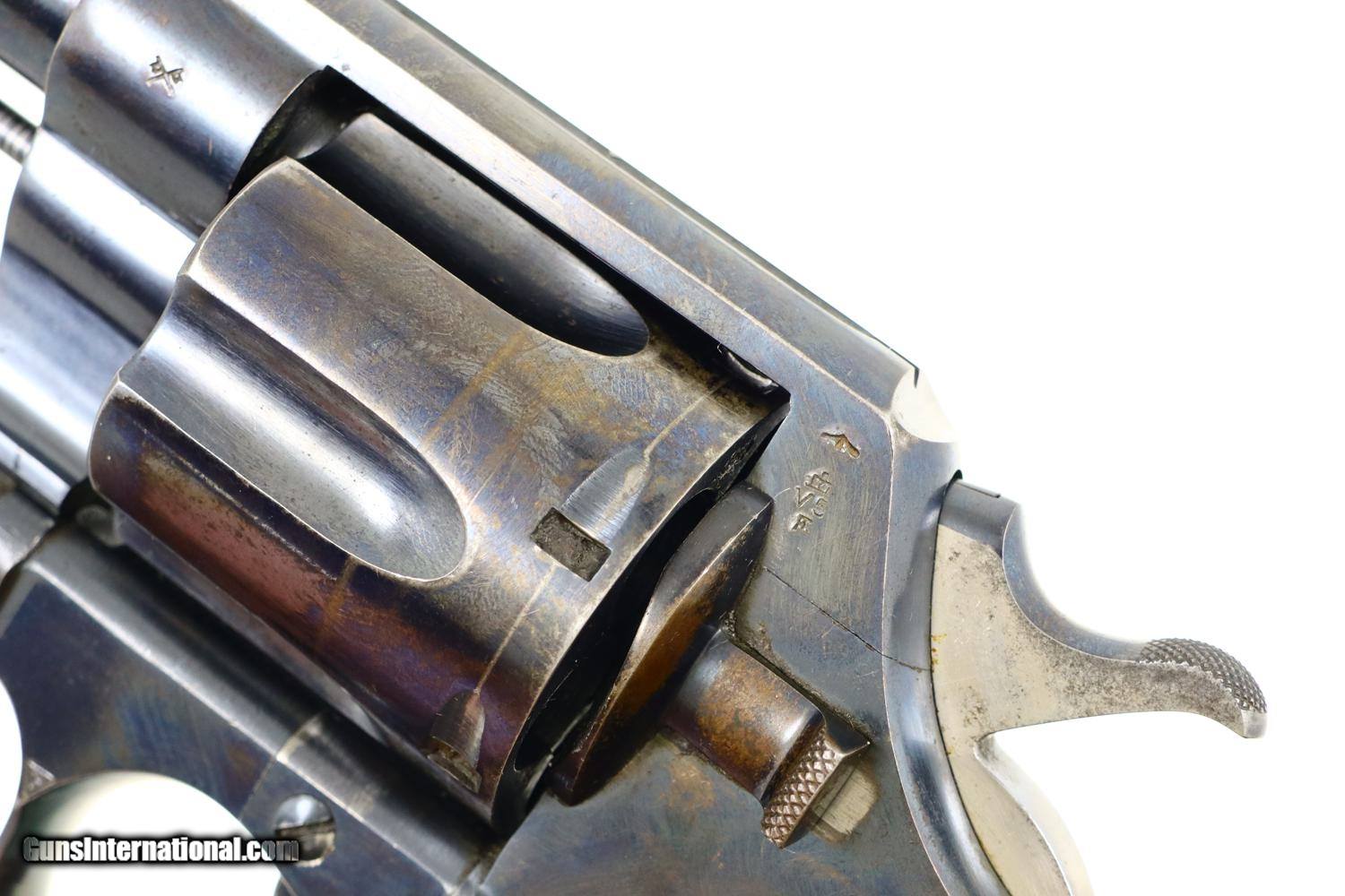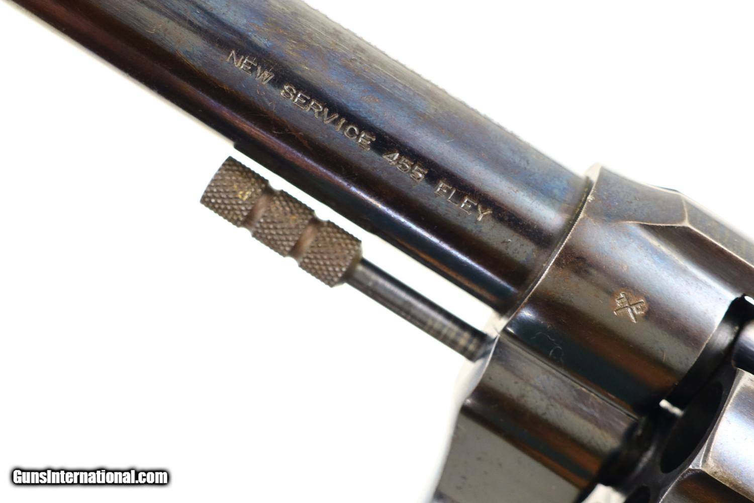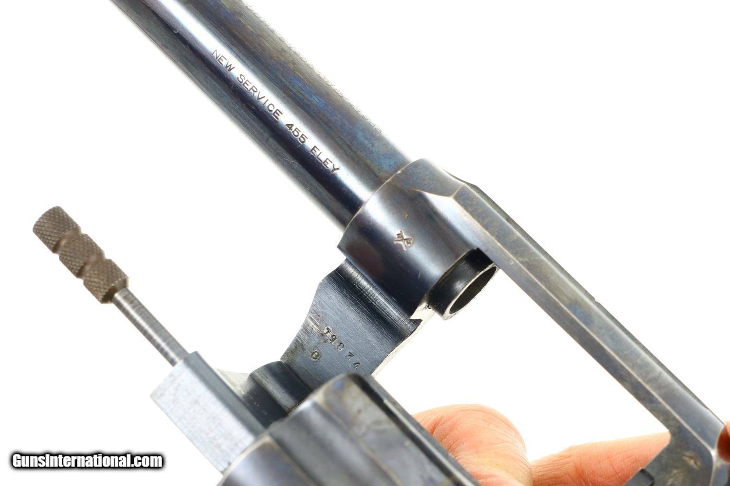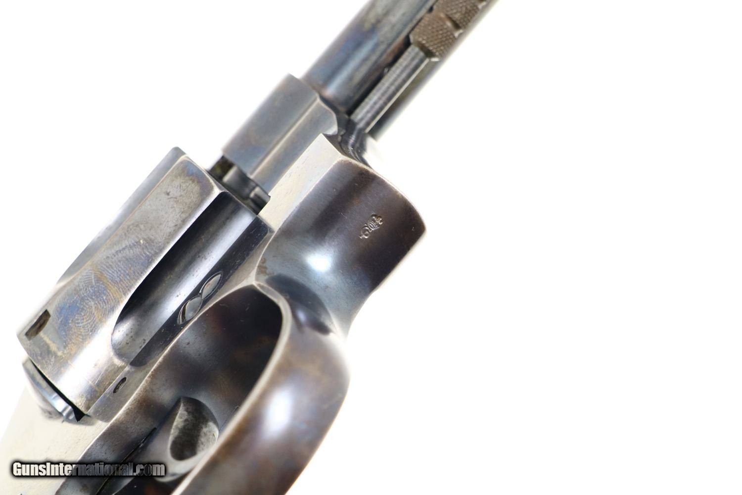 Description: Synopsis: Colt, British New Service Revolver, .455 Eley, 79834, FB00818 Description: Scarce Colt New Service made for England in 1915, caliber .455 ELEY, with 5.5? barrel, fixed sights, with two-line address/patent markings on top of the barrel, caliber marking on the left side of barrel, “VP” on the left trigger guard and the Rampant Colt on the sideplate. Matching serial numbers on frame and crane. Usual scattering of British proofs. Fitted with Colt hard rubber grips. Landyard ring on butt. Condition: VG+ orginal finish with scattered handling marks and flecking as one might expect from a revolver of this era that has seen light use. Near excellent original grips. Cylinder indexes correctly against light resistance. Mirror bore. A very nice all original, no excuse, Colt New Service Revolver in the somewhat scarce .455 Eley caliber. ~~Insured shipping fee of $55; most packages shipped using FedEx 2nd Day.~~ SOLD Manufacturer: Colt Serial Number: 79834 Caliber Info: .455 ELEY |