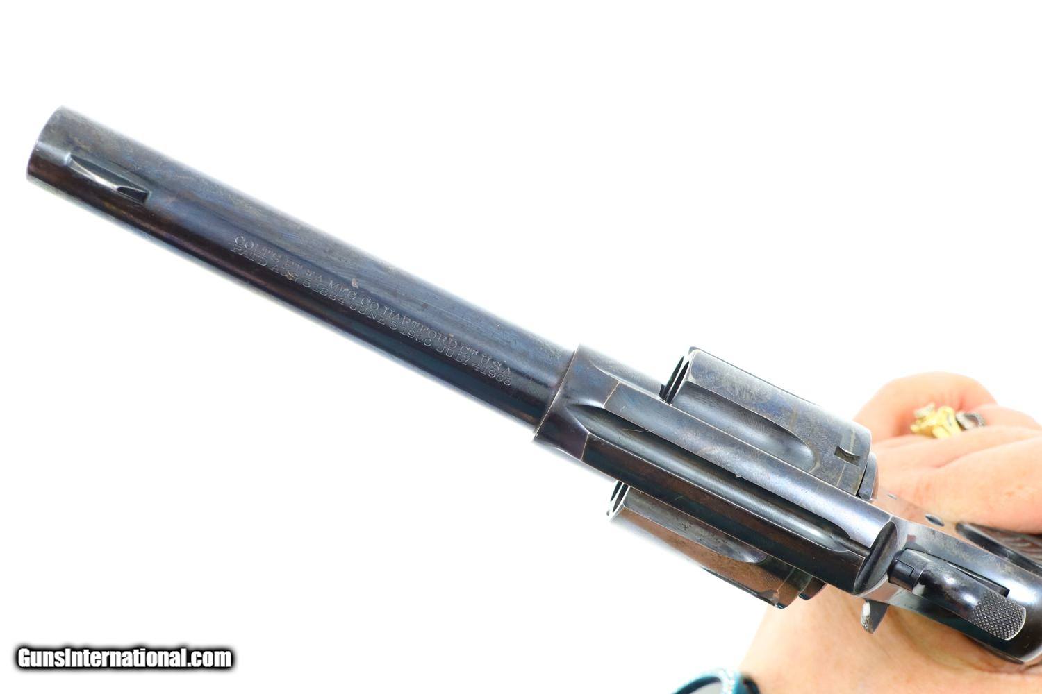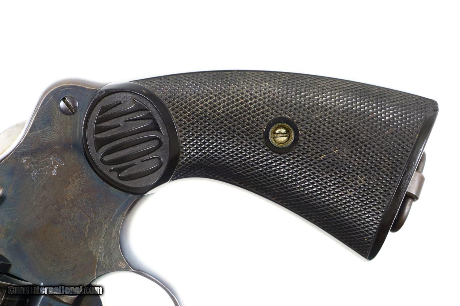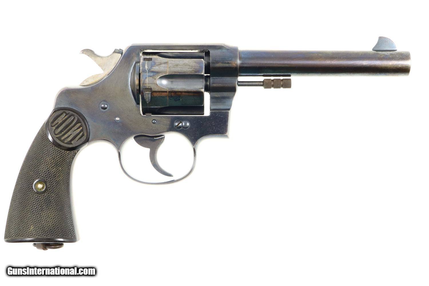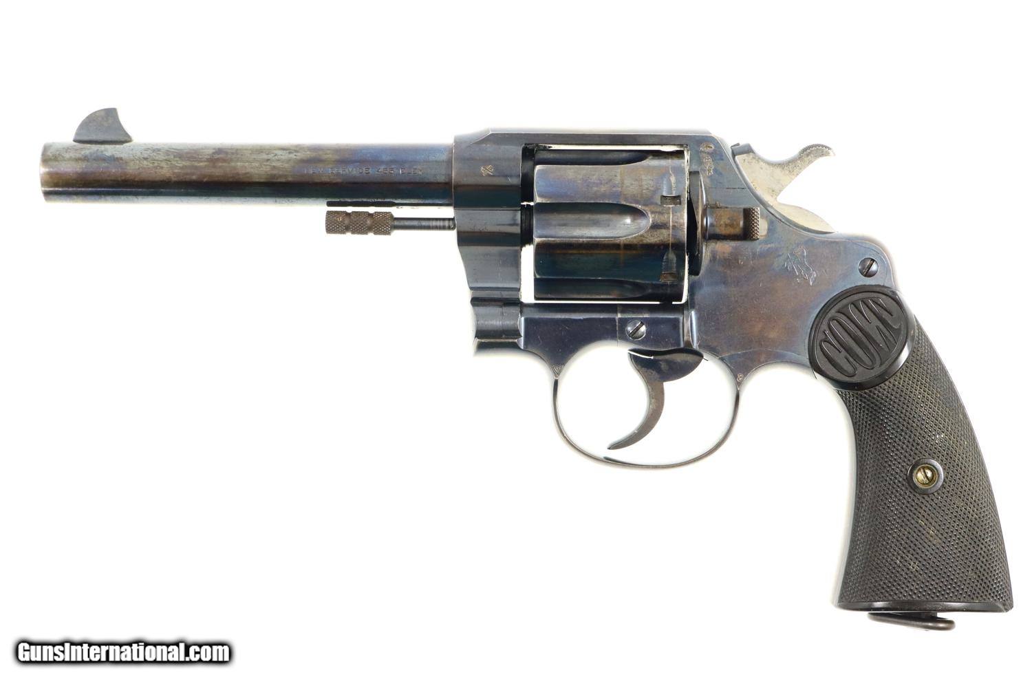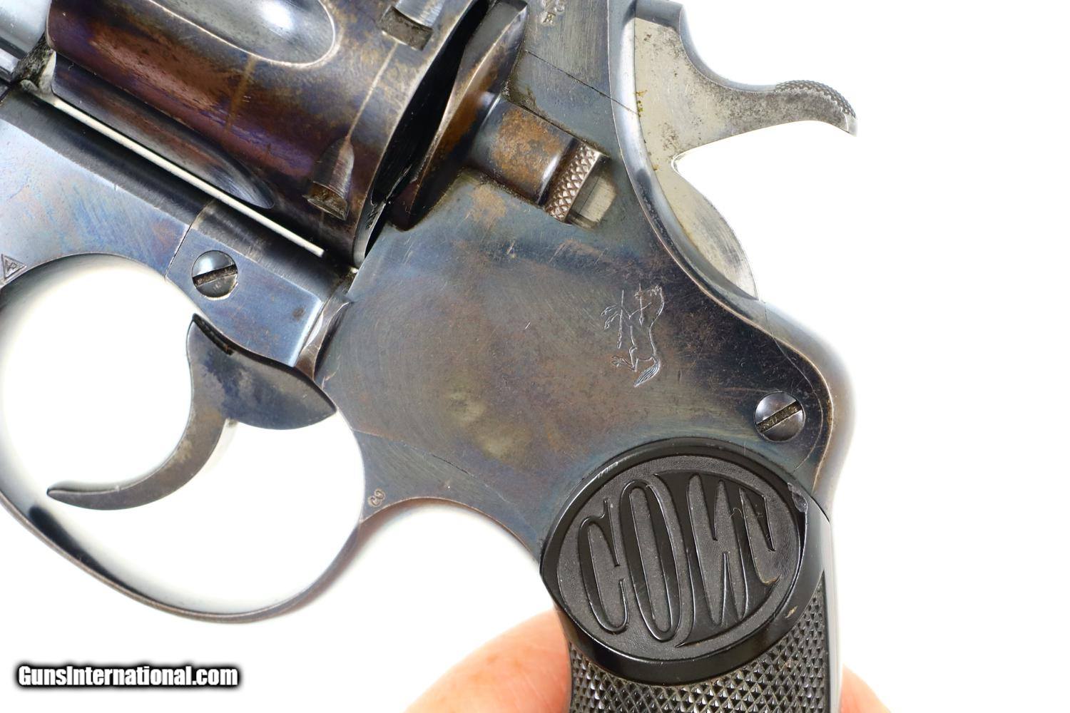 Description: Synopsis: Colt, British New Service Revolver, .455 Eley, 79834, FB00818 Description: Scarce Colt New Service made for England in 1915, caliber .455 ELEY, with 5.5? barrel, fixed sights, with two-line address/patent markings on top of the barrel, caliber marking on the left side of barrel, “VP” on the left trigger guard and the Rampant Colt on the sideplate. Matching serial numbers on frame and crane. Usual scattering of British proofs. Fitted with Colt hard rubber grips. Landyard ring on butt. Condition: VG+ orginal finish with scattered handling marks and flecking as one might expect from a revolver of this era that has seen light use. Near excellent original grips. Cylinder indexes correctly against light resistance. Mirror bore. A very nice all original, no excuse, Colt New Service Revolver in the somewhat scarce .455 Eley caliber. ~~Insured shipping fee of $55; most packages shipped using FedEx 2nd Day.~~ SOLD Manufacturer: Colt Serial Number: 79834 Caliber Info: .455 ELEY |