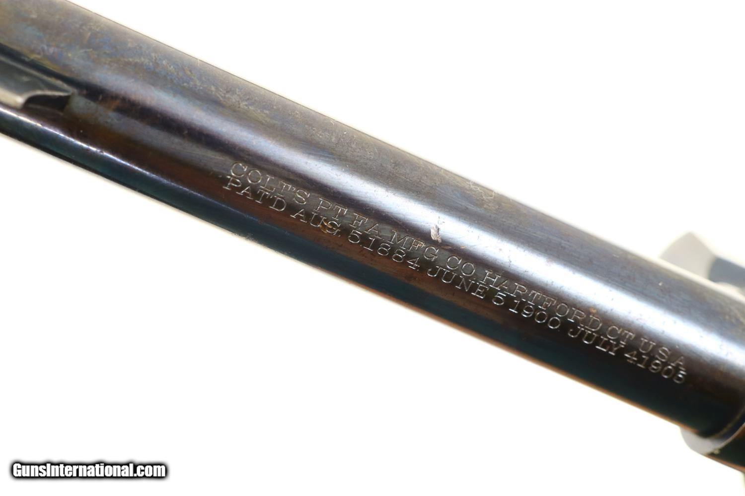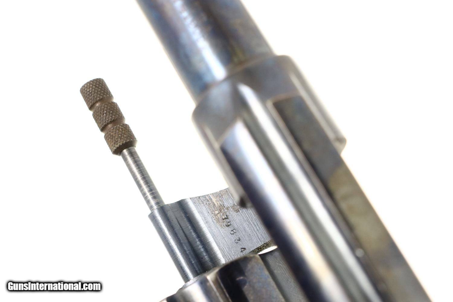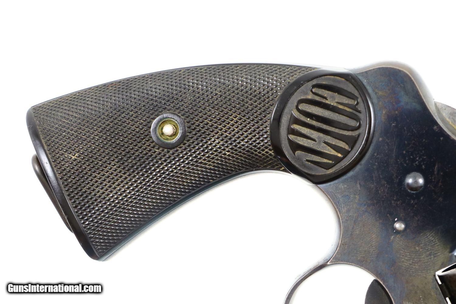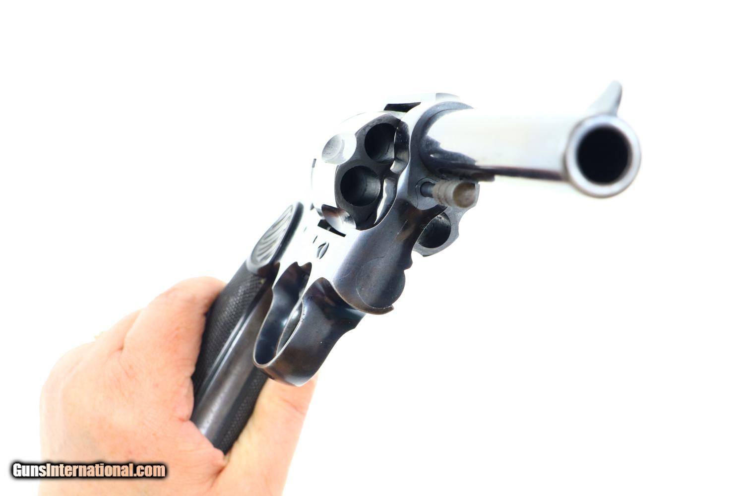 Description: Synopsis: Colt, British New Service Revolver, .455 Eley, 79834, FB00818 Description: Scarce Colt New Service made for England in 1915, caliber .455 ELEY, with 5.5? barrel, fixed sights, with two-line address/patent markings on top of the barrel, caliber marking on the left side of barrel, “VP” on the left trigger guard and the Rampant Colt on the sideplate. Matching serial numbers on frame and crane. Usual scattering of British proofs. Fitted with Colt hard rubber grips. Landyard ring on butt. Condition: VG+ orginal finish with scattered handling marks and flecking as one might expect from a revolver of this era that has seen light use. Near excellent original grips. Cylinder indexes correctly against light resistance. Mirror bore. A very nice all original, no excuse, Colt New Service Revolver in the somewhat scarce .455 Eley caliber. ~~Insured shipping fee of $55; most packages shipped using FedEx 2nd Day.~~ SOLD Manufacturer: Colt Serial Number: 79834 Caliber Info: .455 ELEY |