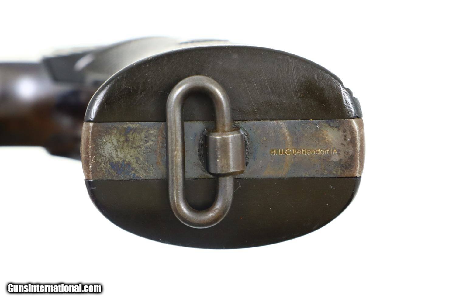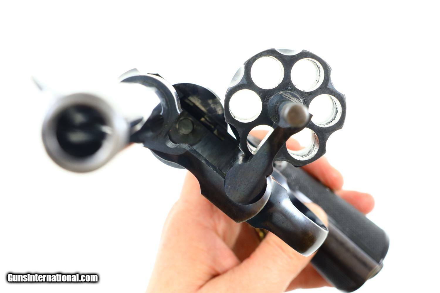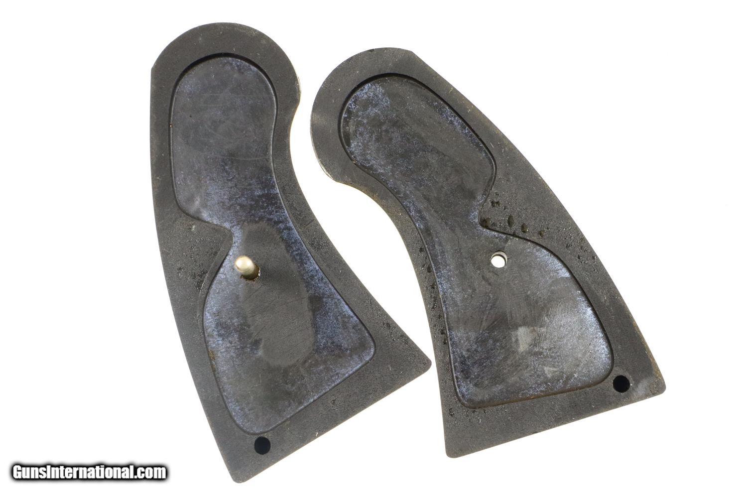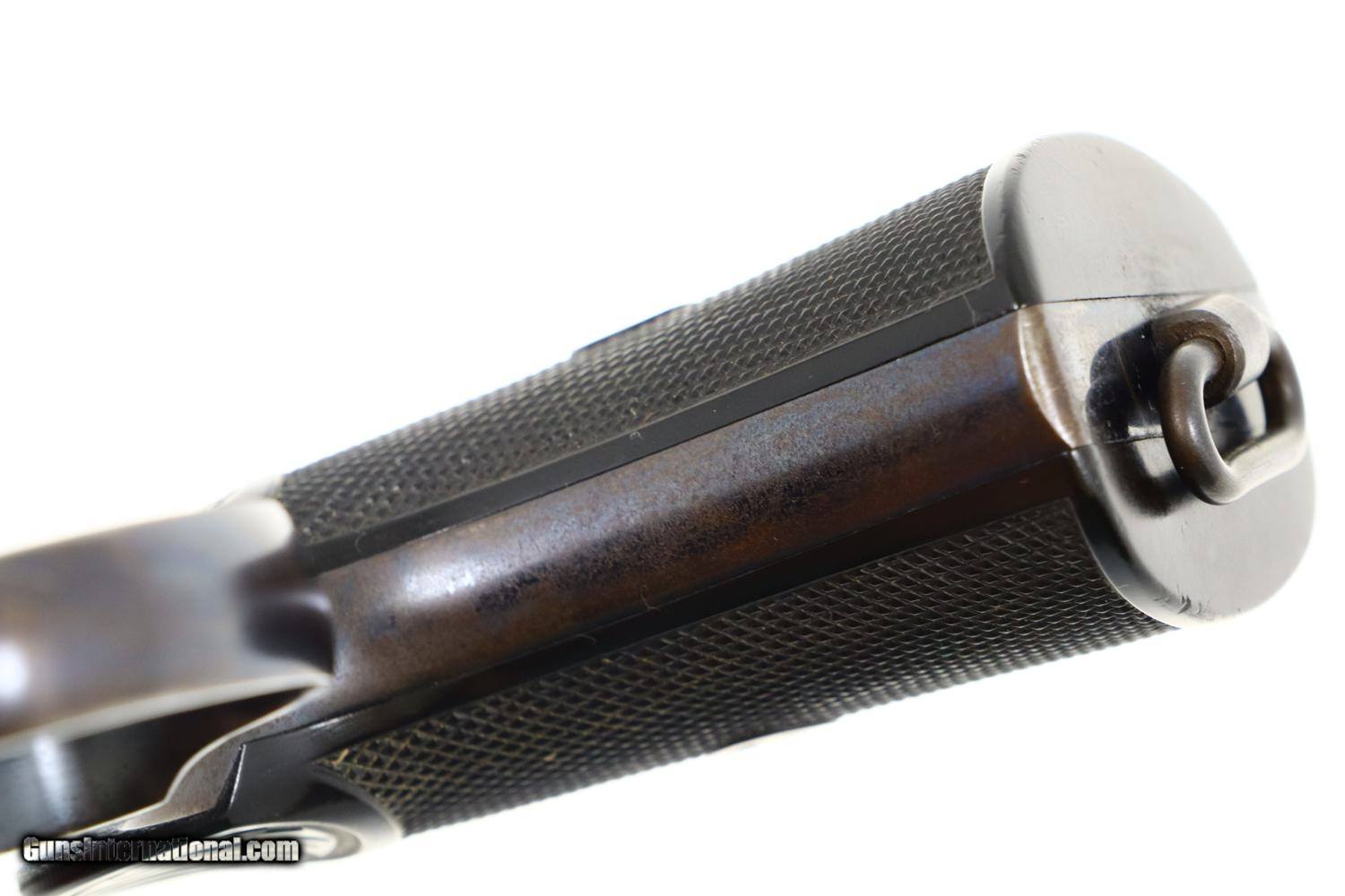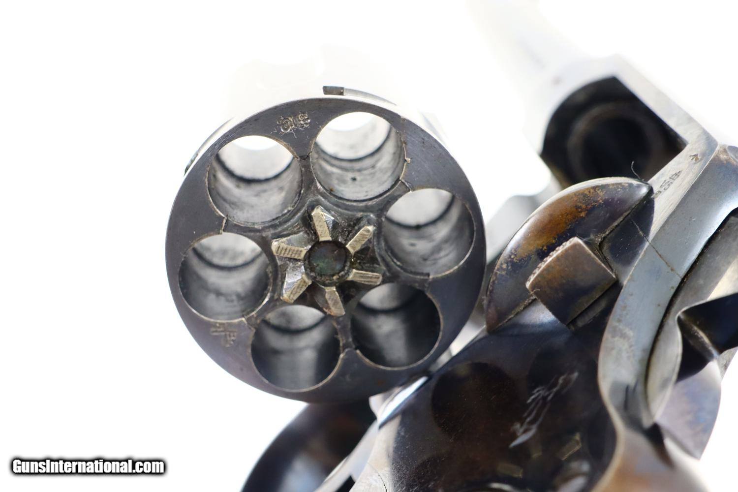 Description: Synopsis: Colt, British New Service Revolver, .455 Eley, 79834, FB00818 Description: Scarce Colt New Service made for England in 1915, caliber .455 ELEY, with 5.5? barrel, fixed sights, with two-line address/patent markings on top of the barrel, caliber marking on the left side of barrel, “VP” on the left trigger guard and the Rampant Colt on the sideplate. Matching serial numbers on frame and crane. Usual scattering of British proofs. Fitted with Colt hard rubber grips. Landyard ring on butt. Condition: VG+ orginal finish with scattered handling marks and flecking as one might expect from a revolver of this era that has seen light use. Near excellent original grips. Cylinder indexes correctly against light resistance. Mirror bore. A very nice all original, no excuse, Colt New Service Revolver in the somewhat scarce .455 Eley caliber. ~~Insured shipping fee of $55; most packages shipped using FedEx 2nd Day.~~ SOLD Manufacturer: Colt Serial Number: 79834 Caliber Info: .455 ELEY |