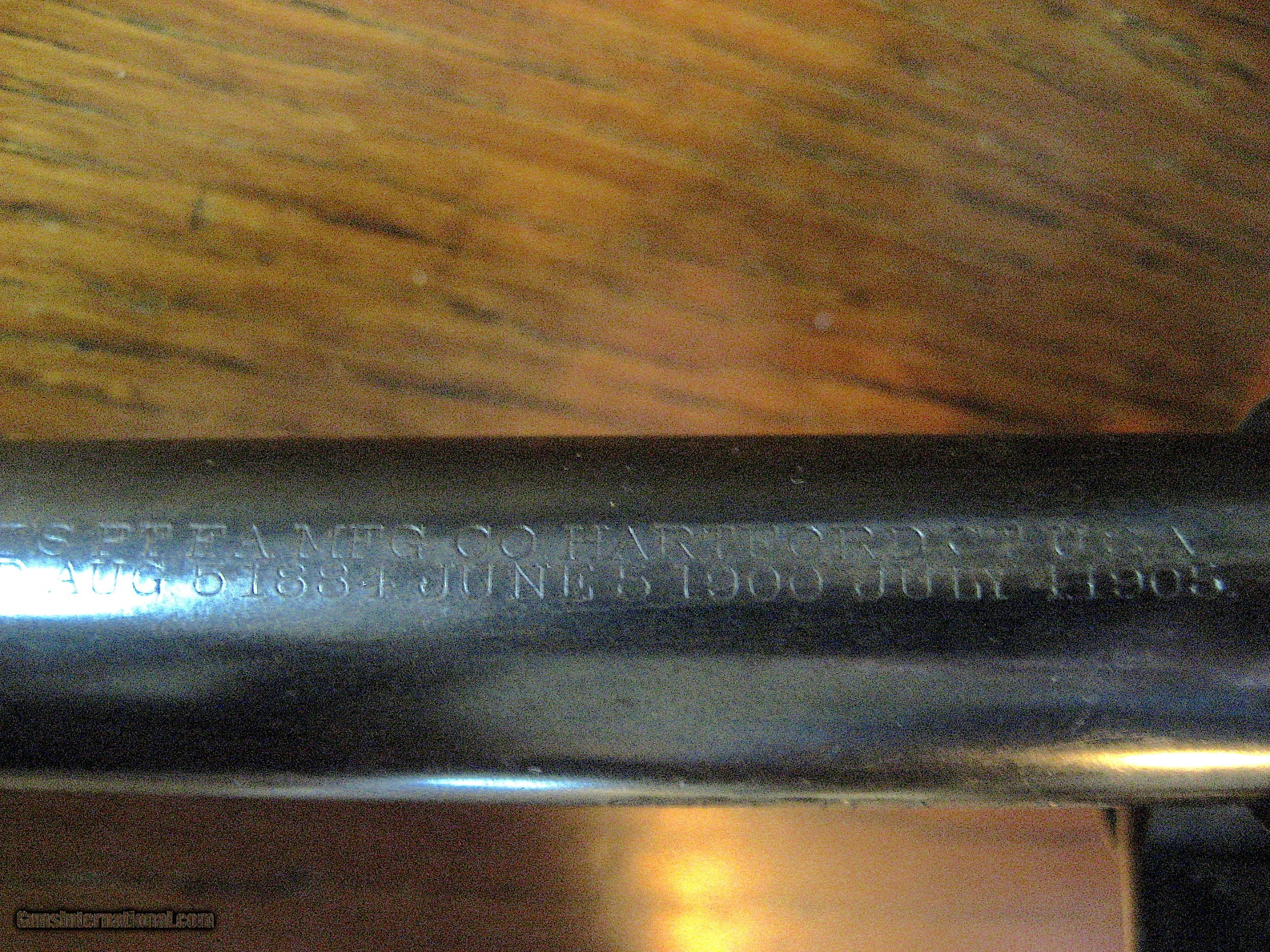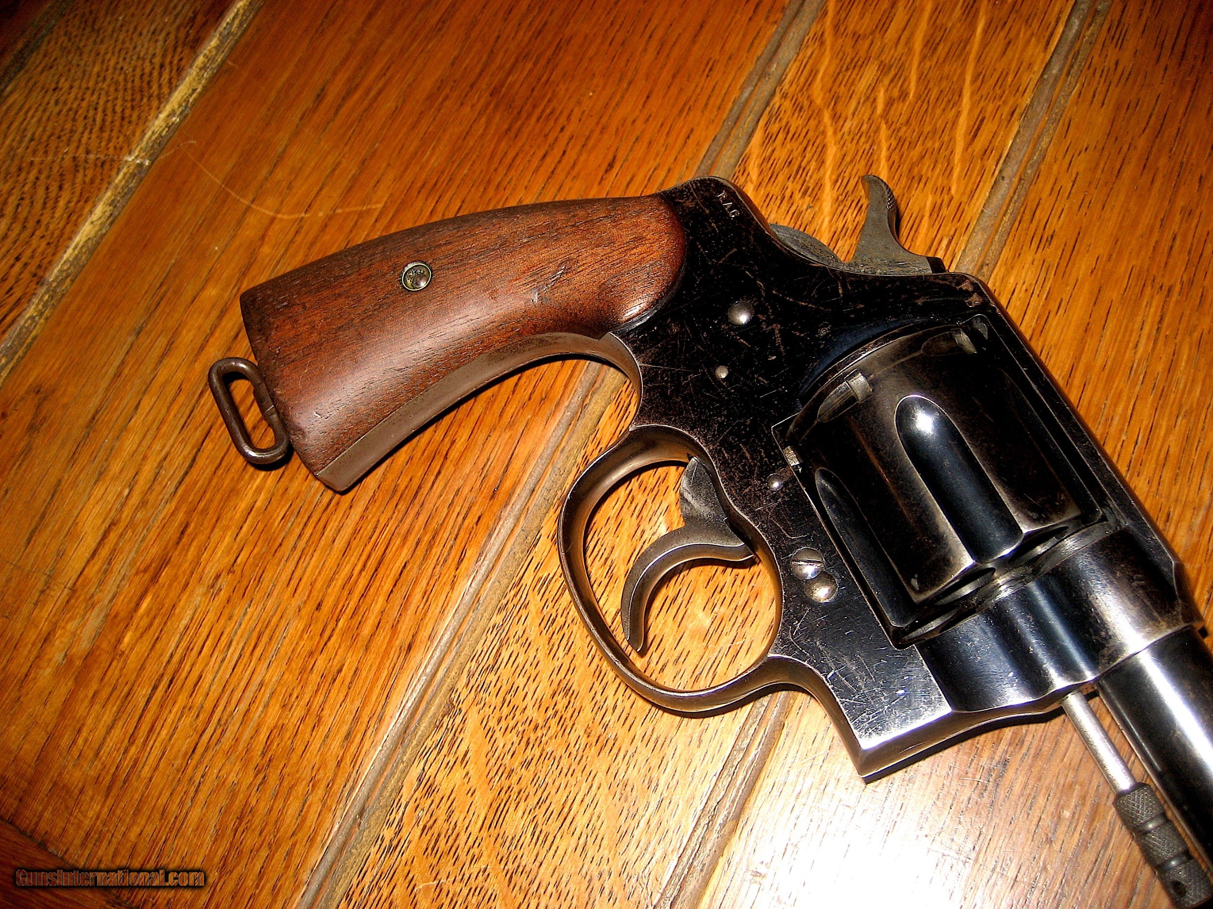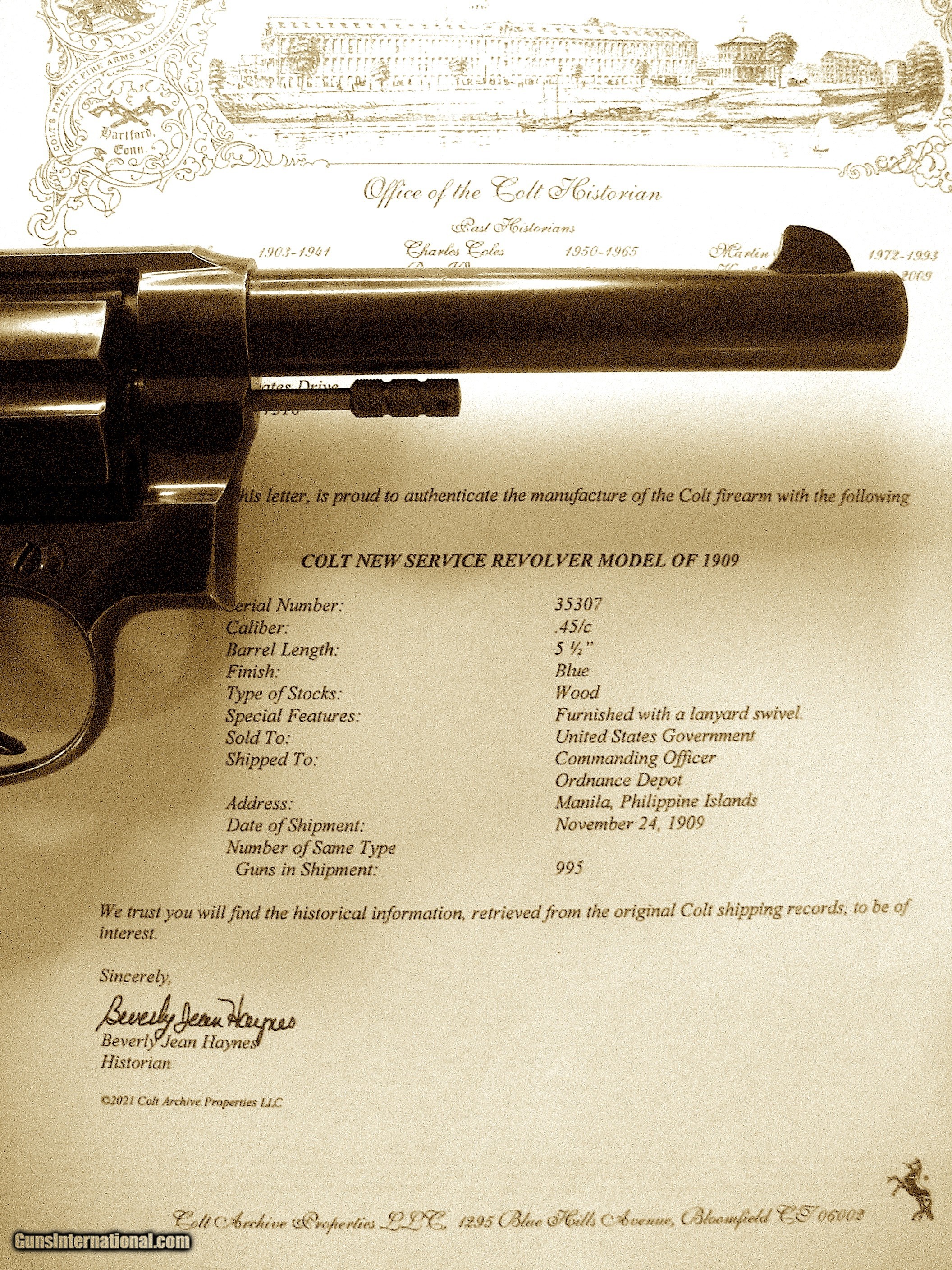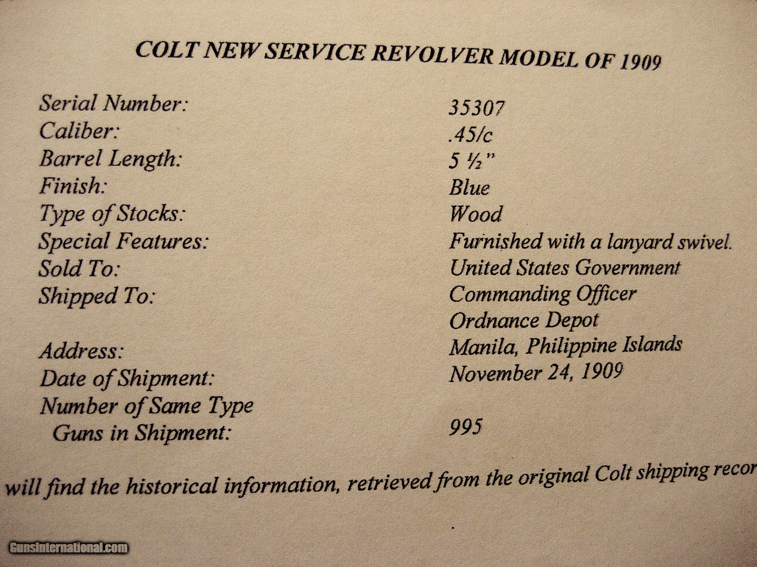 Description: Colt Model 1909 .45 Colt Revolver - 1909 historically significant US to Philippines shipment to change military sidearms from .38 to .45 caliber. Marked on grip butt US Army Model 1909 No 35307. Marked by inspector RAC. 35307 also on frame and swing out arm and revolver grip butt. Very Rare. Proof of provenance: Accompanying signed and embossed archive letter from Colt Archives, Office of the Colt Historian stating: "United States Government, Commanding Officer, Ordnance Depot, Manila, Philippine Islands, November 24, 1909. Number of guns in shipment, 995 . The Philippine Moro Rebellion after the Spanish American War demonstrated factually that the .38 Colt was an unsatisfactory man stopper. The Moros would take a cylinder of .38 Colt’s and keep on coming. With the result that many American soldiers were either seriously wounded or killed by the Moro’s knives. The Army replaced the .38’s with .45’s. One of the .45 rounds often did what six of the .38 Colt’s bullets could not do - stop a charging Moro cold. The War Department placed initial orders for 6000 New Service revolvers Caliber .45, on December, 17 1908. They were officially designated as "Colt's Double-Action Revolver, Caliber .45, Model of 1909". The marking "U.S. ARMY MODEL 1909, N0. 35307. The serial number marked on the butt was the same number was stamped under the crane on the receiver as well as on the frame. The cylinder latch was marked on the rear with the last 4 digits of the serial number. The stocks were hand numbered inside as well as marked on the butt with the inspectors initials "RAC" (Renaldo A. Carr.) The right side of the receiver was also marked with the initials of the inspector RAC. Additional orders were placed in 1910 and 1911 for a grand total of 19,503 pistols. The pistols were serial numbered from 30001 through 49503. This one is number 35307. Bore very lightly frosted and still strong riflings. Grips generally good with a couple of small nicks. Zelle, cashiers check, money order or personal check accepted. Layaway is four equal payments with no credit charge then ship. SOLD Curio/Relic: Yes Handgun Caliber: .45 Colt Manufacturer: Colt Model: 1909 Serial Number: 35307 |