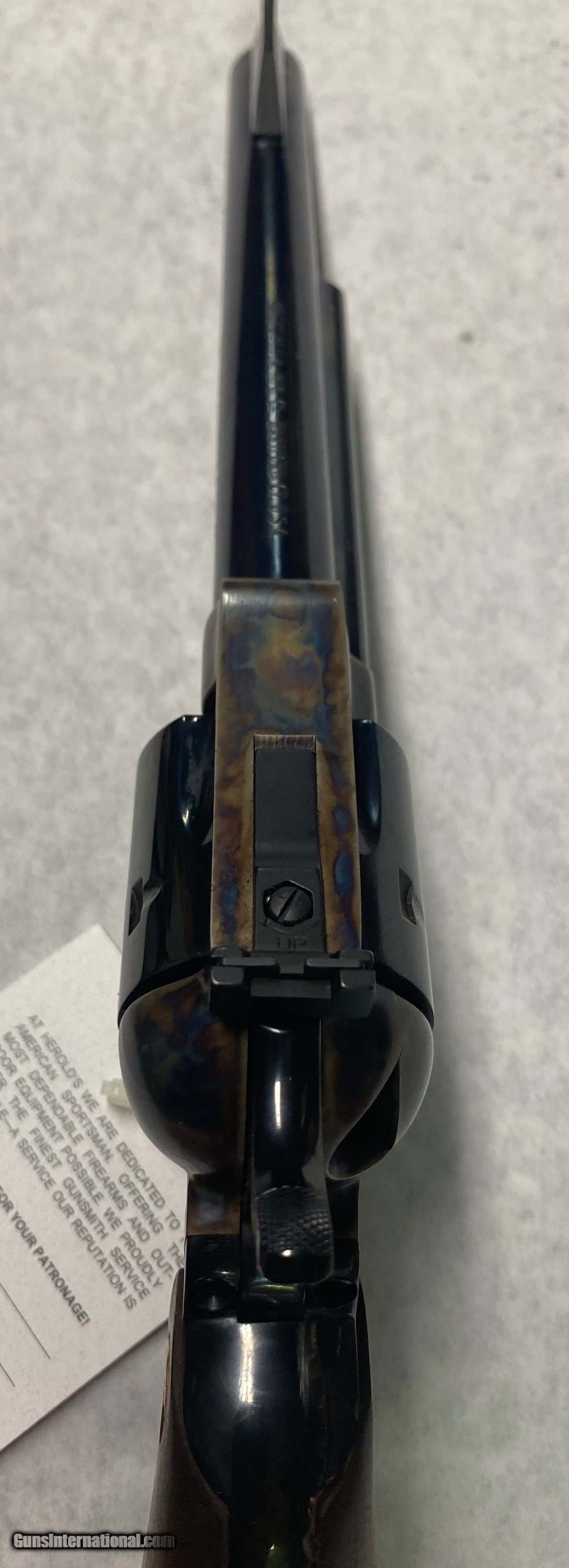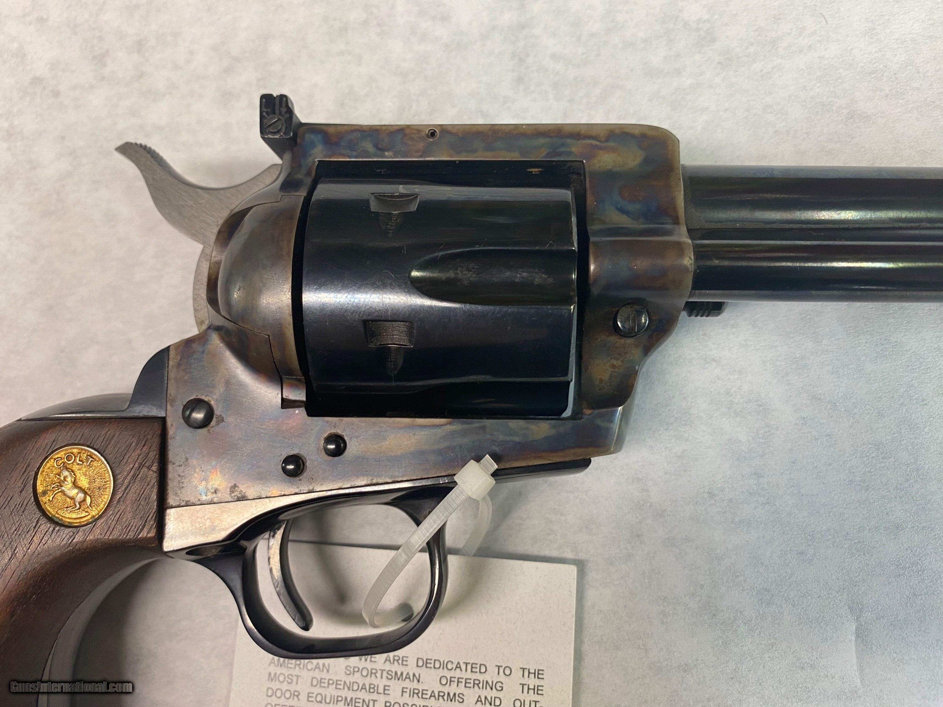 Description: Another Colt New Frontier Single Action Army revolver in 45 Long Colt has come into the shop recently. This one is in 90% condition w/a few very small scratches on the back strap & a light dragline on the cylinder. Has a 7 1/2" barrel and according to the serial number, this SAA was manufactured in 1980. Please see pictures for more details. $2195 plus $30 shipping. We accept major credit cards with a 4% fee. Personal checks are also welcome (no fee added) however, we do not ship the item until your check clears our bank. Business hours are Tuesday through Saturday, 9 AM to 5 PM. Closed on Sunday and Monday as well as some federal holidays. We are a brick and mortar store in business at the same location for more than two decades. If you're ever in the Waynesboro, PA area, stop on by and check out our extensive selection of vintage and modern firearms plus accessories at George Herold's Gun Shoppe. We look forward to seeing you! Handgun Caliber: .45 Colt Manufacturer: Colt Model: New Frontier Single Action Army Serial Number: 10846NT Barrel Length: 7 1/2” Condition: 90% or better. Price: $2,195.00 Shipping: $30.00 Contact Seller |