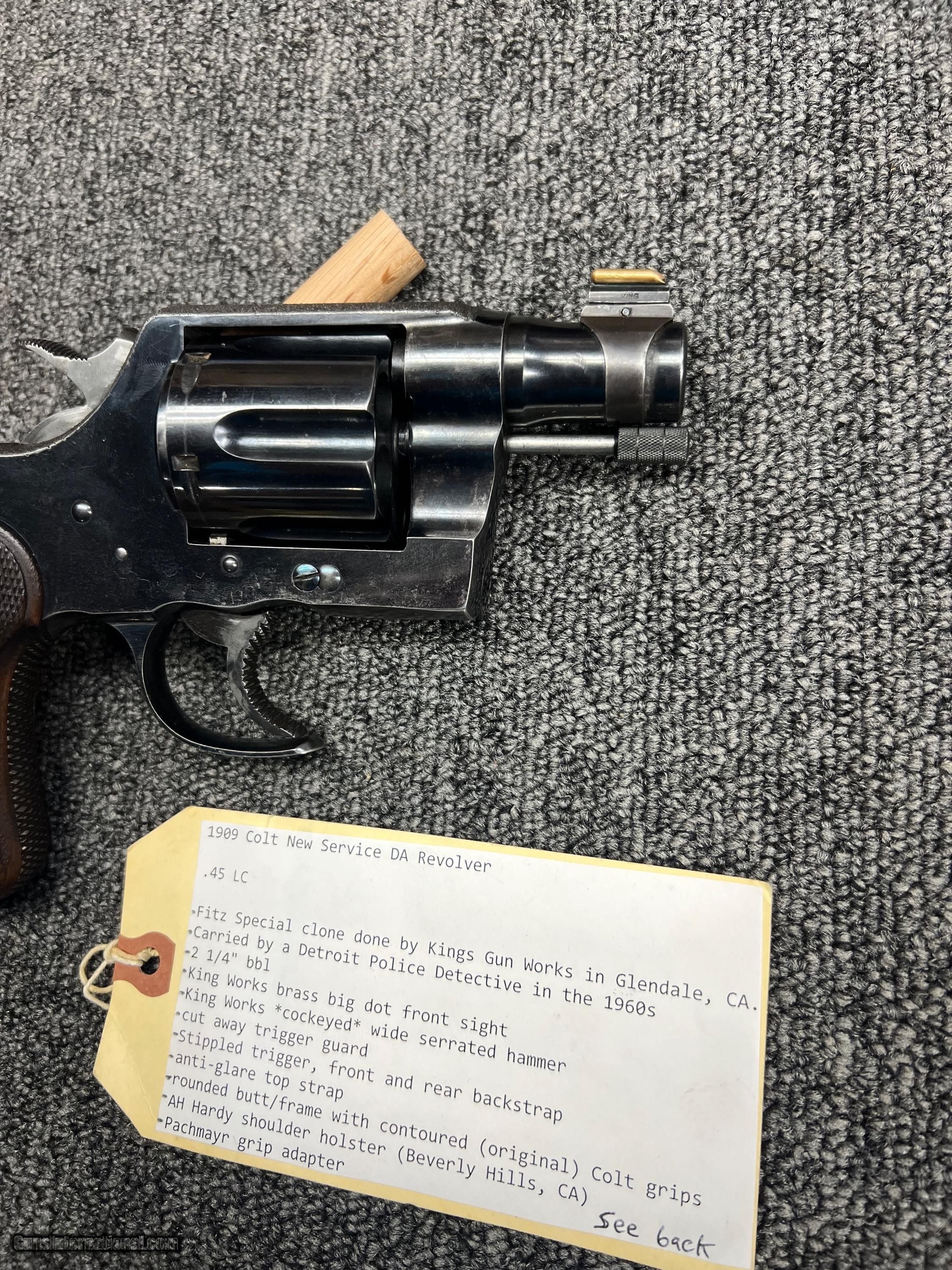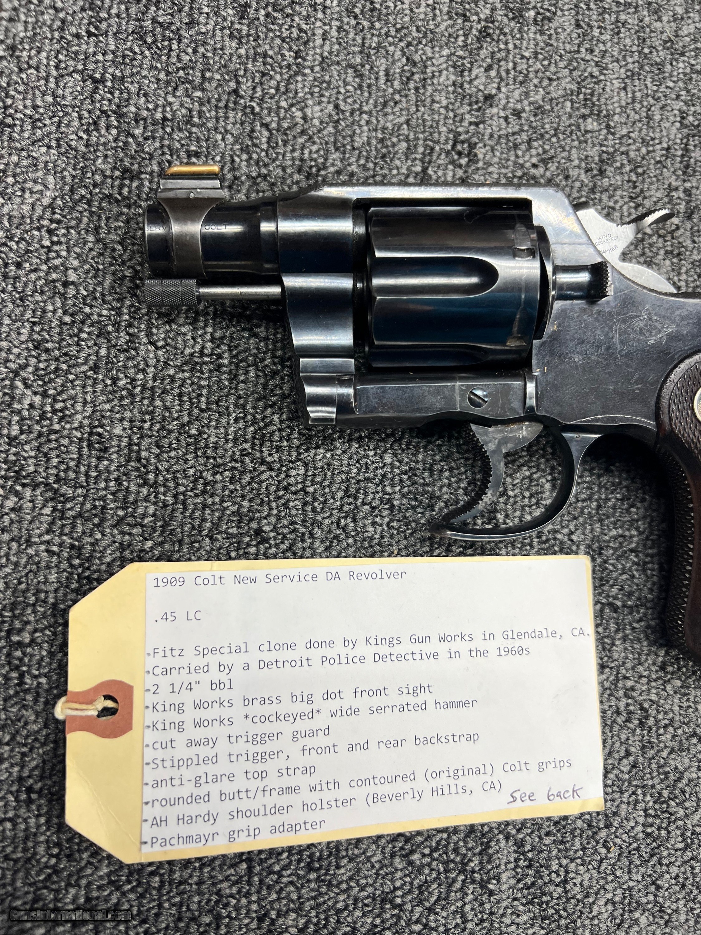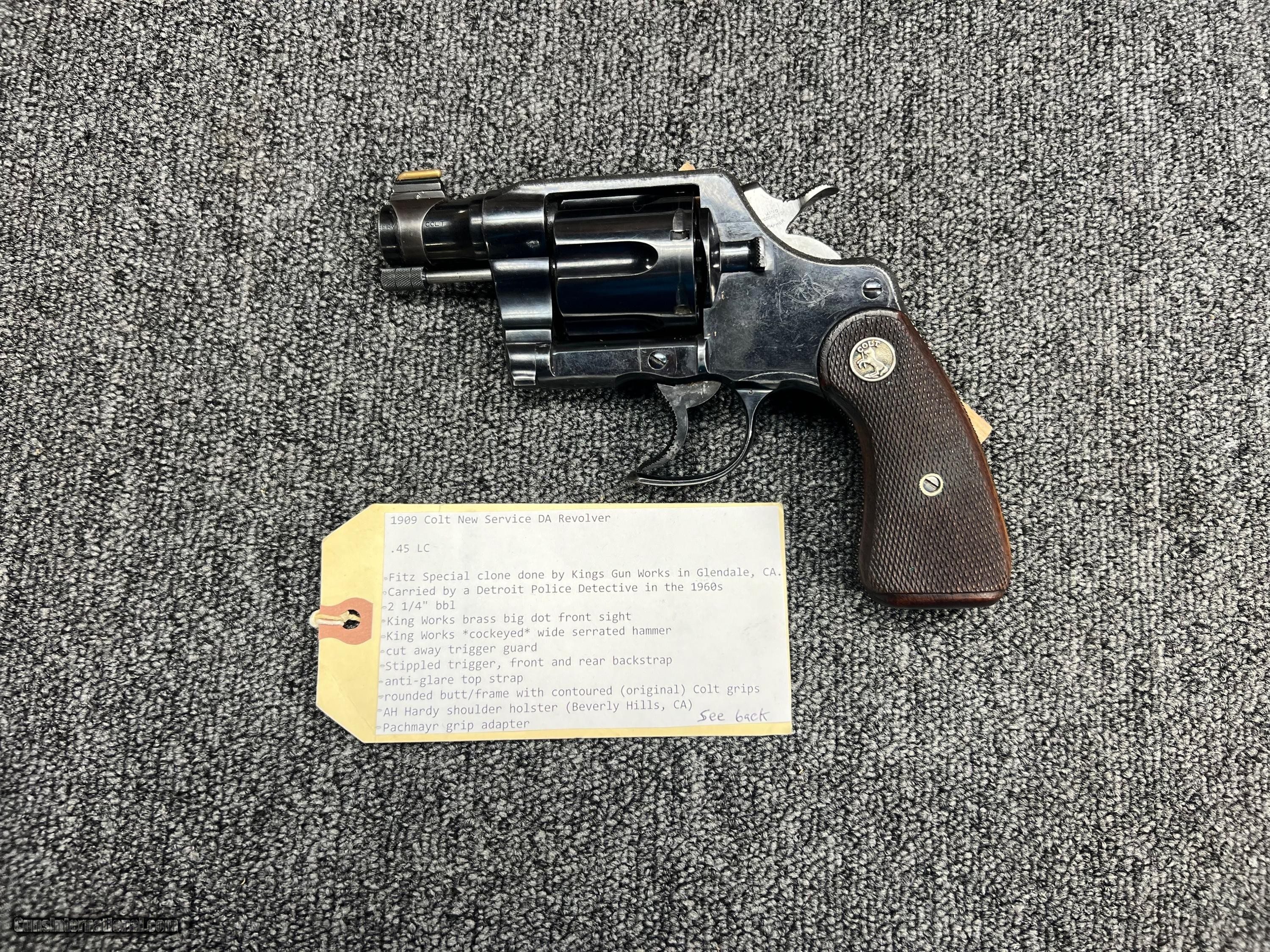 Description: This is a unique Colt new service DA revolver in .45 long colt. It is a "Fitz special" clone with all work performed by Kings Gun Works in California. This particular gun was carried by Detroit, MI police detective in the 1960's. See card in oicture for more info. Consifnment sale. $2400...buyer pays shipping and insurance ***NO CREDIT CARD FEES*** Handgun Caliber: .45 Colt Price: $2,400.00 Contact Seller |