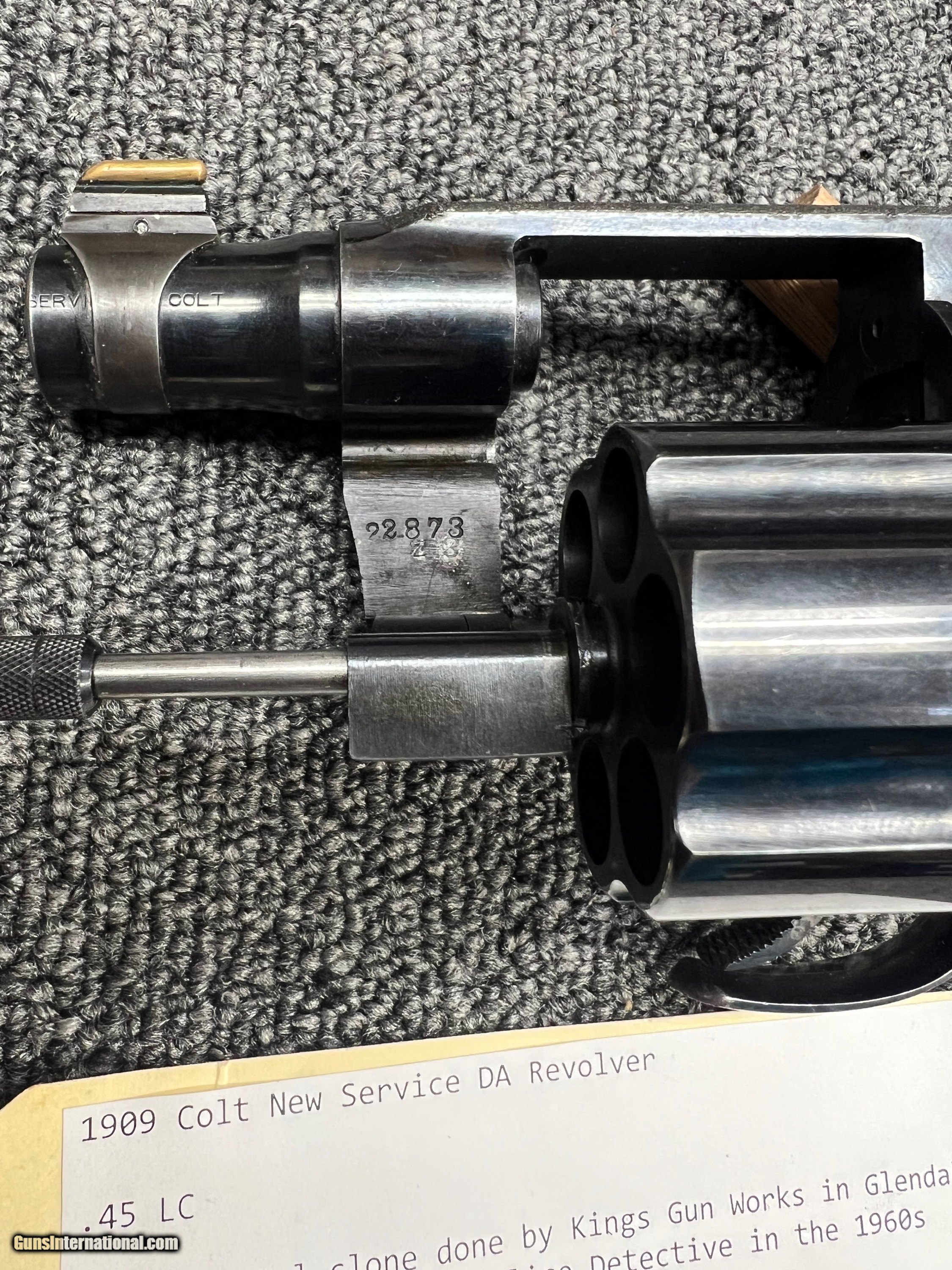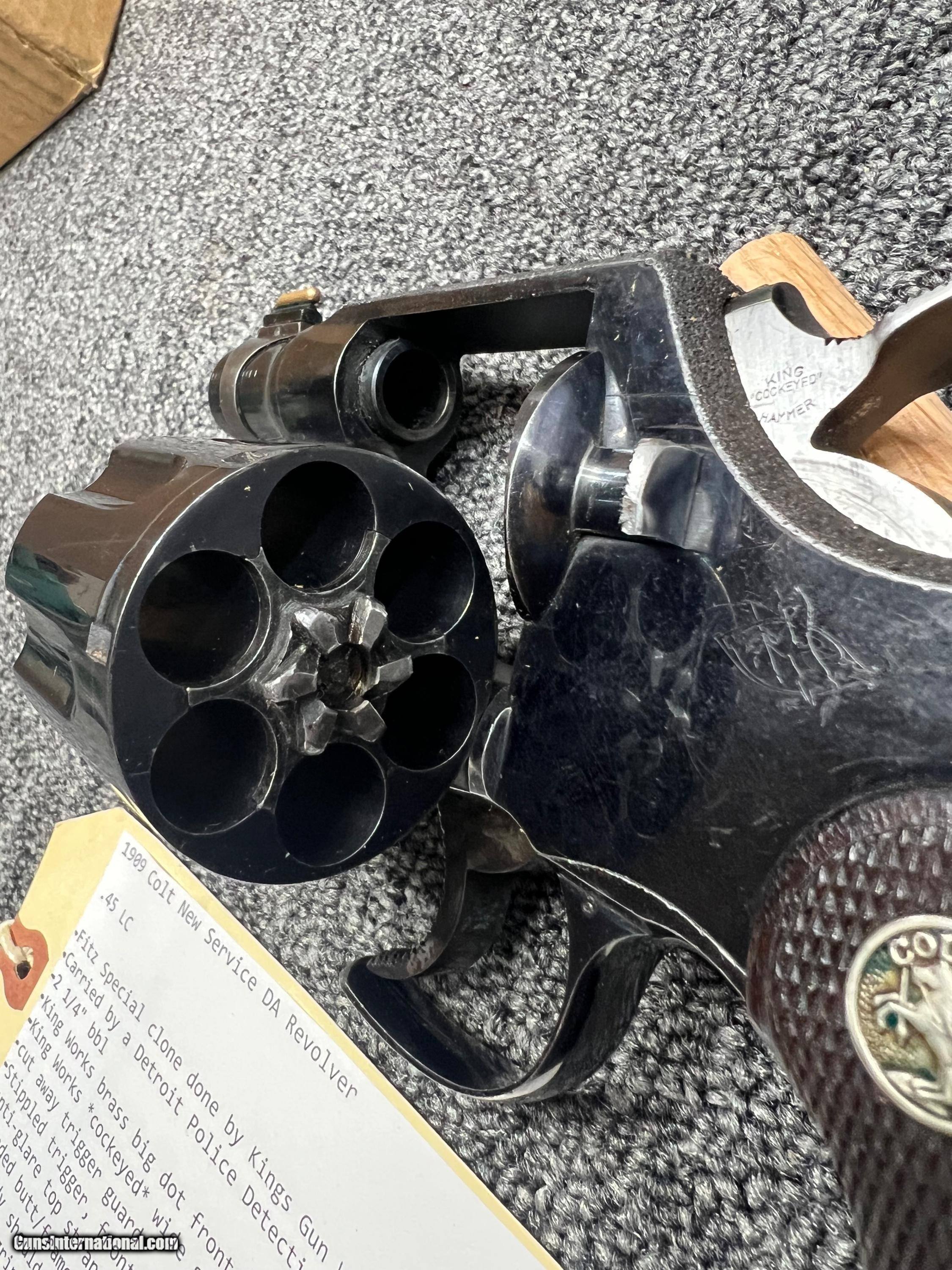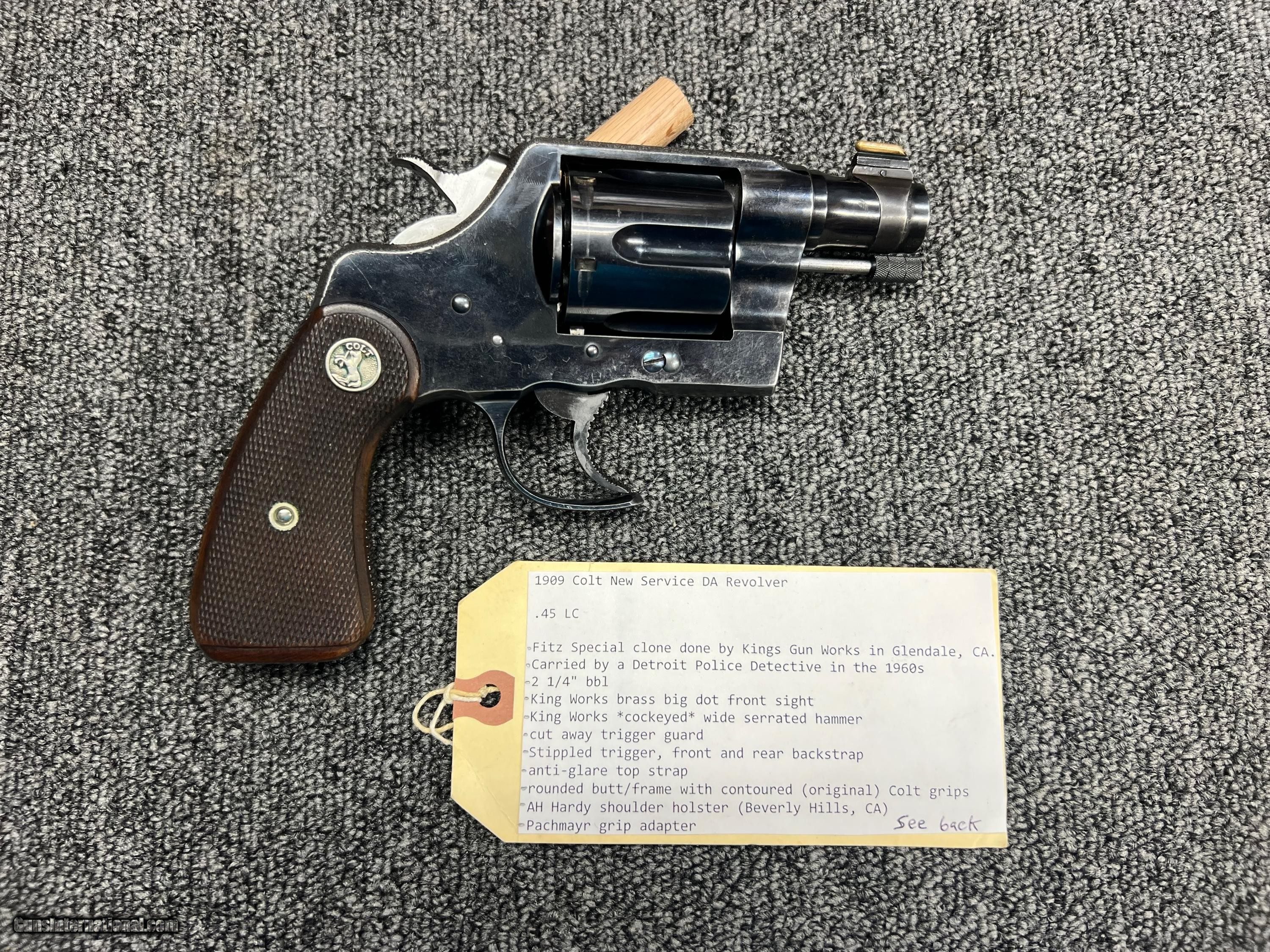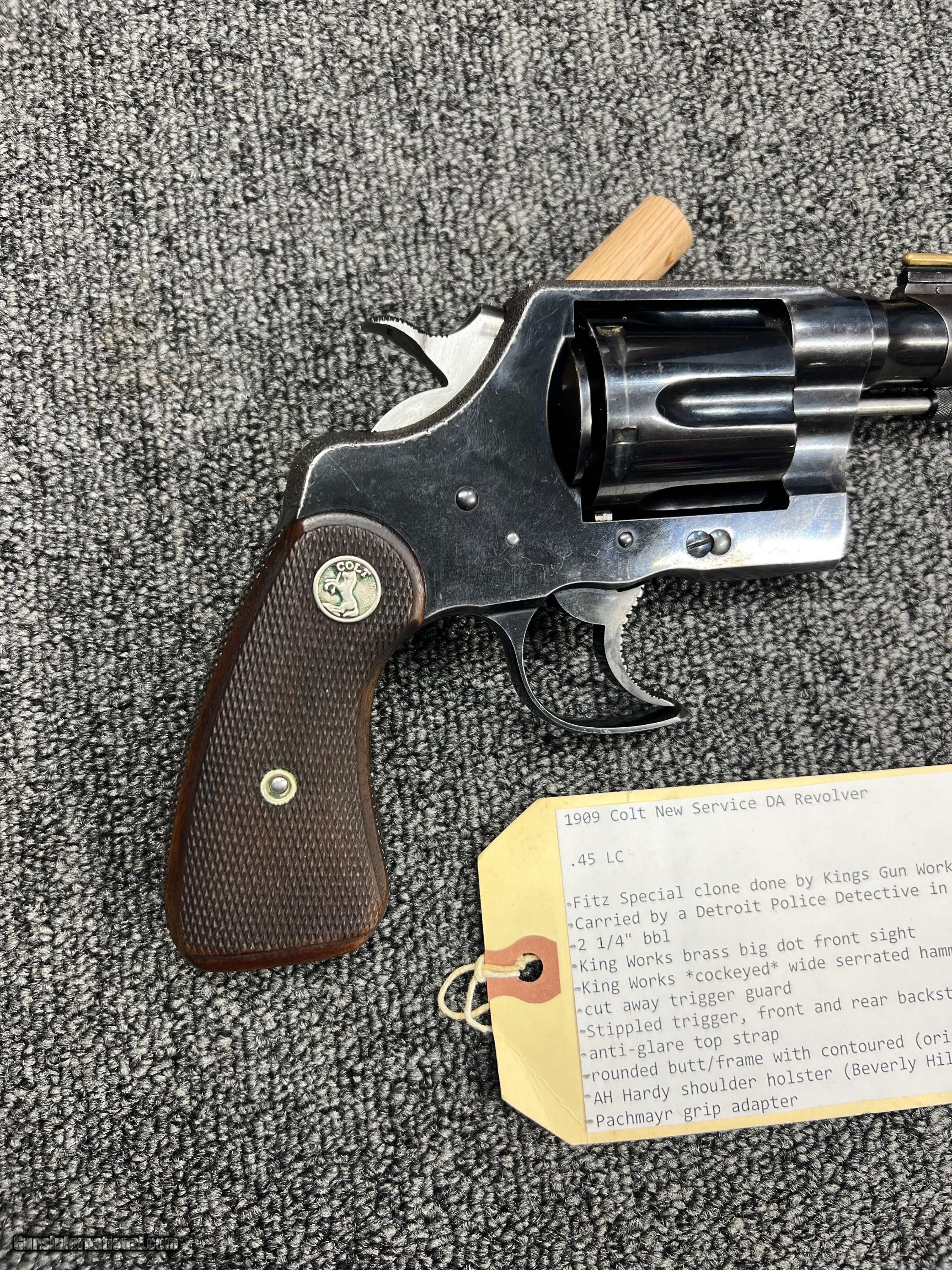 Description: This is a unique Colt new service DA revolver in .45 long colt. It is a "Fitz special" clone with all work performed by Kings Gun Works in California. This particular gun was carried by Detroit, MI police detective in the 1960's. See card in oicture for more info. Consifnment sale. $2400...buyer pays shipping and insurance ***NO CREDIT CARD FEES*** Handgun Caliber: .45 Colt Price: $2,400.00 Contact Seller |