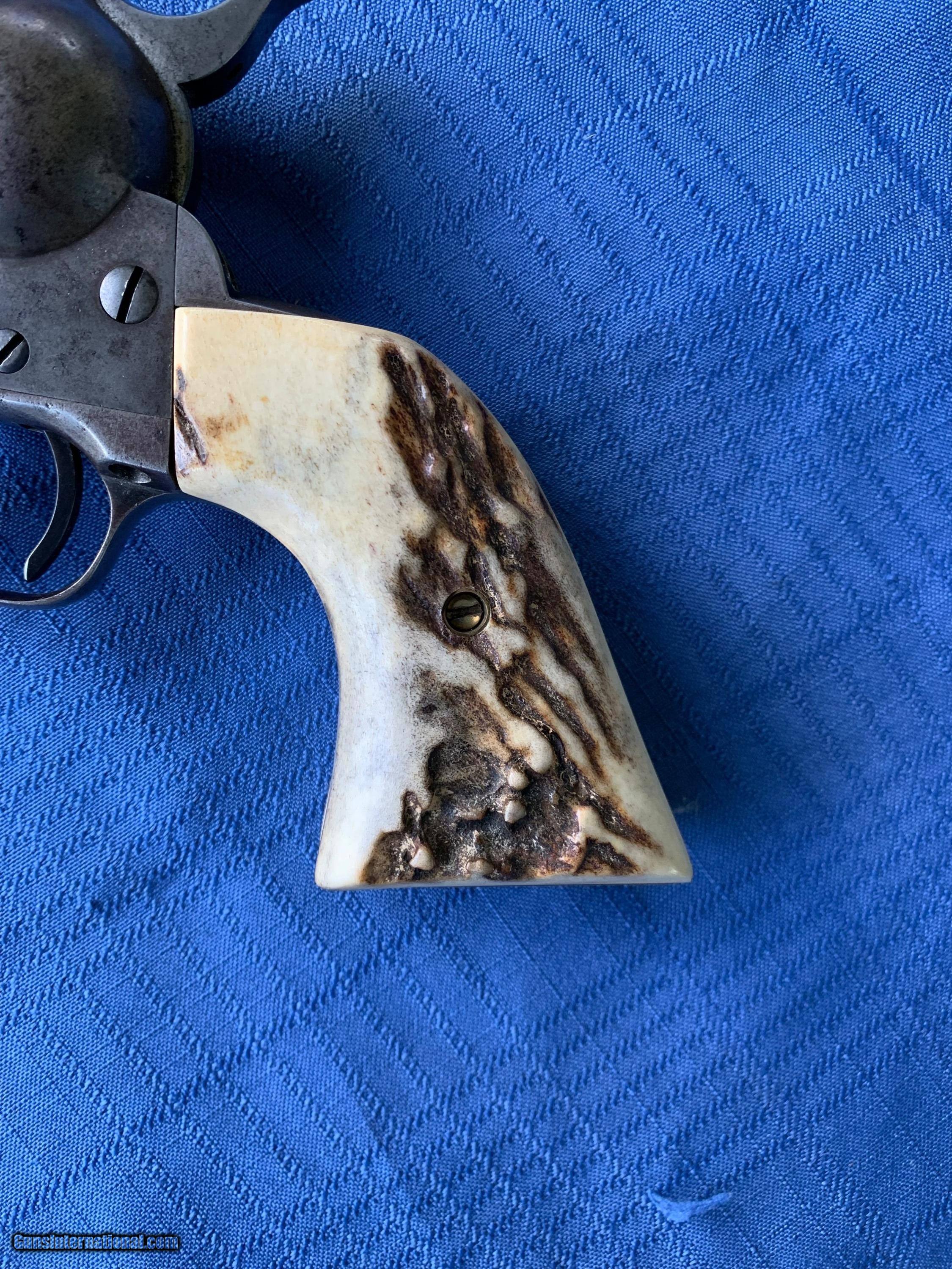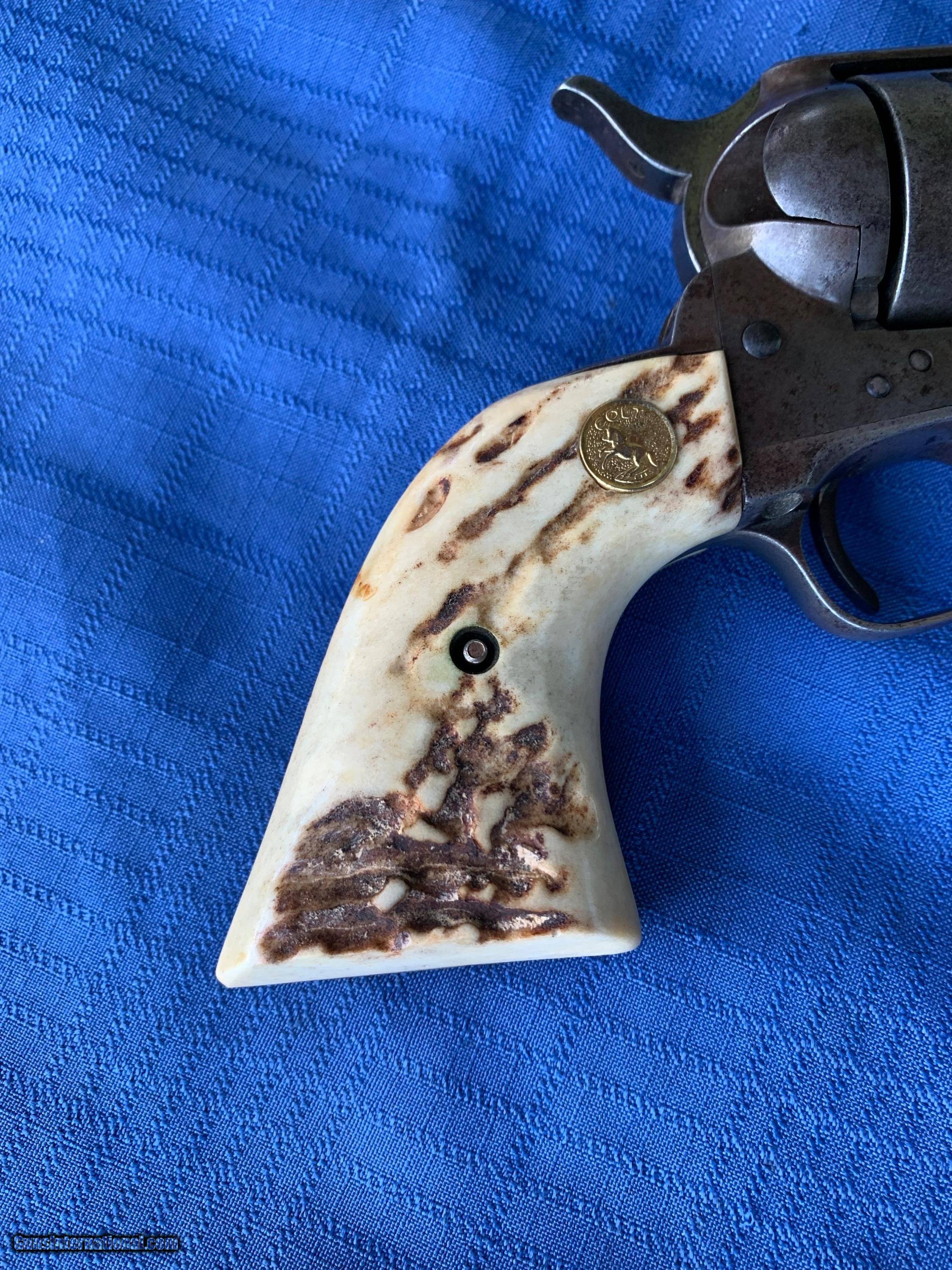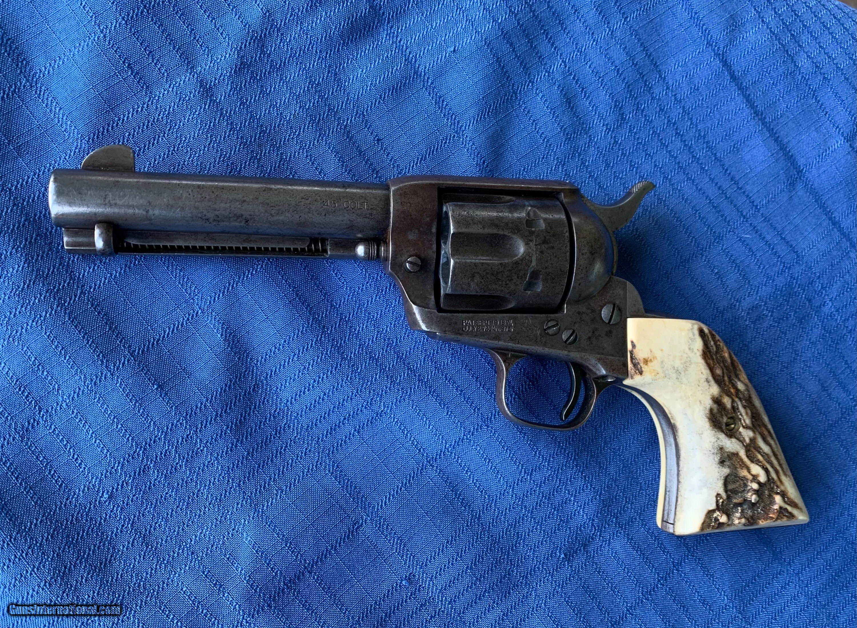 Description: Here's a tight Colt SAA in 45 caliber! Serial number 341390. 4 3/4" barrel . Period correct Stag grips ! Gun has a nice mellow patina finish with solid finish in protected areas . Bore and mechanics are in excellent condition. Gun has all the clicks ! Gun locks up tight and will make a great shooter! Very Handsome Colt SAA ! Please review my photos and please email me with any questions ? 3 day inspection as allways! Thank you for looking, Little Jo SOLD Antique: Yes Handgun Caliber: .45 Manufacturer: Colt Model: SAA Serial Number: 341390 Barrel Length: 4 3/4” |