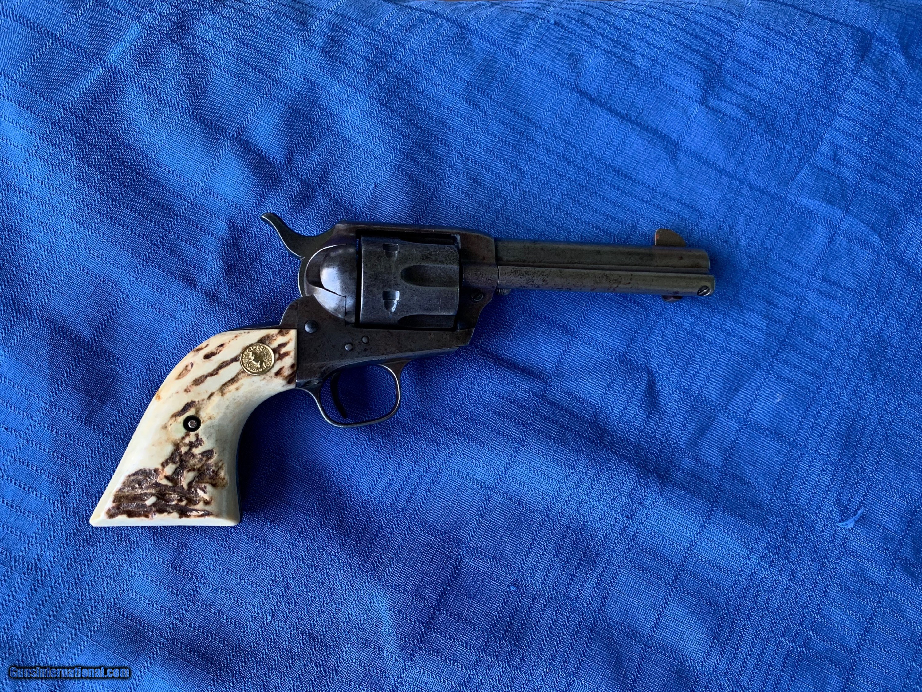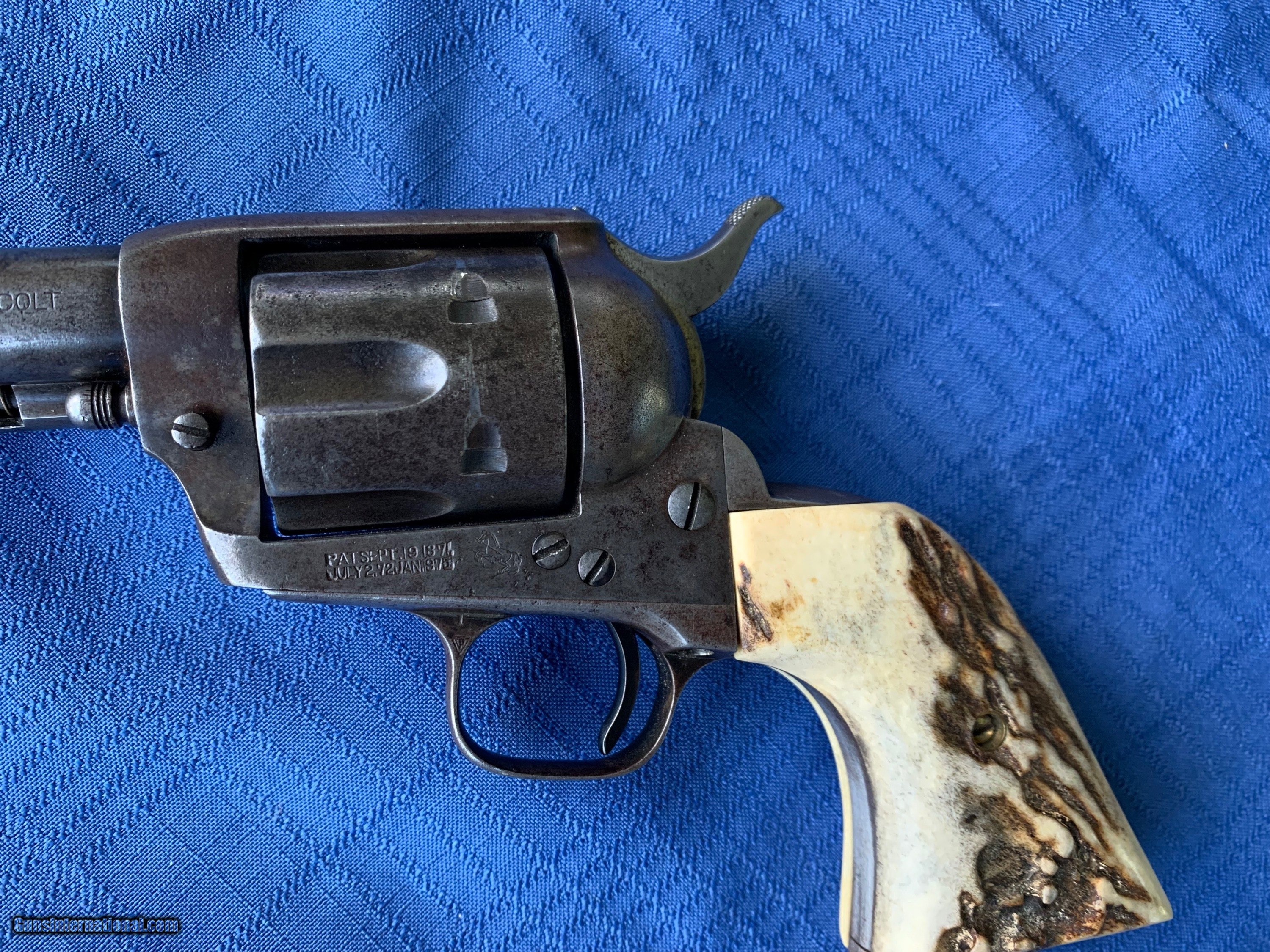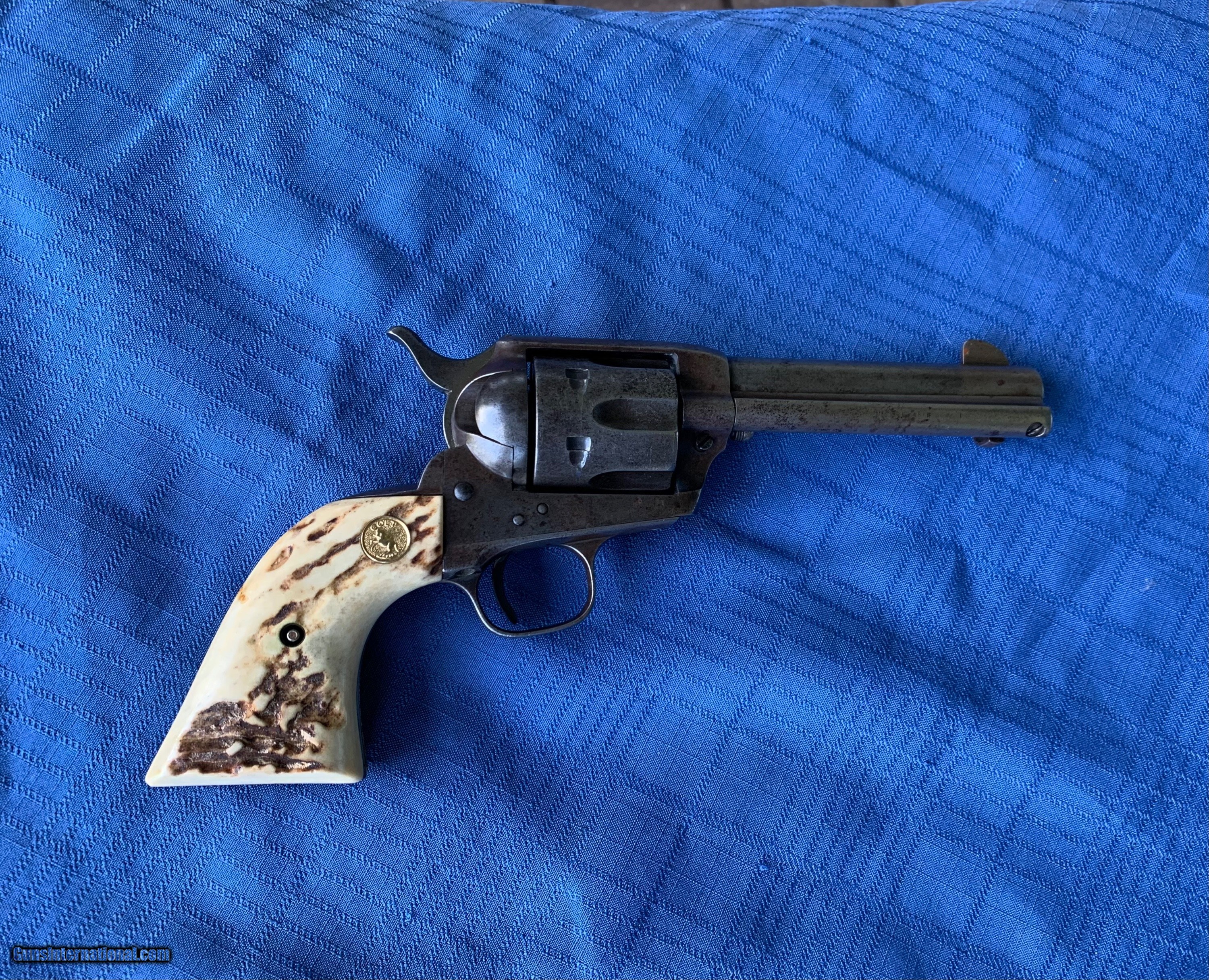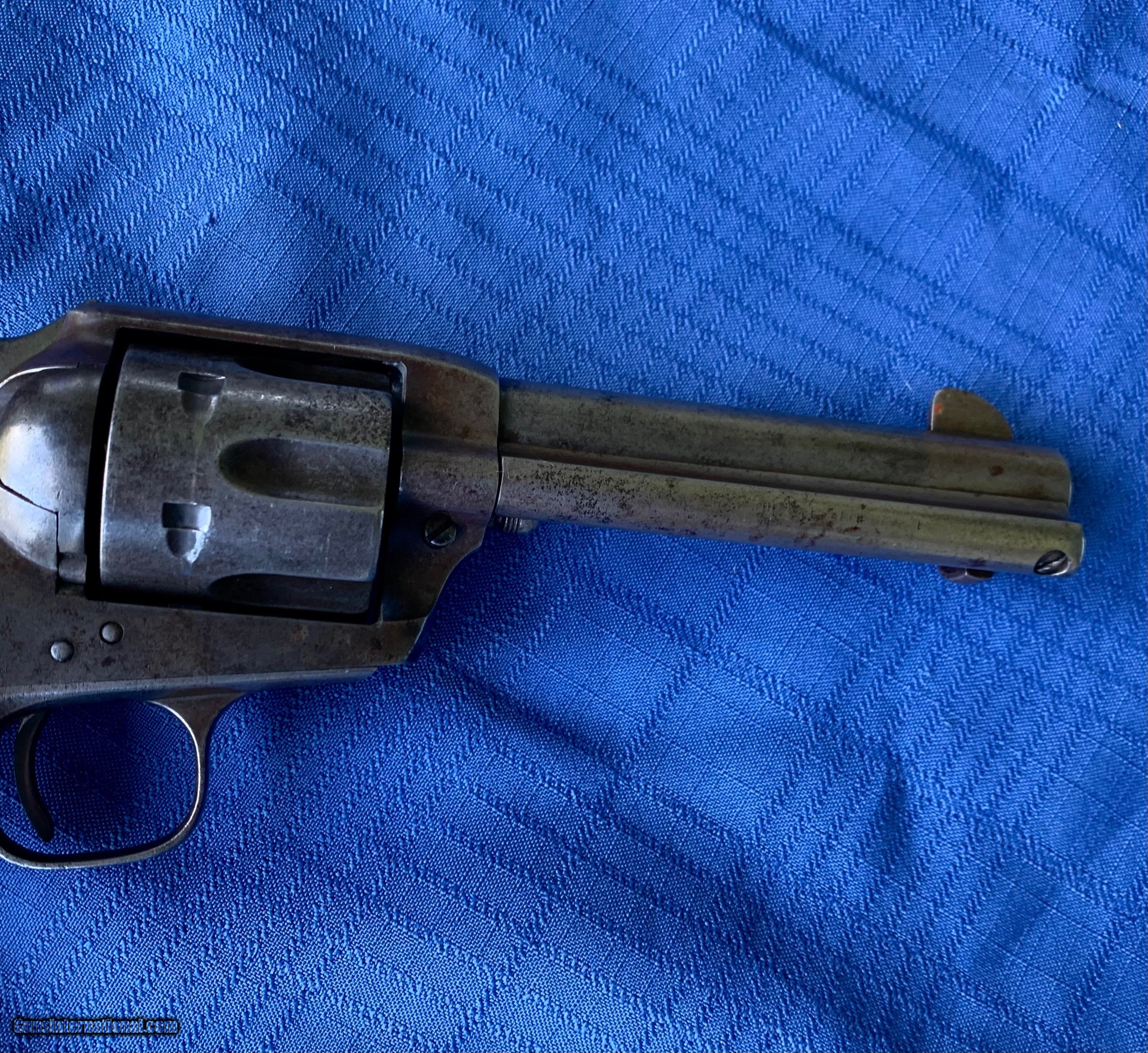 Description: Here's a tight Colt SAA in 45 caliber! Serial number 341390. 4 3/4" barrel . Period correct Stag grips ! Gun has a nice mellow patina finish with solid finish in protected areas . Bore and mechanics are in excellent condition. Gun has all the clicks ! Gun locks up tight and will make a great shooter! Very Handsome Colt SAA ! Please review my photos and please email me with any questions ? 3 day inspection as allways! Thank you for looking, Little Jo SOLD Antique: Yes Handgun Caliber: .45 Manufacturer: Colt Model: SAA Serial Number: 341390 Barrel Length: 4 3/4” |