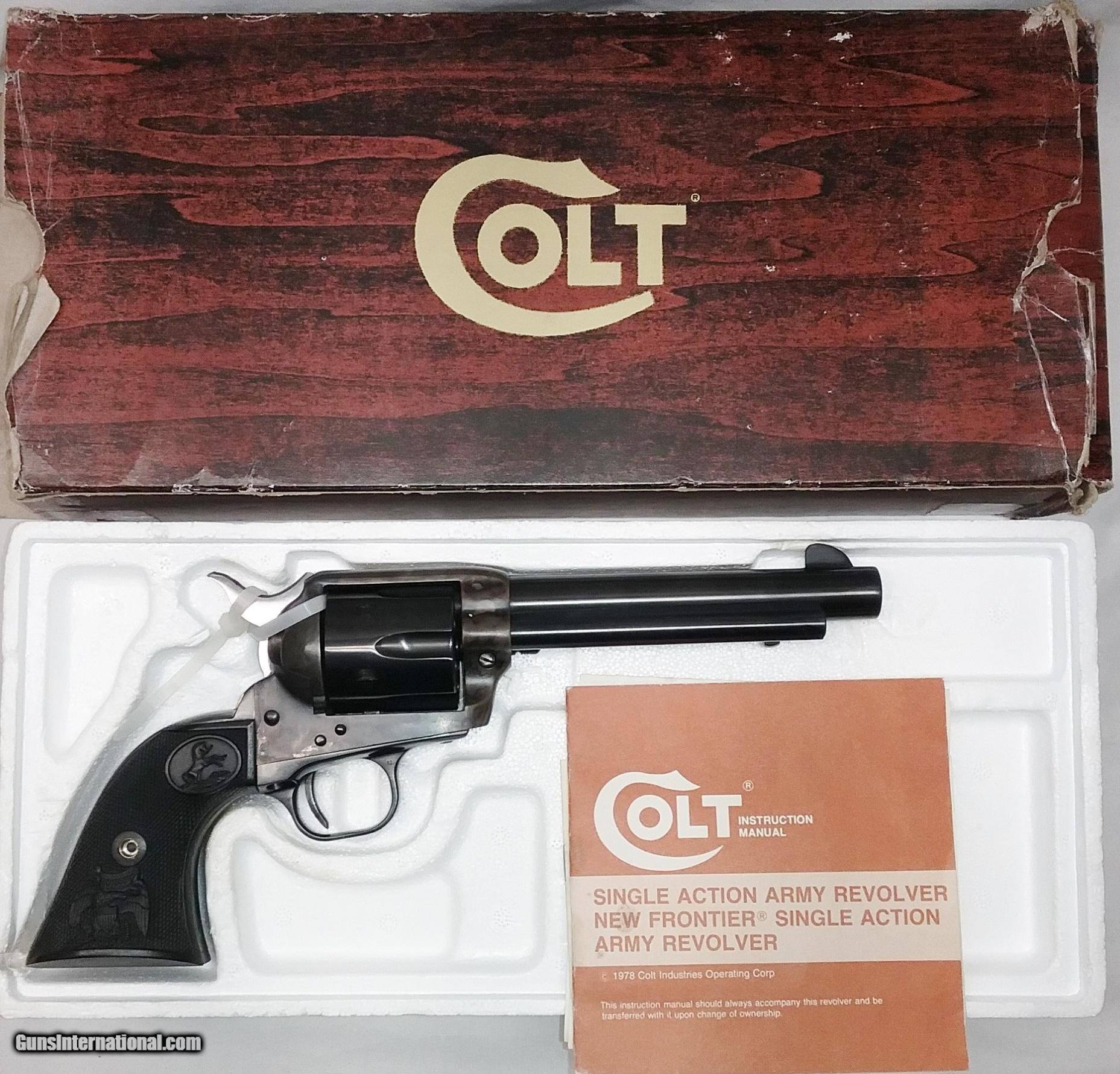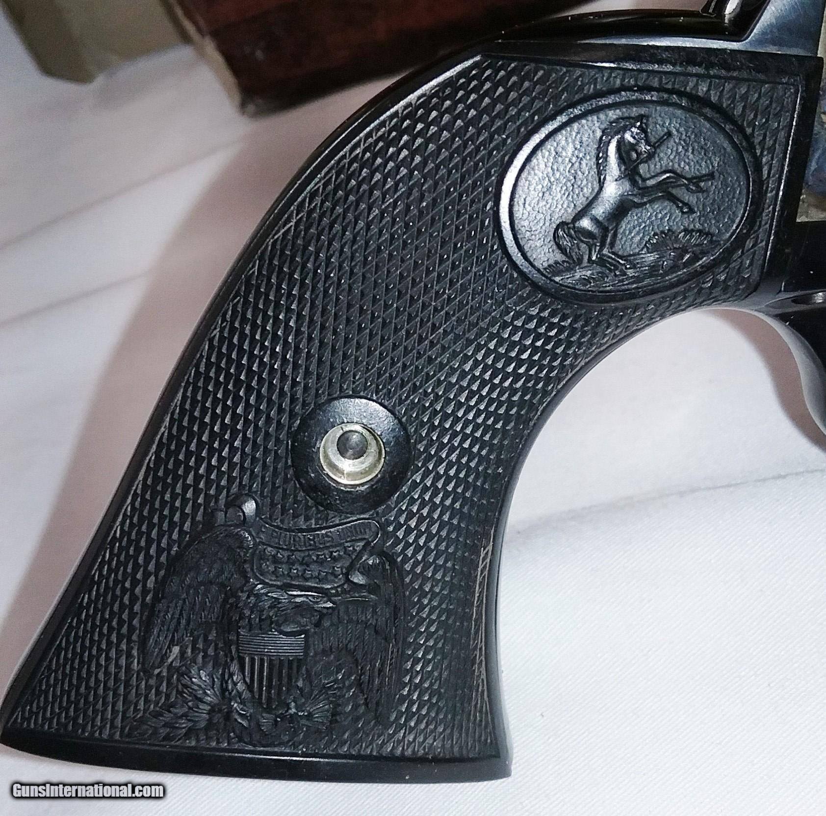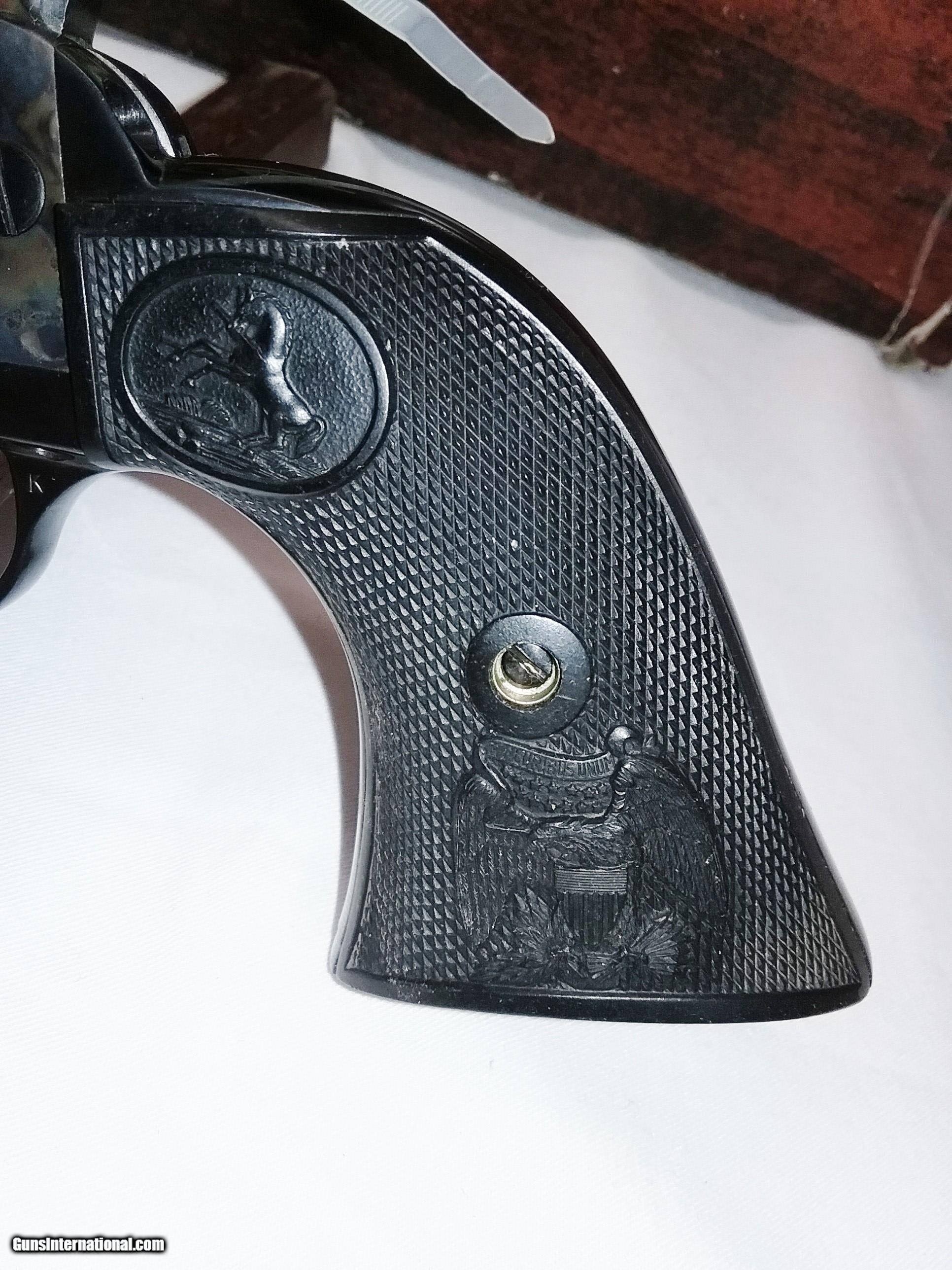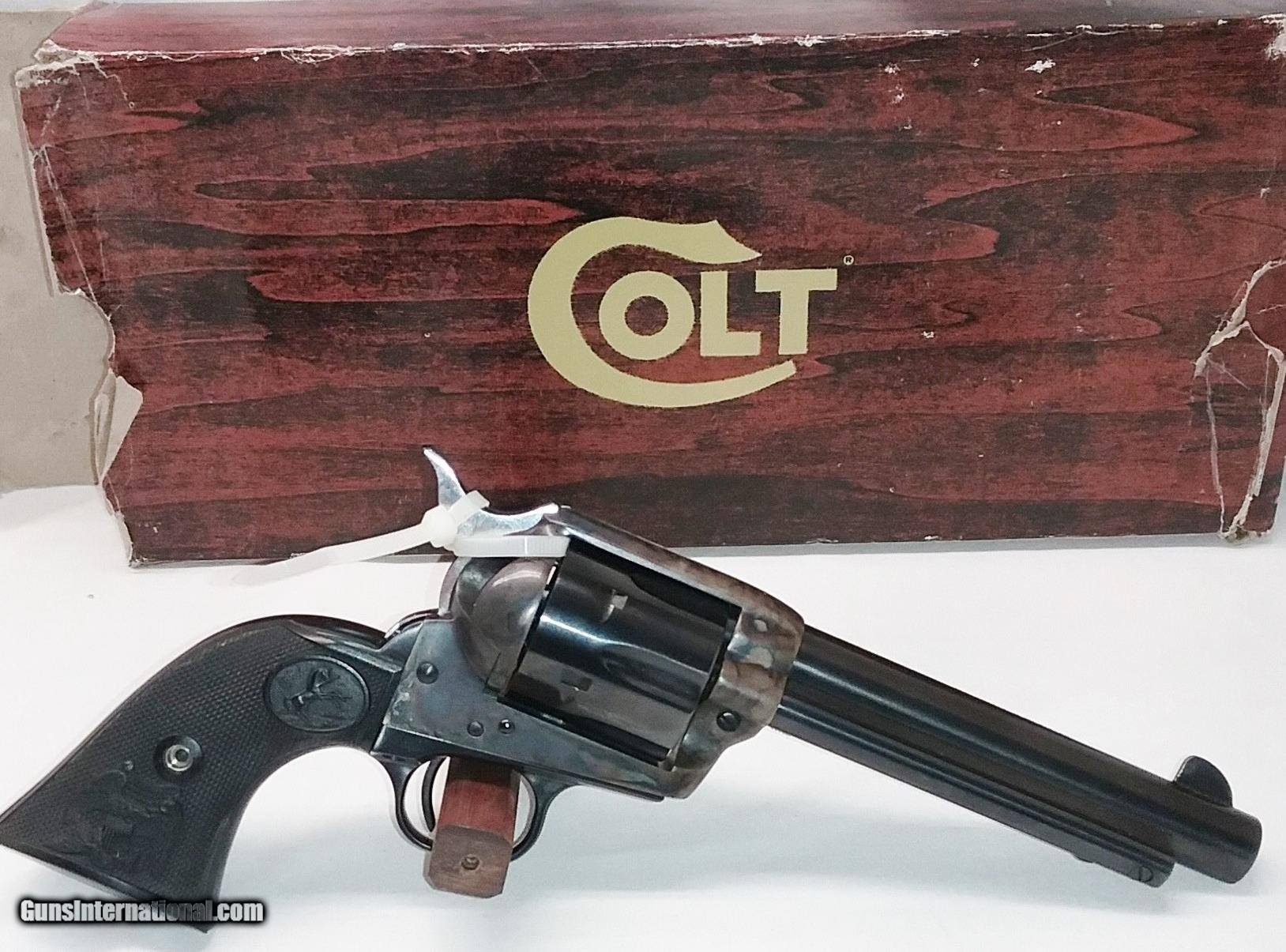Description: C237 Colt SAA 45 Cal. Manufactured 1980 - Stk #C237 This Colt Single Action Army Revolver was manufactured in 1980 and is chambered in the 45 caliber. It has 5-1/2” blued round barrel that is in excellent condition. This pistol is unfired and the bore and cylinder are in excellent condition. The bluing is in excellent condition and features a color case hardened frame. The Hammer is blued, with the sides remaining polished steel. The checkered grips are plastic and feature the eagle and shield on the bottom along with Colt’s logo up top. This revolver comes with the original box and carton. In the box is the original Owner’s Manual, The Colt Companion, authorized dealer repair pamphlet, and a letter from Colt. Overall length is 11”, and weight is 2.2 lbs. Our stock number is #C237. Will ship to any FFL in the United States, buyer pays freight and insurance SOLD Handgun Caliber: .45 Colt Manufacturer: Colt Model: 1873 Bore: Rifled Condition: New Metal Condition: New Bore Condition: Excellent - Unfired Barrels: One Barrel Type: Round Action: Single Action Triggers: 1 Finish: Blued Weight: 2.2 Sights: Fixed Manufacture Date: 1980 Item Location: OR - Oregon |