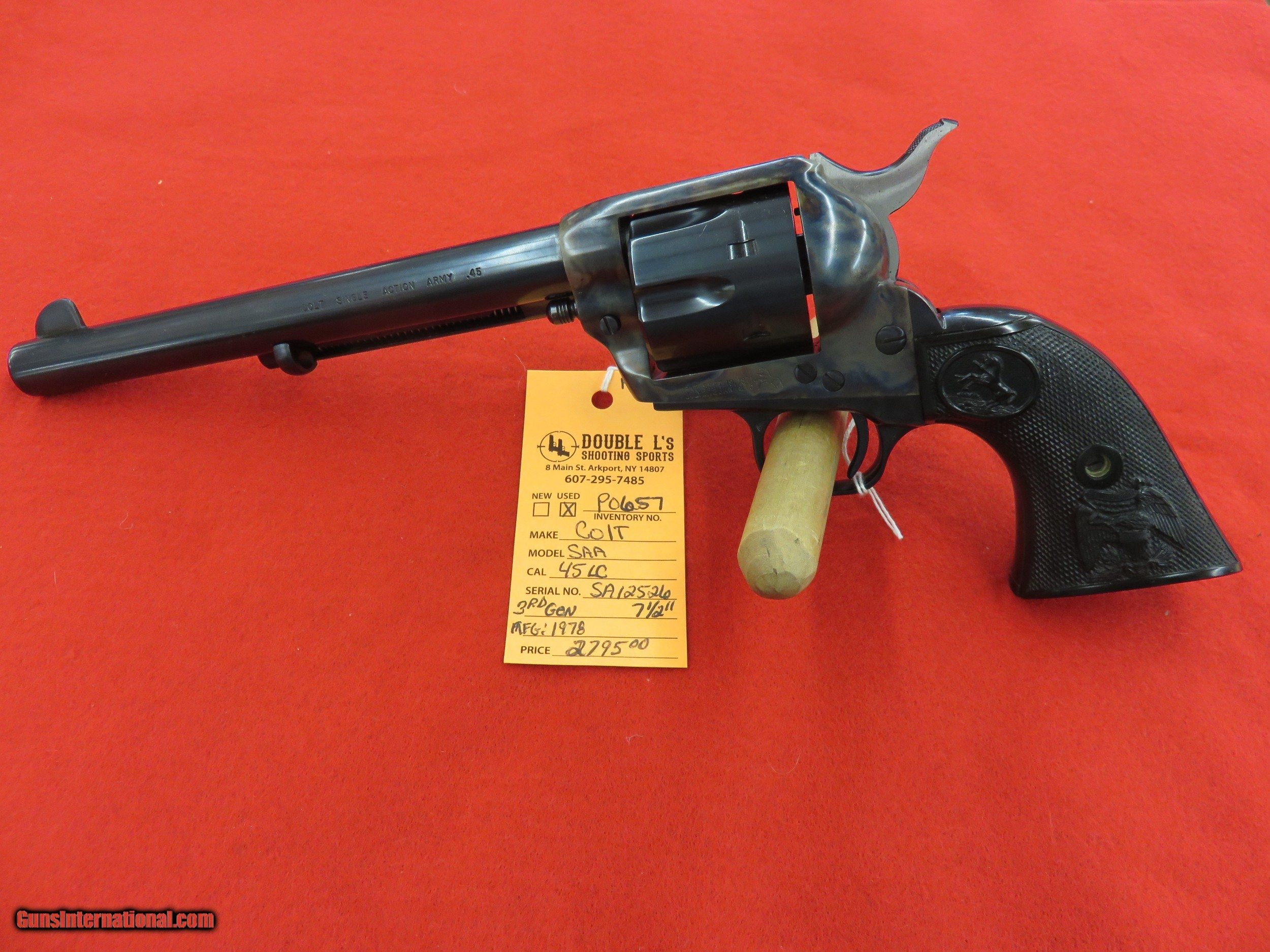 Description: Colt Single Action Army, 3rd Generation, 45 colt, serial #SA12XXX, 1978 mfg, 7 1/2" barrel, 100% blue and case color, mint, no box, appears unfired and unspun cylinder SOLD |