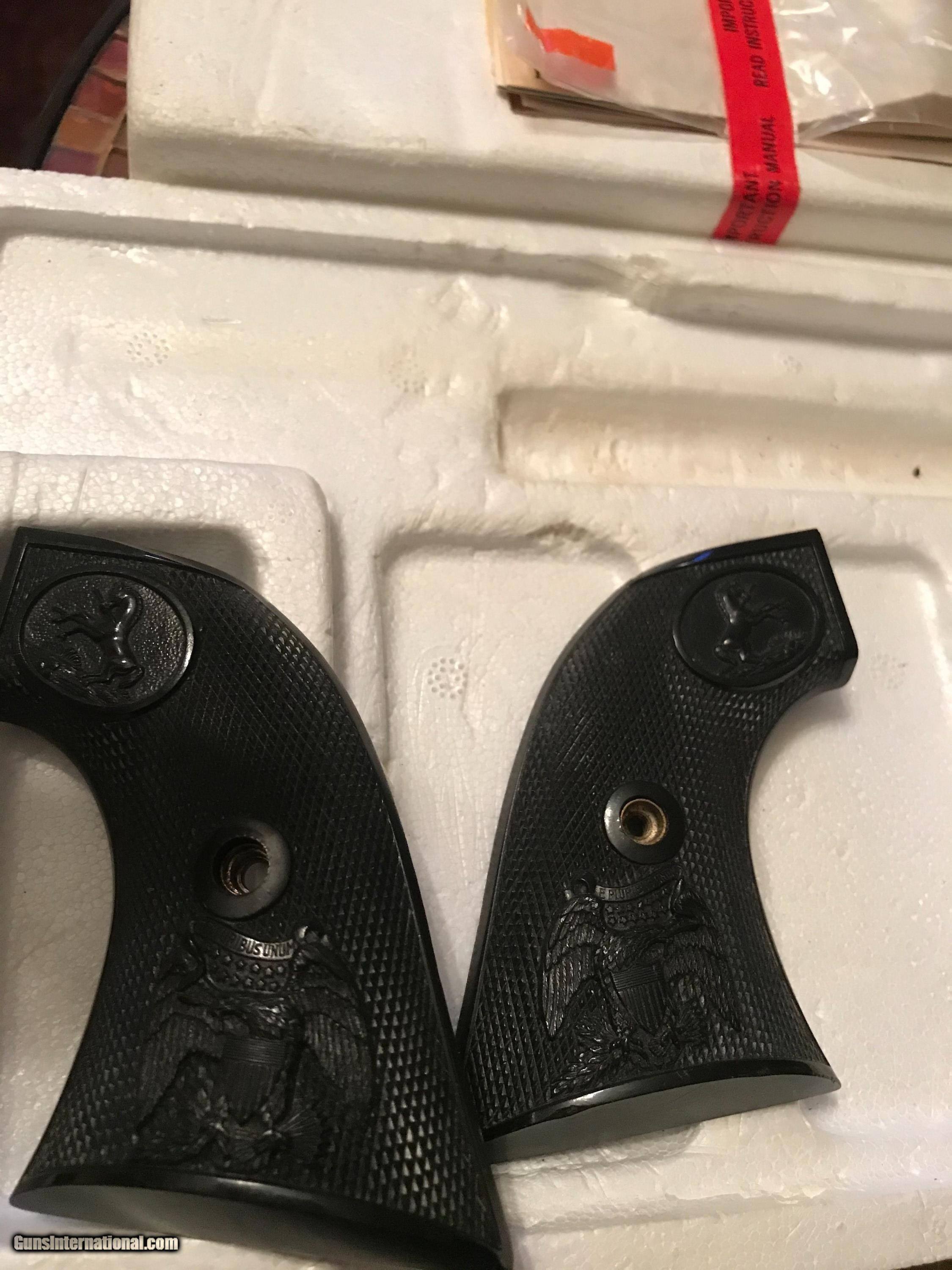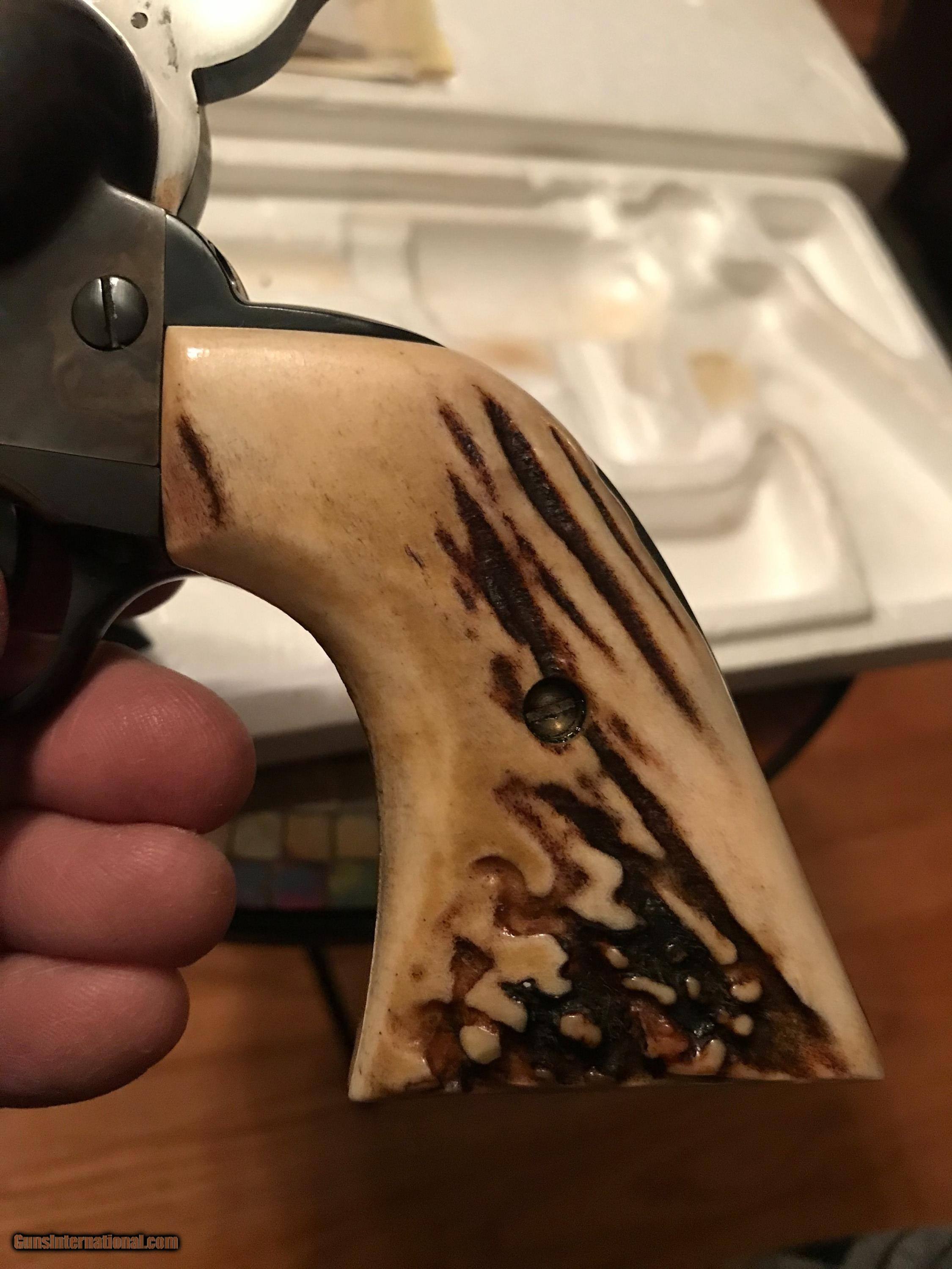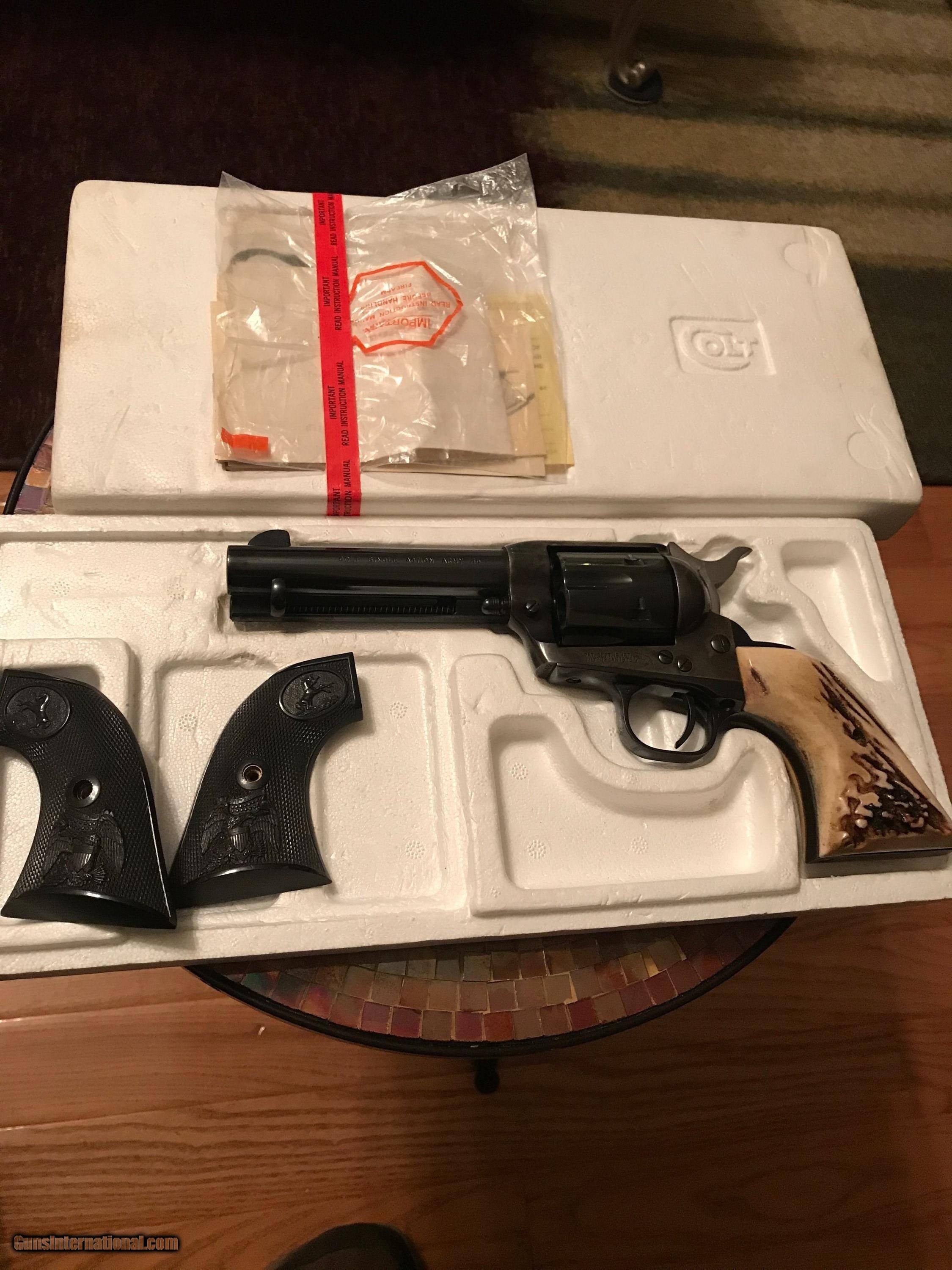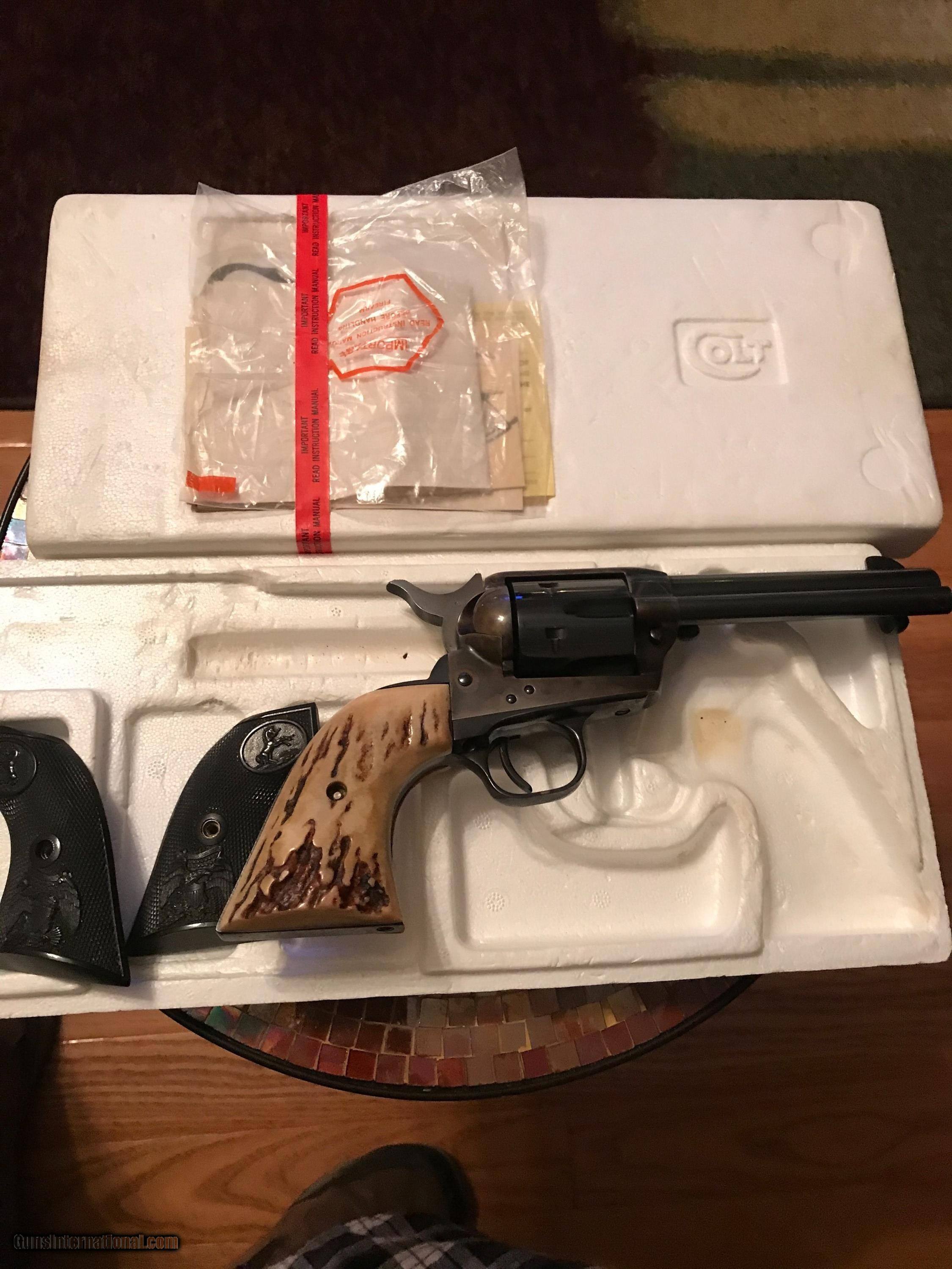 Description: My goodness, what a gun! 3rd generation saa, 45 LC, 4 3/4ths inch barrel, case hardened frame, blue finish, original grips, papers, and number box. Also included is a set of genuine stag grips. Doesn't look like it's been fired. Please email with questions. Shipping included. Cards add 3% SOLD Manufacturer: Colt Model: SAA Barrel Length: 4.75 Condition: Used Metal Condition: Excellent Wood Condition: N/a Bore Condition: Excellent Action: Single Finish: Blue Sights: Fixed Manufacture Date: 1982 Extras: Stag grips Item Location: 37075 |