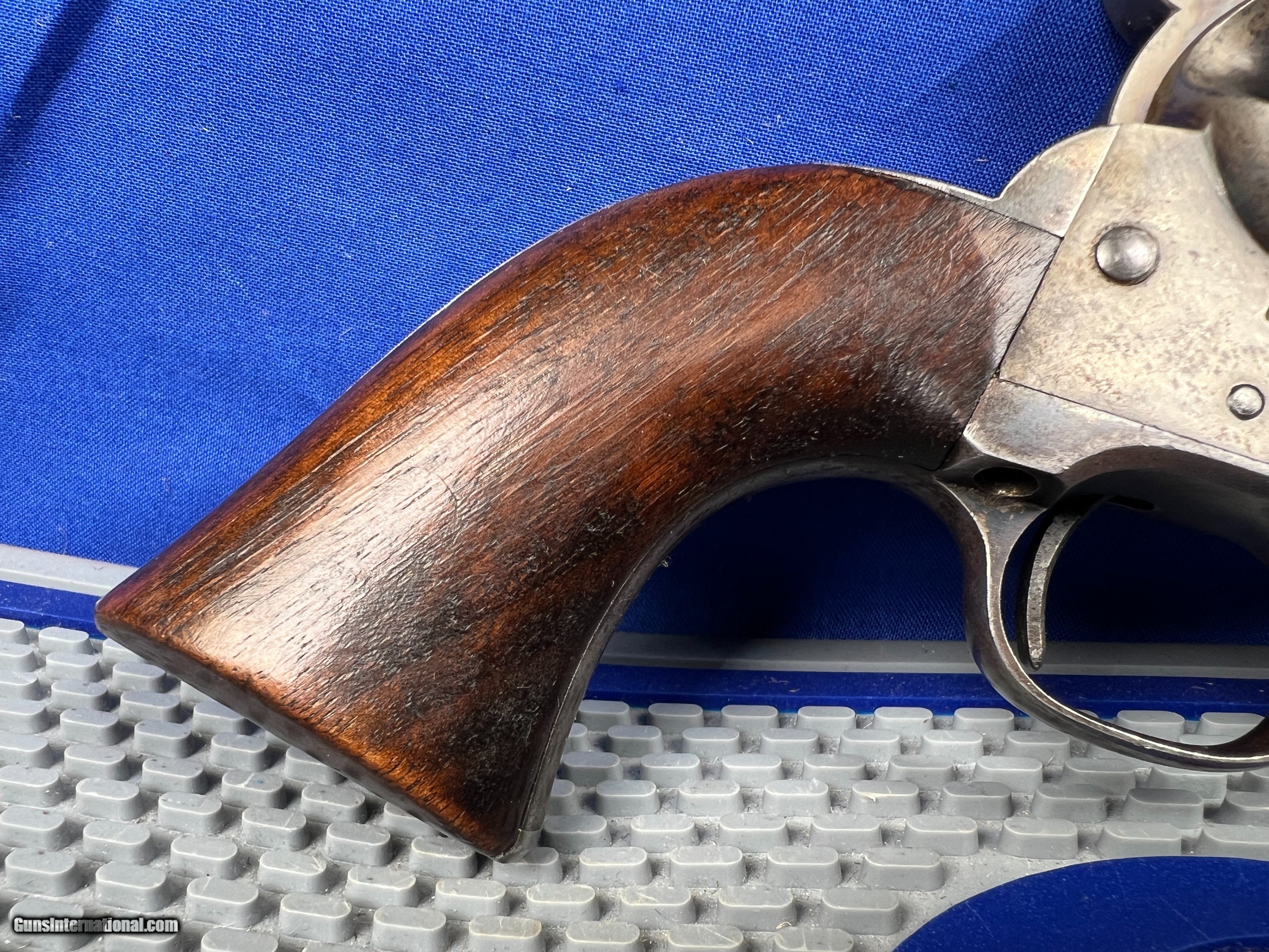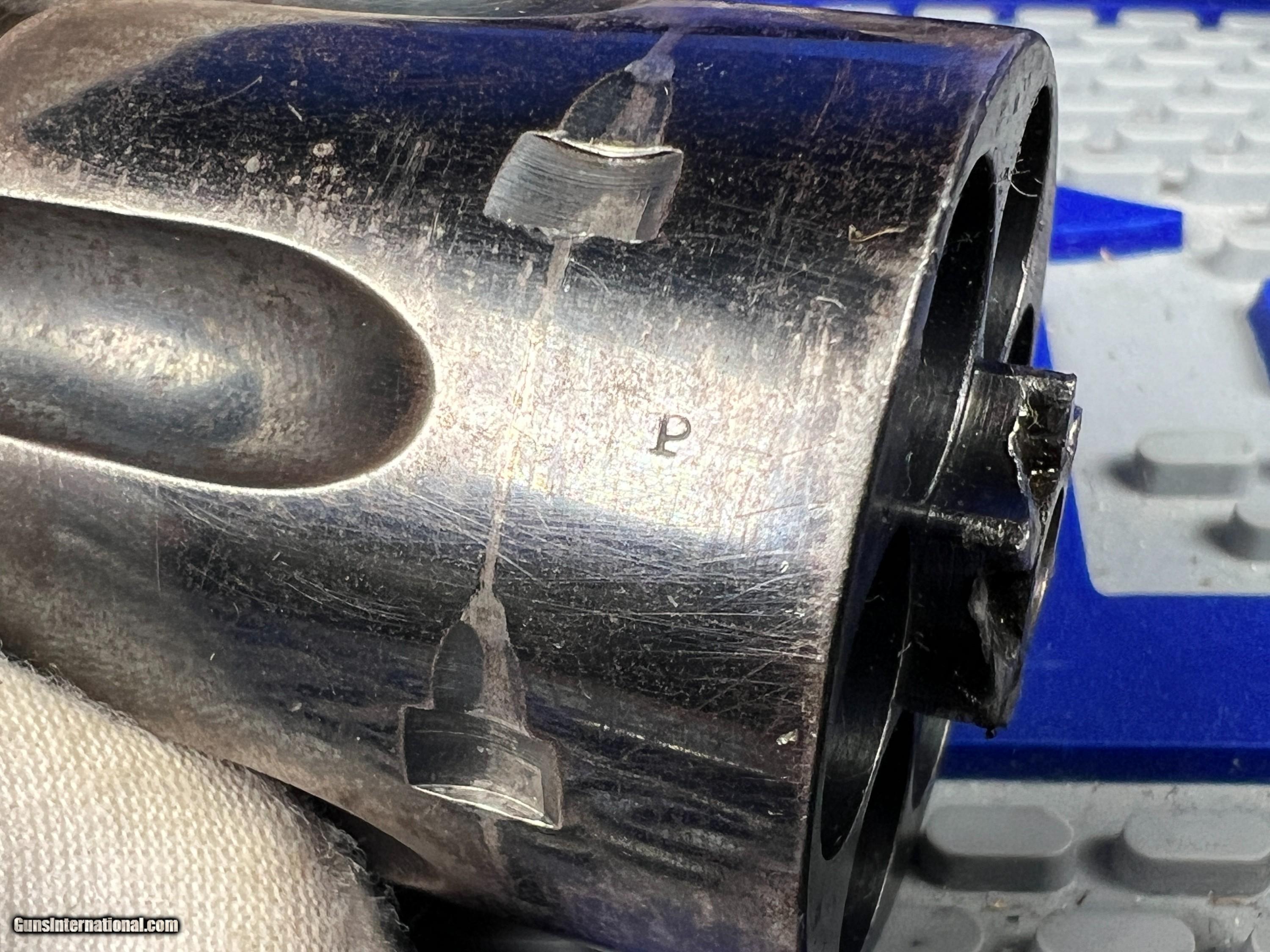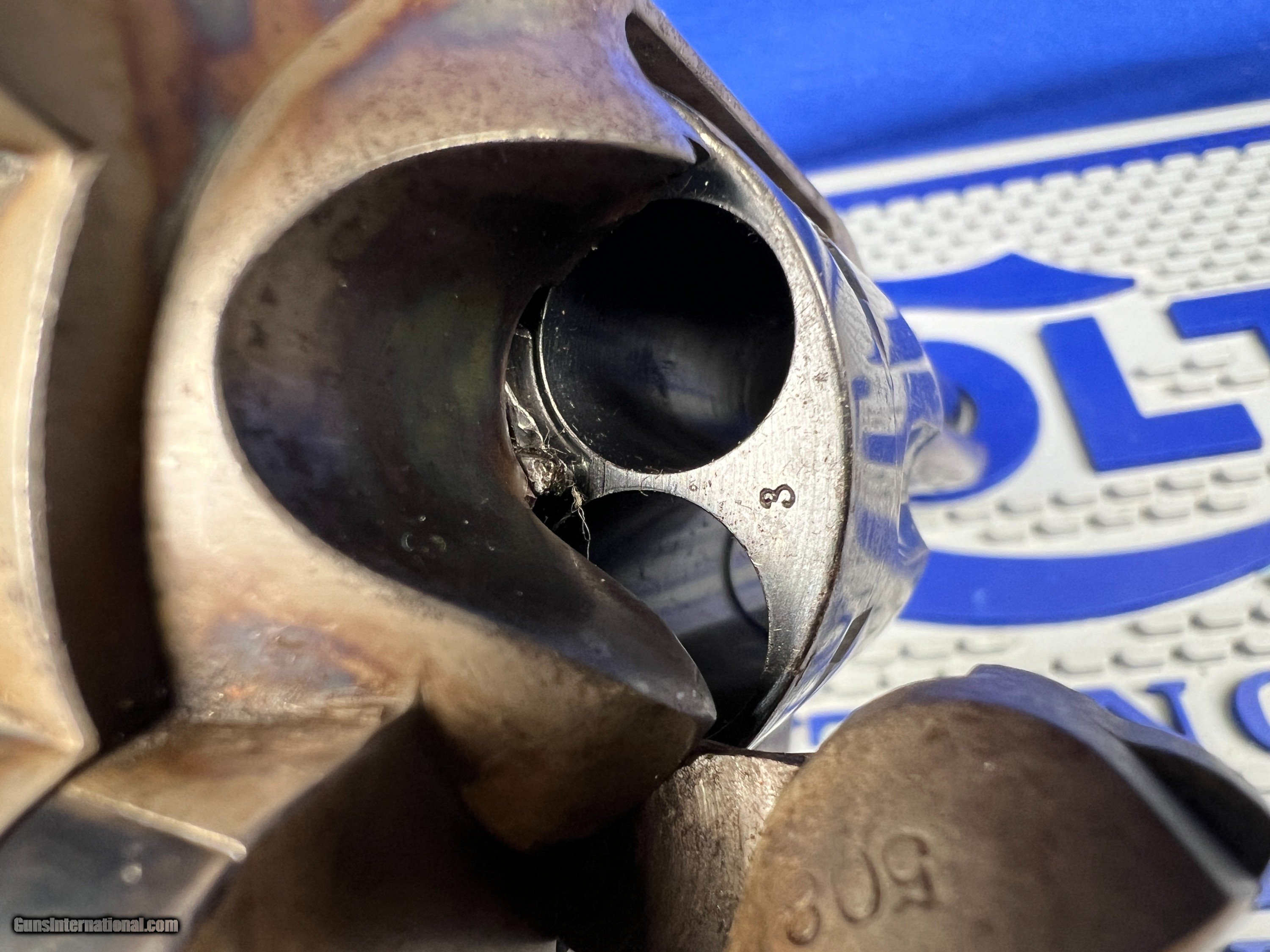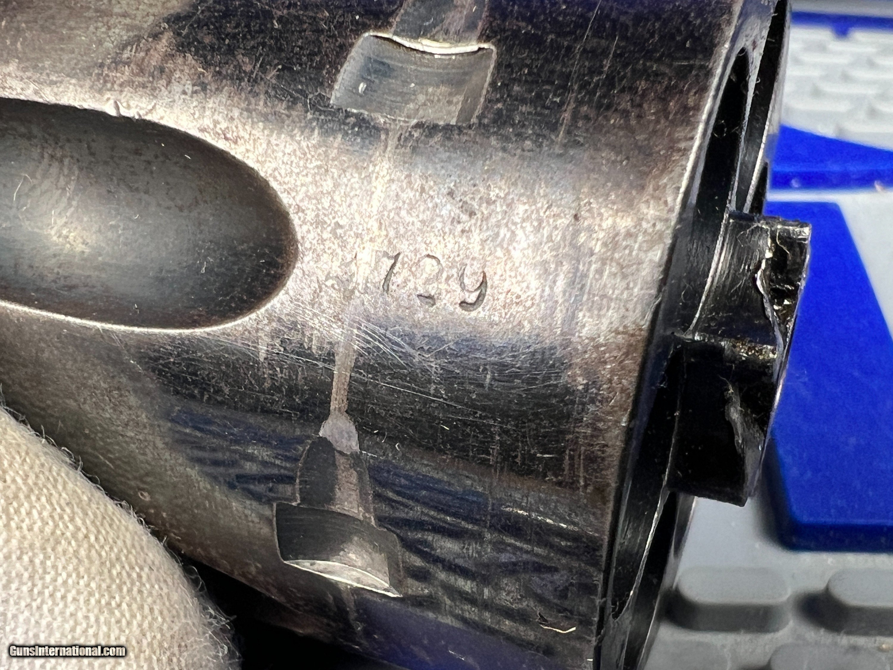 Description: Colt Single Action U.S. Artillery Model 1st Generation Black Powder Frame 45 Colt 5.5in Description: The Colt Single Action Army, or "SAA" revolver is doubtless the classic sixgun most associated in our folklore with the American West. Introduced in 1873, the basic design remained with a few interruptions in production and is manufactured today by Colt and other firms. U.S. military-purchased SAAs are among the most eagerly sought-after historic sidearms of the era, having been used from the Indian Wars into the early 20th Century by the U.S. Army. They were originally issued with 7 1/2" Barrels in .45 Colt. Between 1895 and 1903, the government had nearly 17,000 of its SAAS reconditioned and rebuilt by the Springfield Armory and the Colt factory. Most of these guns had the barrels shortened to 5 1/2". Since most guns were reassembled without concern for part numbers, this is one of the few collectible gun variations that is considered "correct" with mixed serial numbers, meaning that the various parts of the gun will usually not match each other. These refurbished revolvers were issued to troops in the Spanish-American War and Philippine Insurrection, and have been nicknamed "Artillery Models" by collectors since a few of them were issued to Artillery units. The original long-barrel variations are distinguished by the "Cavalry Model" nickname and should generally have matching serial numbers. Both types will have the "U.S." stamped on the frame, along with the inspector's initials on various parts. Make: Colt Model: 1874 Single Action Army Artillery Model, 1st Generation, Black Powder Frame Serial Number: 10088 Year of Manufacture: 1874 (://colt/serial-lookup) Caliber: .45 Colt Action Type: Single Action Revolver with Side Loading Gate Cylinder Markings: The left side of the frame is marked "PAT. SEPT 19. 1871. /" PAT. JULY 2. 1872. " and with "U.S". The top of the barrel is marked "COLT'S PT. F.A. MFG. CO. HARTFORD, CT. U.S.A.". The underside of the frame at the trigger guard is marked "10088" and the bottom of the trigger guard is marked "139109/K". The bottom of the backstrap is marked with "3136". The rear of the loading gate is marked with an assembly number "508". The outside of the cylinder has markings. One appears to be a partial serial marking and the other an inspector's initials marking. The rear face of the cylinder is marked "K". The hammer slot is marked "C". The bottom of the barrel is marked "P" and "RAC", facing different directions. The bottom of the grip is marked "RAC" on the left side of the back strap. Barrel Length: The barrel is 51⁄2". Sights / Optics: This revolver is mounted with a "V" notch in the top strap for rear sight and a quarter-round blade front sight fixed to the barrel. Stock Configuration & Condition: The grip is one-piece walnut. The bottom has a "RAC" cartouche on the left side of the back strap. There are some light handling marks but no chips or cracks. Overall, the grips are in Very Good condition as seen in the pictures. Type of Finish: Blue & Case Color Finish Originality: The finish appears original. It most likely went through factory refurbishment. This refurbishment frequently involved installation of non-serial matching parts and this is likely the reason for the non-matching parts on this revolver. We don't see any signs that the revolver has been refinished since this refurbishment. Bore Condition: The bore is bright with well-defined rifling. The condition is rated excellent. Overall Condition: This revolver retains about 30+% of its current metal finish. The most remaining finish is in protected areas such as around and under the ejector housing, at the rear of the barrel where it enters the frame, the corners formed by the trigger guard where it widens to meet the frame, the rear face of the cylinder and at the top of the backstrap behind the base of the hammer. The frame shows scattered remaining case color, also mostly in protected areas such as the face of the recoil shield, the loading groove, and the pinched area at the front under the cylinder pin. Most of the exposed areas which were blued have gone to a moderate patina with some grip areas worn to white. There are some scattered light nicks, scuffs, and scratches with infrequent spots of minor surface erosion. The cylinder has a turn-line. The rear face of the cylinder has a ring of wear between the chambers at the location of the firing pin, but the firing pin is intact. The grip screws range from sharp to disfigured with usable slots. The markings range from clear to worn and incomplete. The revolver is in Good condition as Antique (see Mechanics). Mechanics: Lockup is tight with no slipping. The trigger is crisp. Overall we rate mechanics as excellent. We have not fired this revolver. As with all used firearms, a thorough cleaning may be necessary to meet your maintenance standards. Box, Paperwork & Accessories: This firearm does not include a box, paperwork, or any accessories. Price: $6500 SOLD Handgun Caliber: .45 Colt Manufacturer: Colt Model: SAA Serial Number: 10088 |
