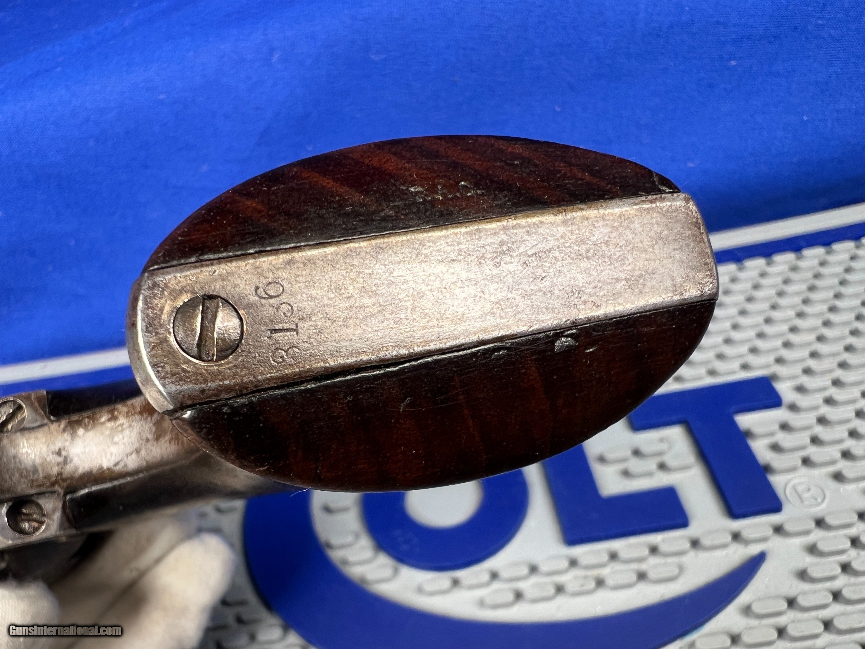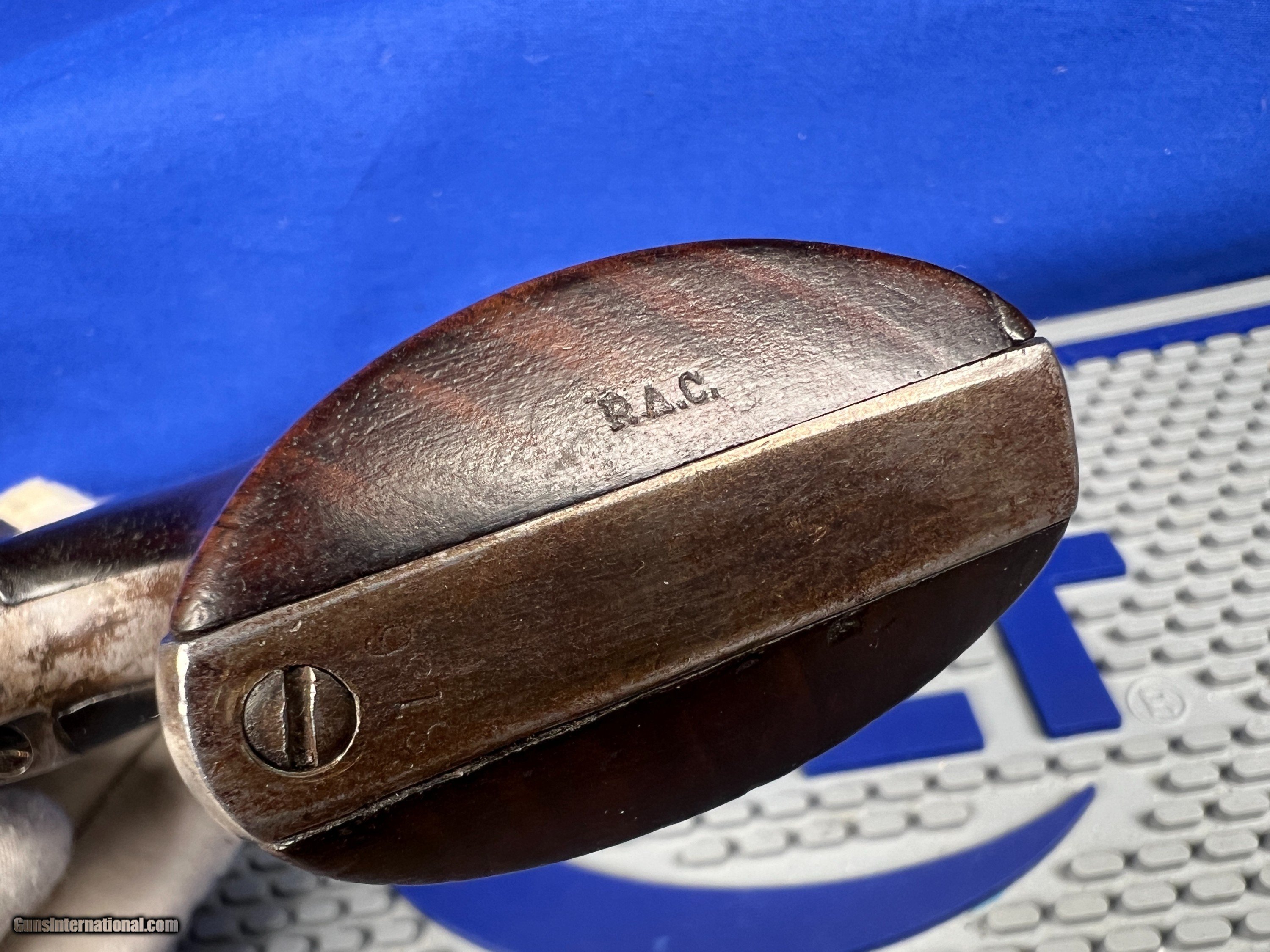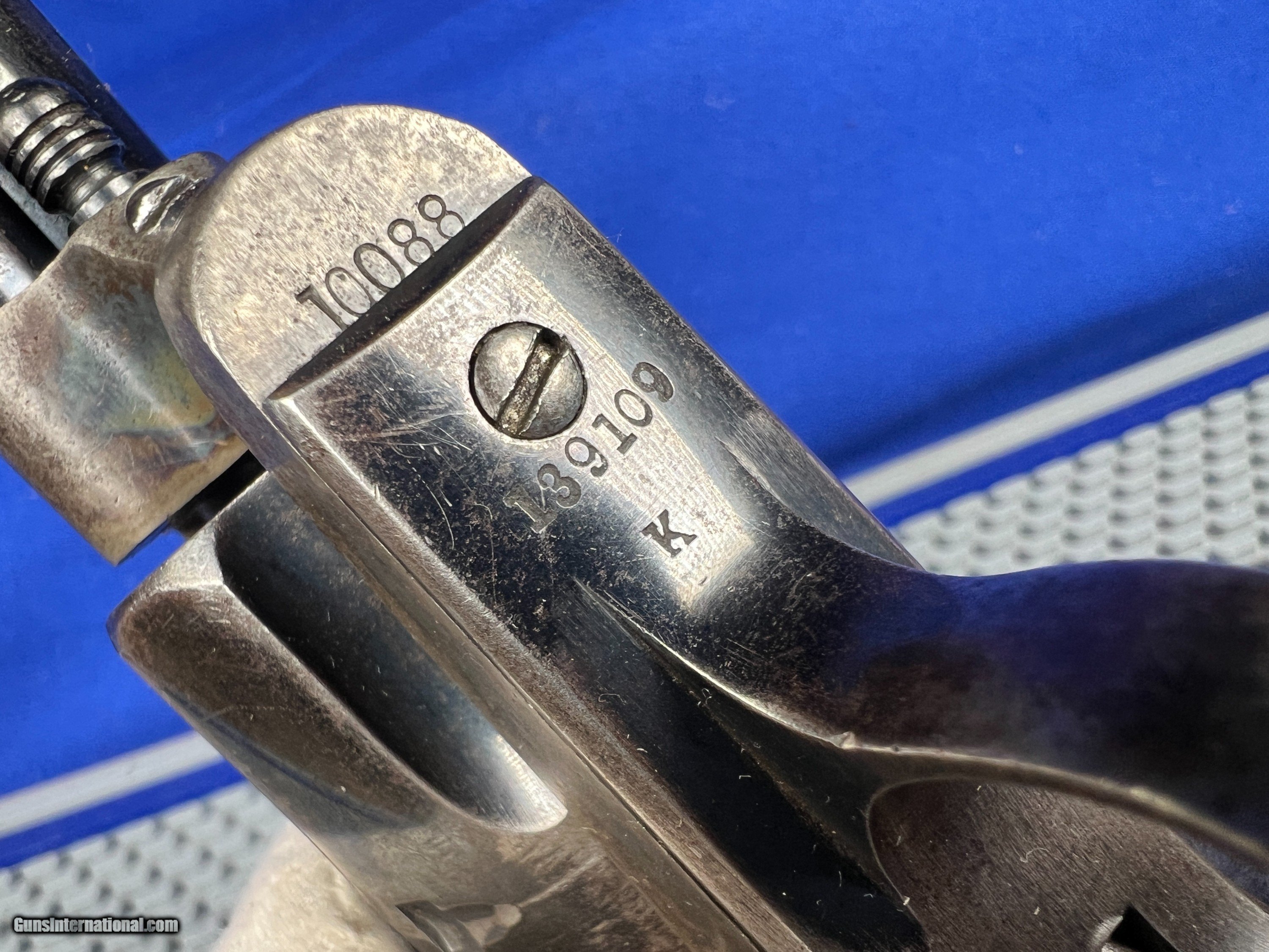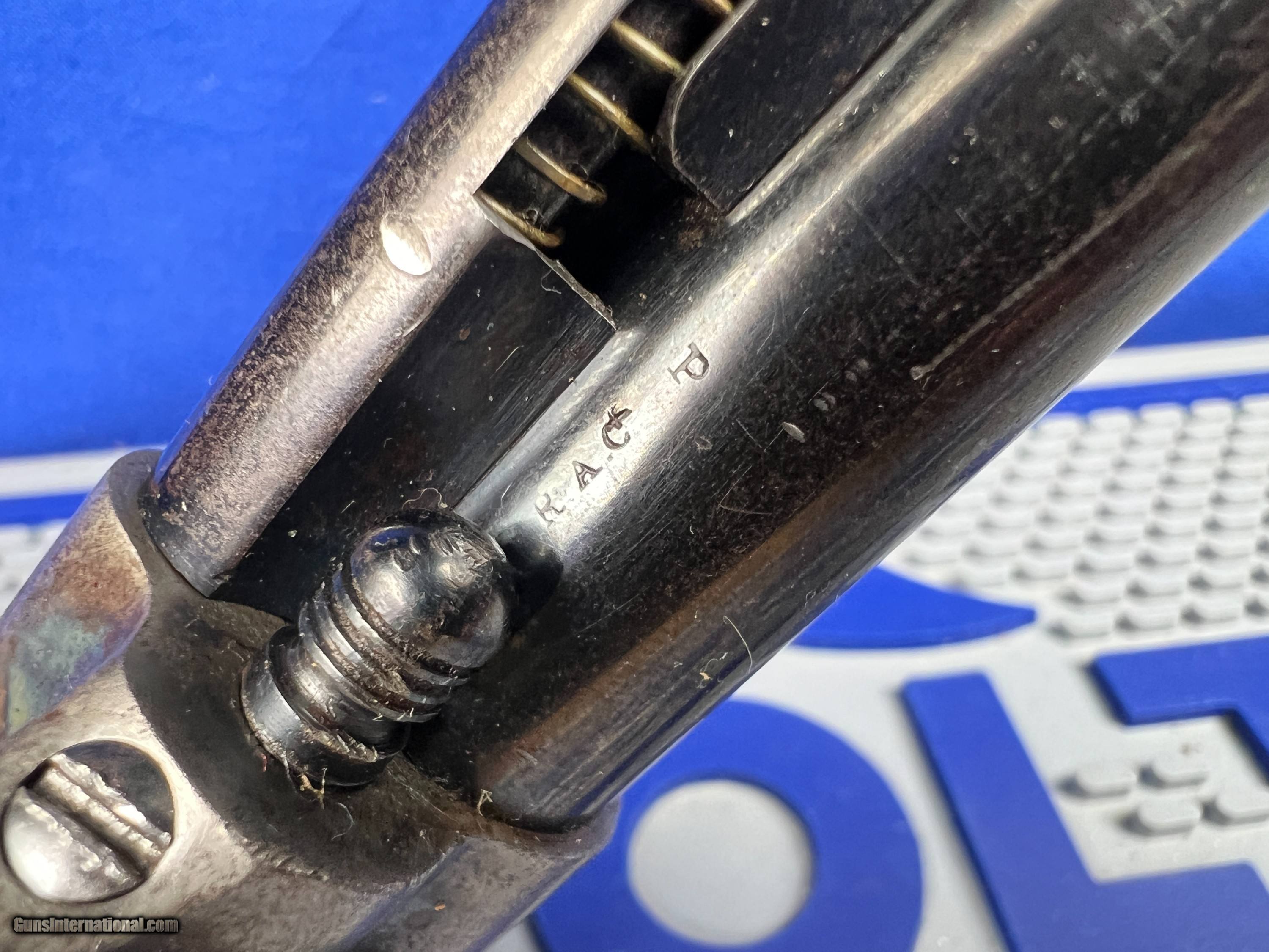 Description: Colt Single Action U.S. Artillery Model 1st Generation Black Powder Frame 45 Colt 5.5in Description: The Colt Single Action Army, or "SAA" revolver is doubtless the classic sixgun most associated in our folklore with the American West. Introduced in 1873, the basic design remained with a few interruptions in production and is manufactured today by Colt and other firms. U.S. military-purchased SAAs are among the most eagerly sought-after historic sidearms of the era, having been used from the Indian Wars into the early 20th Century by the U.S. Army. They were originally issued with 7 1/2" Barrels in .45 Colt. Between 1895 and 1903, the government had nearly 17,000 of its SAAS reconditioned and rebuilt by the Springfield Armory and the Colt factory. Most of these guns had the barrels shortened to 5 1/2". Since most guns were reassembled without concern for part numbers, this is one of the few collectible gun variations that is considered "correct" with mixed serial numbers, meaning that the various parts of the gun will usually not match each other. These refurbished revolvers were issued to troops in the Spanish-American War and Philippine Insurrection, and have been nicknamed "Artillery Models" by collectors since a few of them were issued to Artillery units. The original long-barrel variations are distinguished by the "Cavalry Model" nickname and should generally have matching serial numbers. Both types will have the "U.S." stamped on the frame, along with the inspector's initials on various parts. Make: Colt Model: 1874 Single Action Army Artillery Model, 1st Generation, Black Powder Frame Serial Number: 10088 Year of Manufacture: 1874 (://colt/serial-lookup) Caliber: .45 Colt Action Type: Single Action Revolver with Side Loading Gate Cylinder Markings: The left side of the frame is marked "PAT. SEPT 19. 1871. /" PAT. JULY 2. 1872. " and with "U.S". The top of the barrel is marked "COLT'S PT. F.A. MFG. CO. HARTFORD, CT. U.S.A.". The underside of the frame at the trigger guard is marked "10088" and the bottom of the trigger guard is marked "139109/K". The bottom of the backstrap is marked with "3136". The rear of the loading gate is marked with an assembly number "508". The outside of the cylinder has markings. One appears to be a partial serial marking and the other an inspector's initials marking. The rear face of the cylinder is marked "K". The hammer slot is marked "C". The bottom of the barrel is marked "P" and "RAC", facing different directions. The bottom of the grip is marked "RAC" on the left side of the back strap. Barrel Length: The barrel is 51⁄2". Sights / Optics: This revolver is mounted with a "V" notch in the top strap for rear sight and a quarter-round blade front sight fixed to the barrel. Stock Configuration & Condition: The grip is one-piece walnut. The bottom has a "RAC" cartouche on the left side of the back strap. There are some light handling marks but no chips or cracks. Overall, the grips are in Very Good condition as seen in the pictures. Type of Finish: Blue & Case Color Finish Originality: The finish appears original. It most likely went through factory refurbishment. This refurbishment frequently involved installation of non-serial matching parts and this is likely the reason for the non-matching parts on this revolver. We don't see any signs that the revolver has been refinished since this refurbishment. Bore Condition: The bore is bright with well-defined rifling. The condition is rated excellent. Overall Condition: This revolver retains about 30+% of its current metal finish. The most remaining finish is in protected areas such as around and under the ejector housing, at the rear of the barrel where it enters the frame, the corners formed by the trigger guard where it widens to meet the frame, the rear face of the cylinder and at the top of the backstrap behind the base of the hammer. The frame shows scattered remaining case color, also mostly in protected areas such as the face of the recoil shield, the loading groove, and the pinched area at the front under the cylinder pin. Most of the exposed areas which were blued have gone to a moderate patina with some grip areas worn to white. There are some scattered light nicks, scuffs, and scratches with infrequent spots of minor surface erosion. The cylinder has a turn-line. The rear face of the cylinder has a ring of wear between the chambers at the location of the firing pin, but the firing pin is intact. The grip screws range from sharp to disfigured with usable slots. The markings range from clear to worn and incomplete. The revolver is in Good condition as Antique (see Mechanics). Mechanics: Lockup is tight with no slipping. The trigger is crisp. Overall we rate mechanics as excellent. We have not fired this revolver. As with all used firearms, a thorough cleaning may be necessary to meet your maintenance standards. Box, Paperwork & Accessories: This firearm does not include a box, paperwork, or any accessories. Price: $6500 SOLD Handgun Caliber: .45 Colt Manufacturer: Colt Model: SAA Serial Number: 10088 |