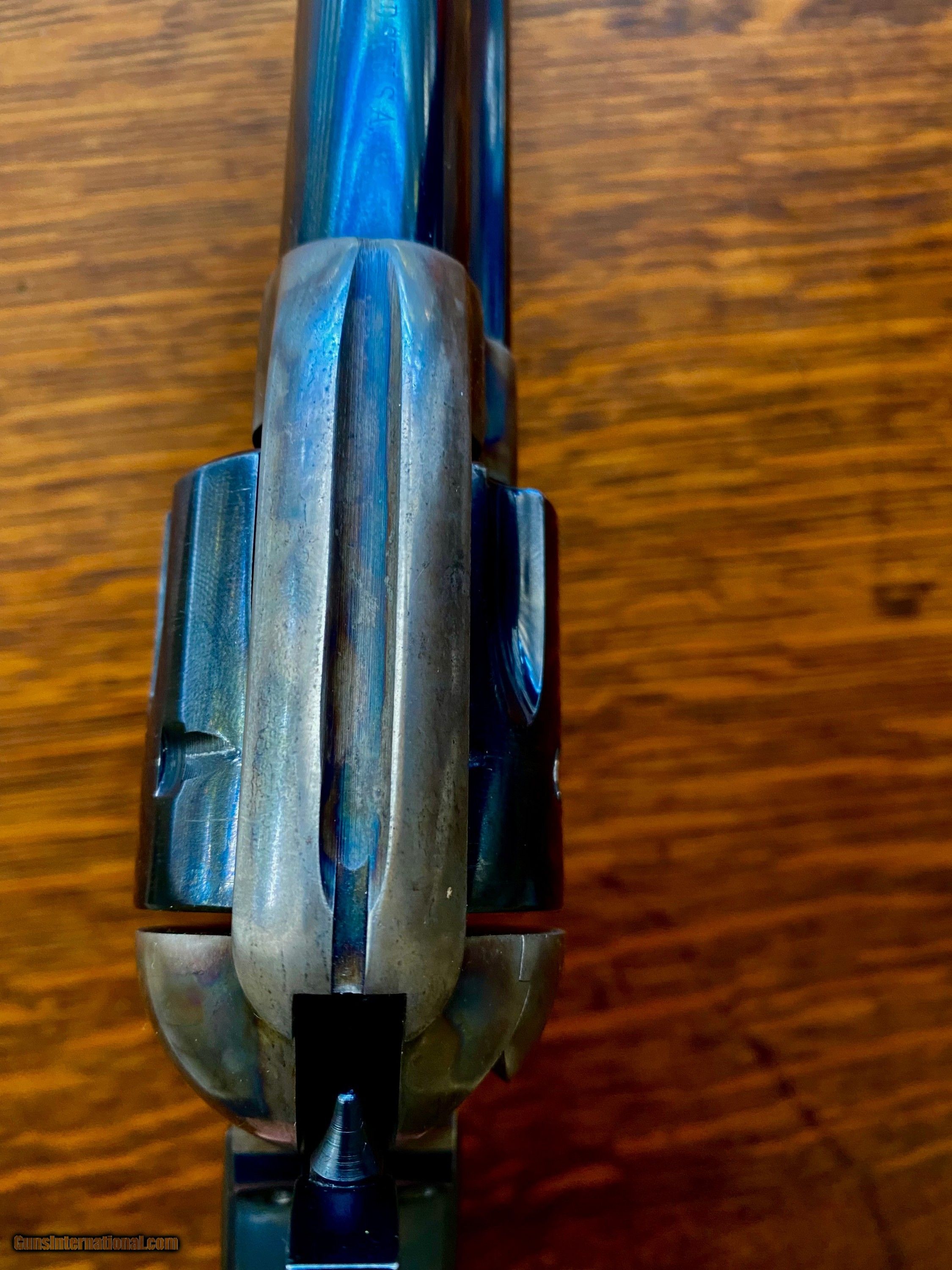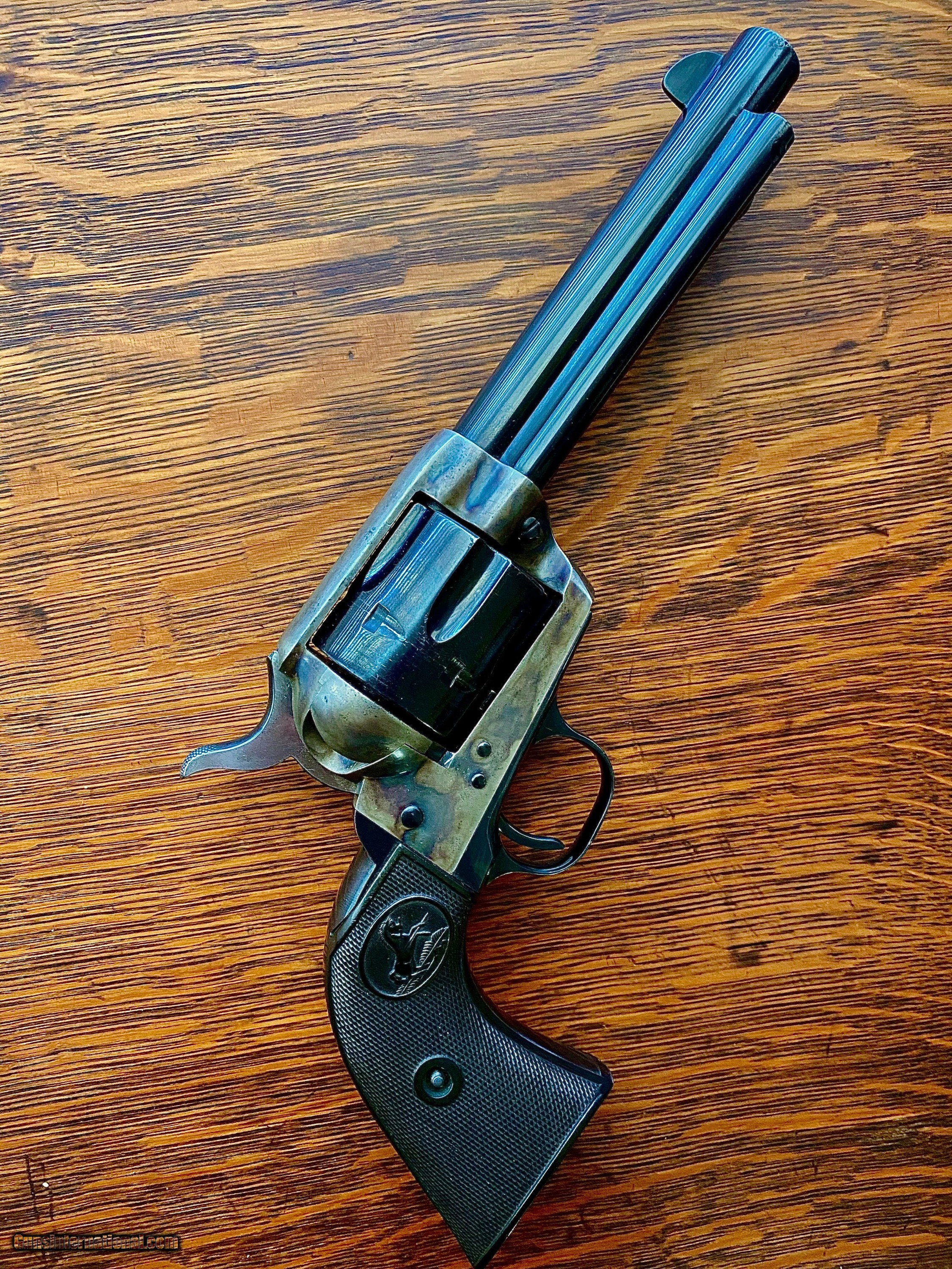Description: Highly sought after original condition, collectible early 2nd year (1957) model of Colt's Second Generation production run. Colt Single Action Army in 45 Caliber has a 5 1/2 inch barrel, vivid case color hardened finish and crisp checkered Rampant Colt hard rubber grips with all matching numbers. SOLD Handgun Caliber: .45 Colt |