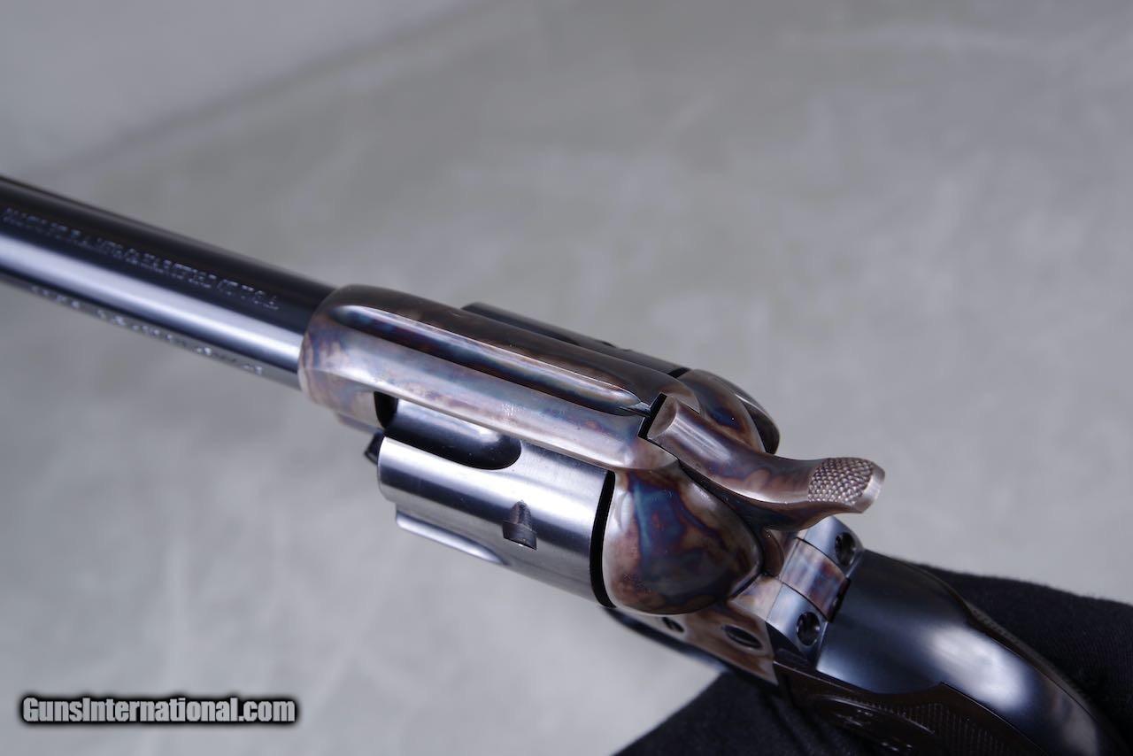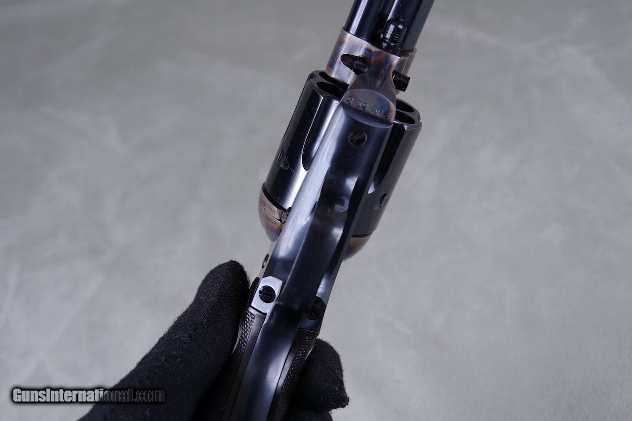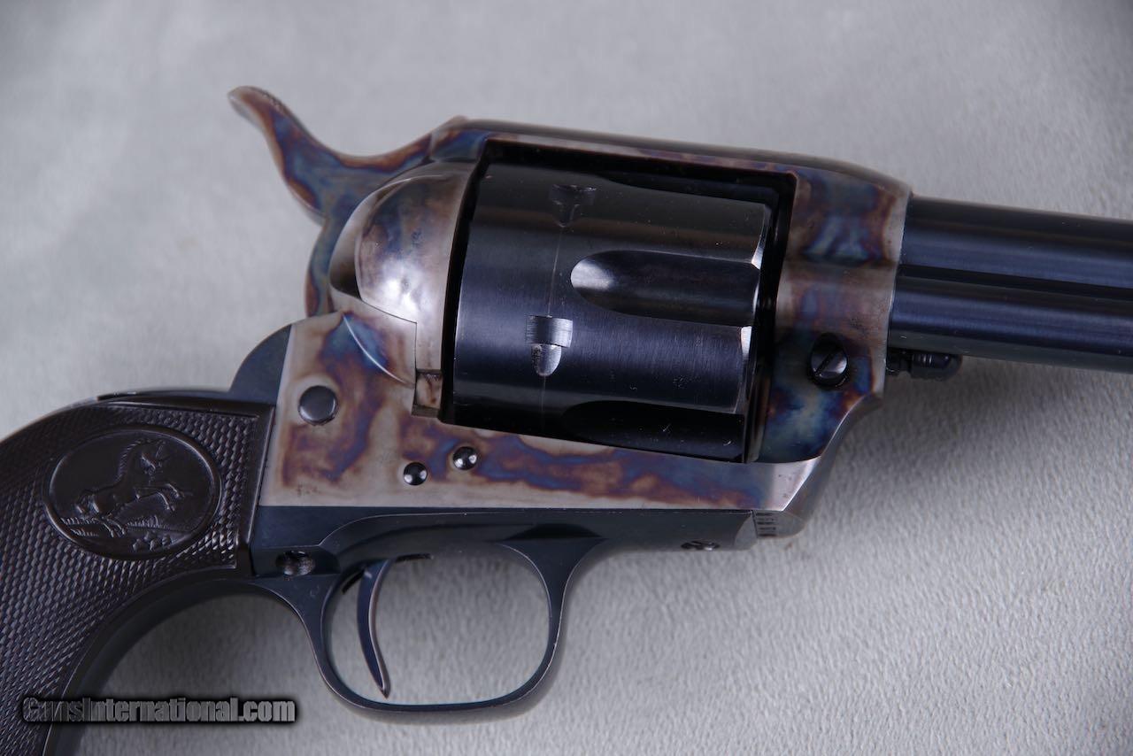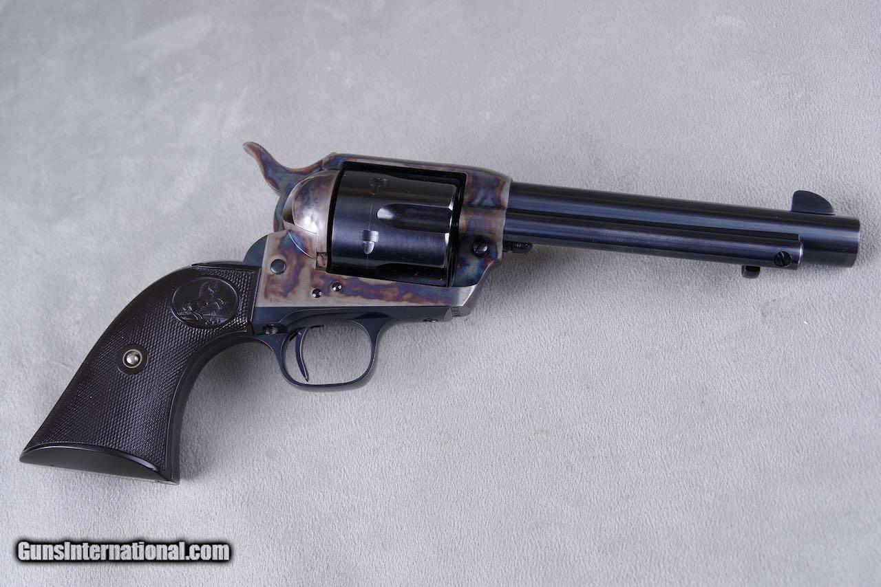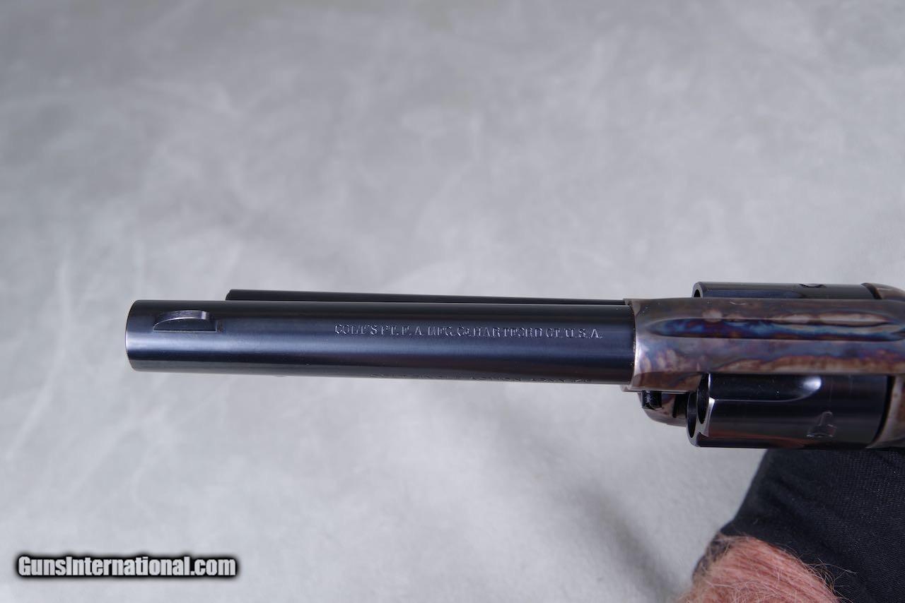Description: 1930 Colt Pre War SAA chambered in 45LC with a 5.5 inch barrel and blue/color cased finish. Per the included Colt archive letter it was shipped June 26, 1930 to Philadelphia, Pennsylvania in a one gun shipment. This is a collector grade gun and it is one of the finest Pre War single actions that you will ever see. All numbers match on the frame, grip frame, cylinder, and grips. The original bluing still retains all of its deep dark shine throughout. The color casing is brilliant. As seen in the photos there is only the very slightest of superficial handling and overall the finish rates 99%+. The bore is bright and shiny with strong lands and grooves. All four clicks are crisp and the lock up is tight. The grips are exceptional with sharp checkers throughout. Condition wise this one's going to be tough to upgrade. SOLD Curio/Relic: Yes Handgun Caliber: .45 Colt Manufacturer: colt Model: saa |
