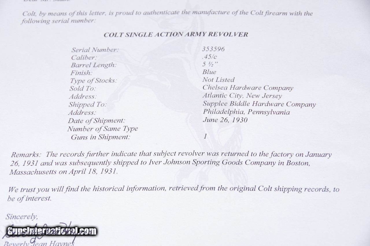 Exceptional 1930 Colt Pre War SAA 45LC 5 1/2'' Blue/CC with Factory Letter