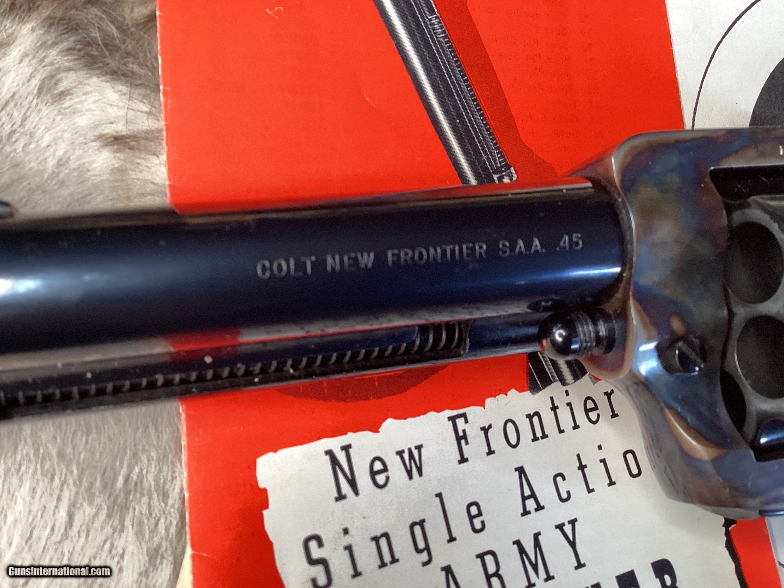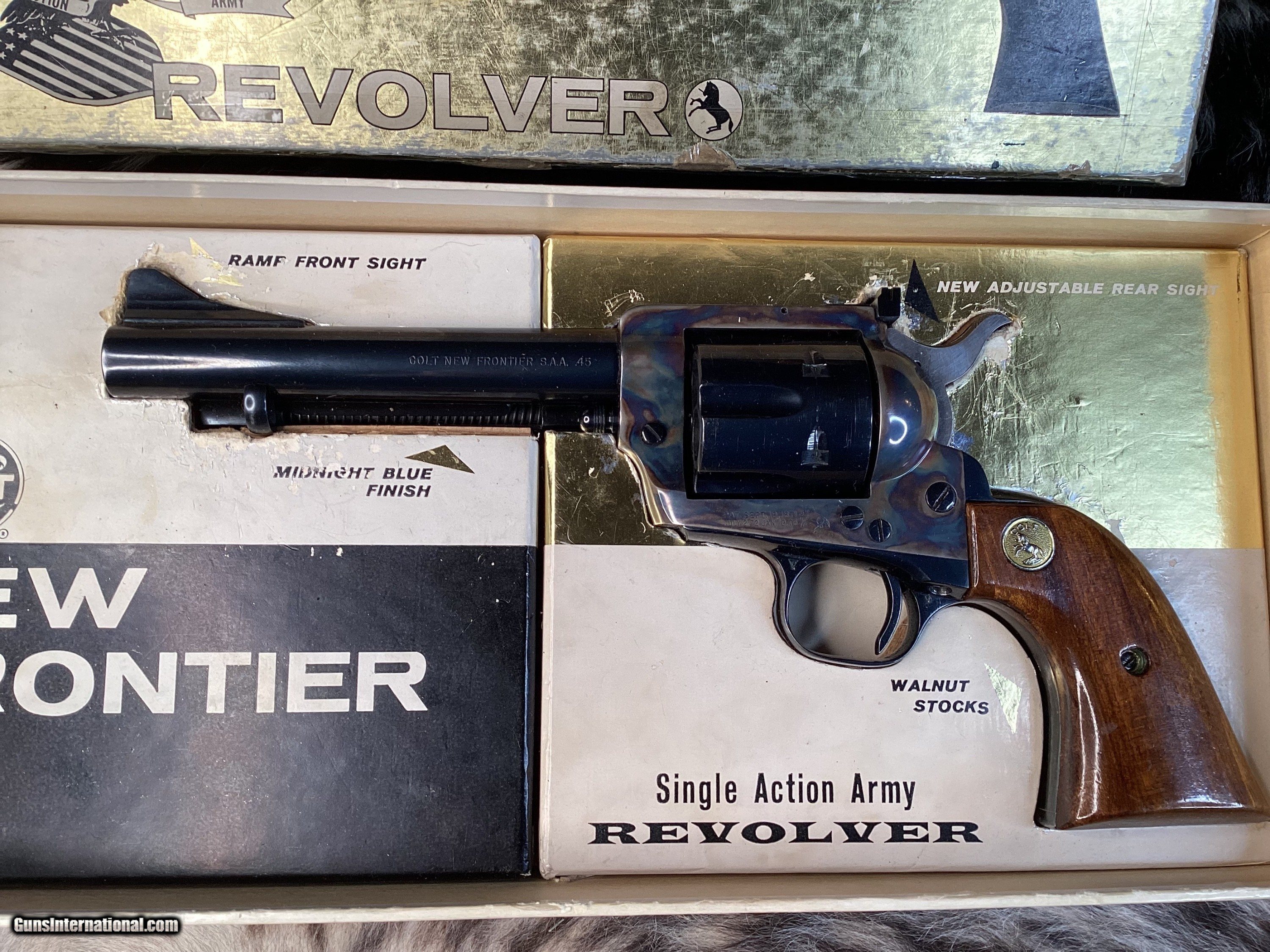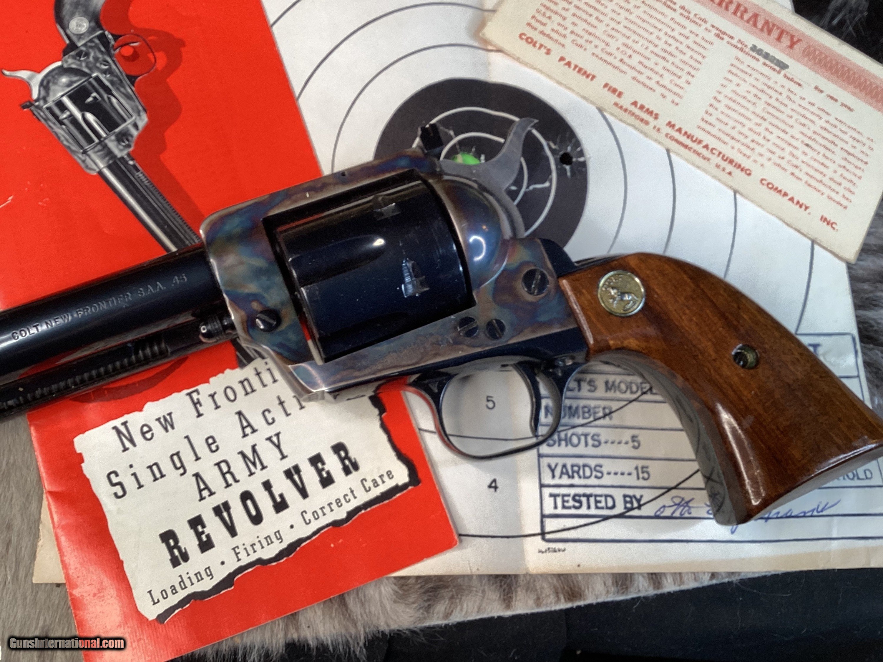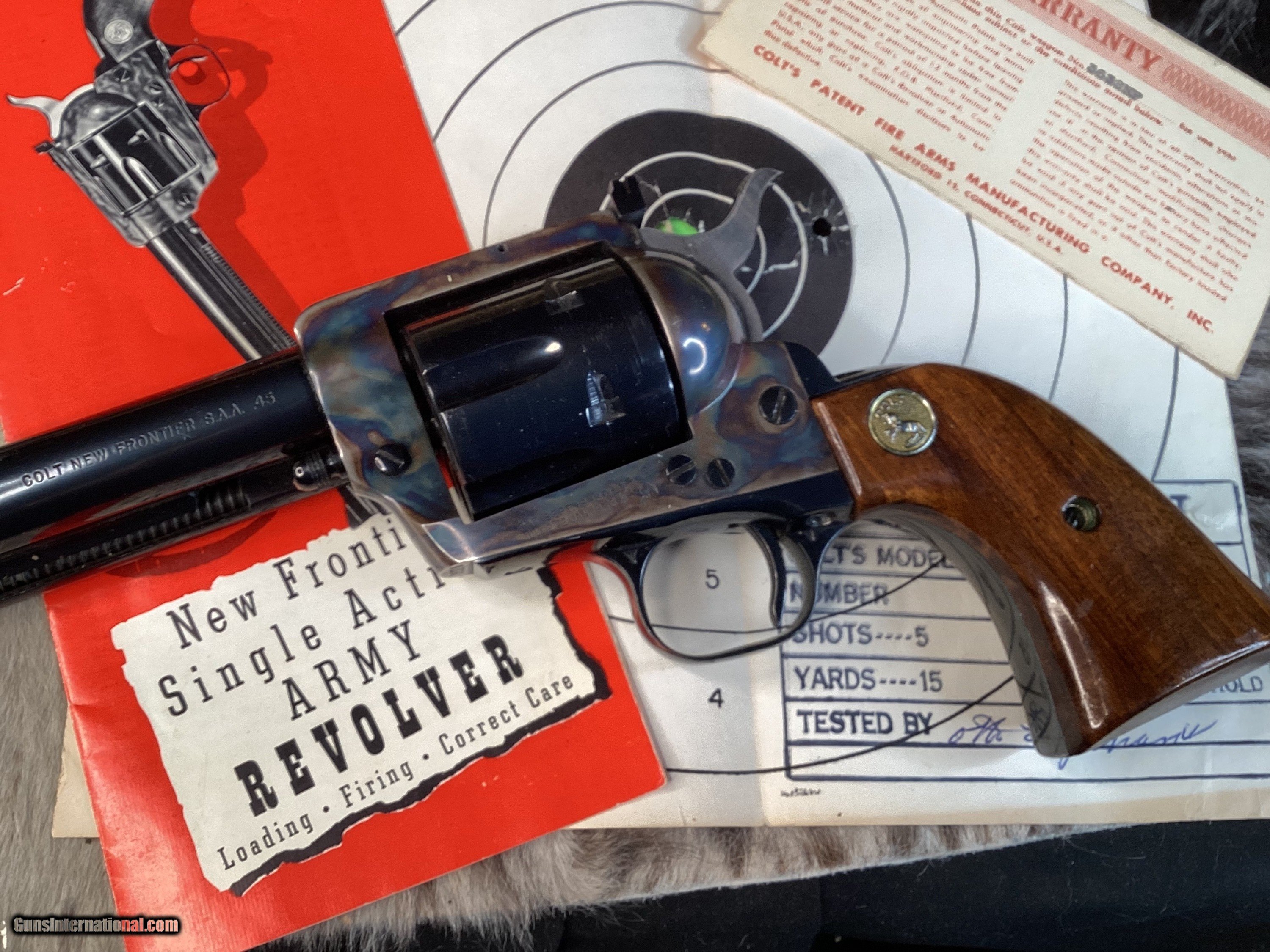 First year production Colt New Frontier Single Action Army Revolver. Built in 1962 with a 5 1/2″ barrel and smooth Walnut grips with Colt medallions. This has an adjustable rear sight, and ramp front sight. This has a beautiful case hardened frame and blue remainder. The blue rates 99% and the bore is Excellent. This is in the rarely seen black and gold cardboard box with manuals and test target, hang tag, and screwdriver. Only 1625 were made in .45 Colt.