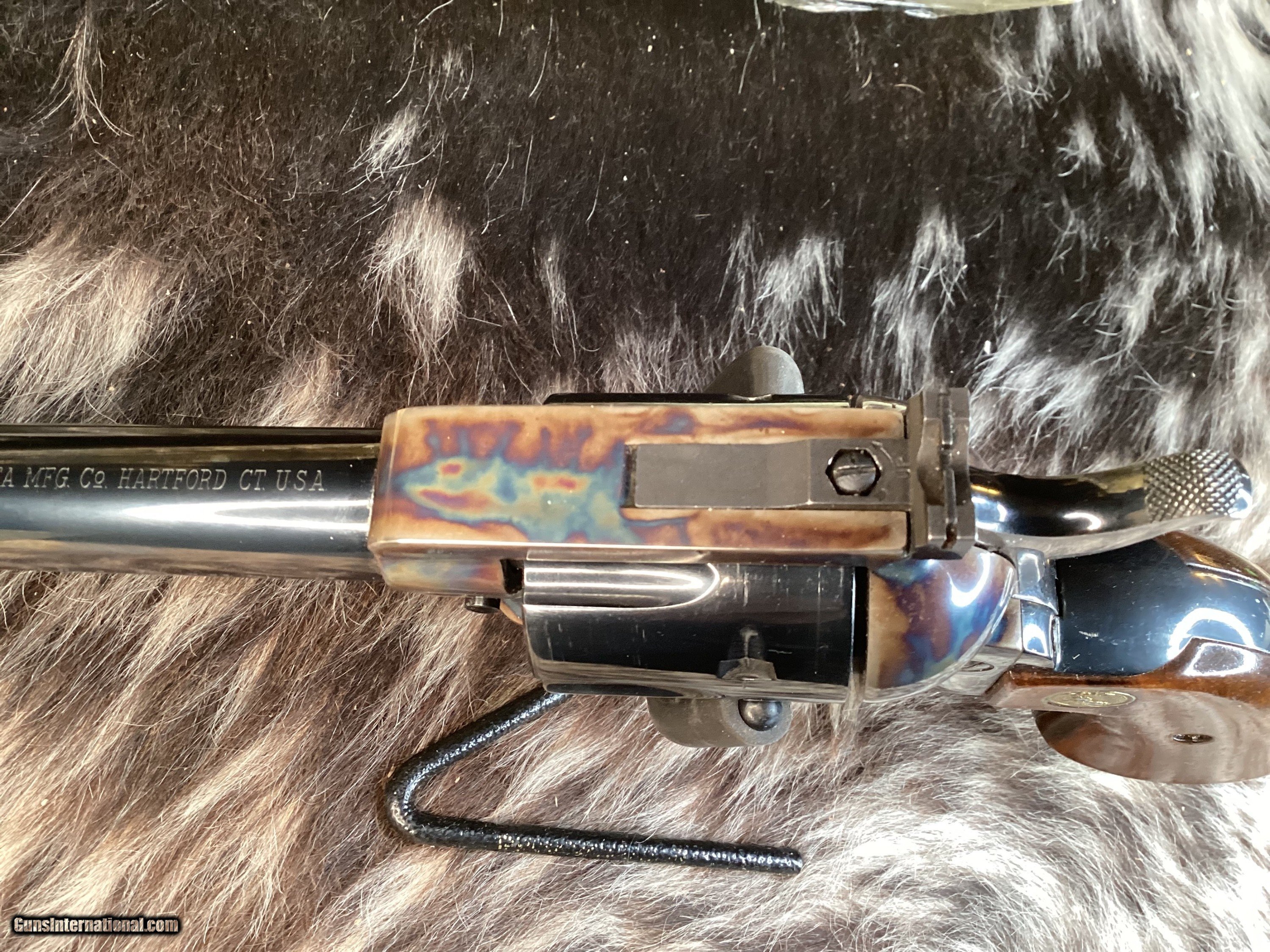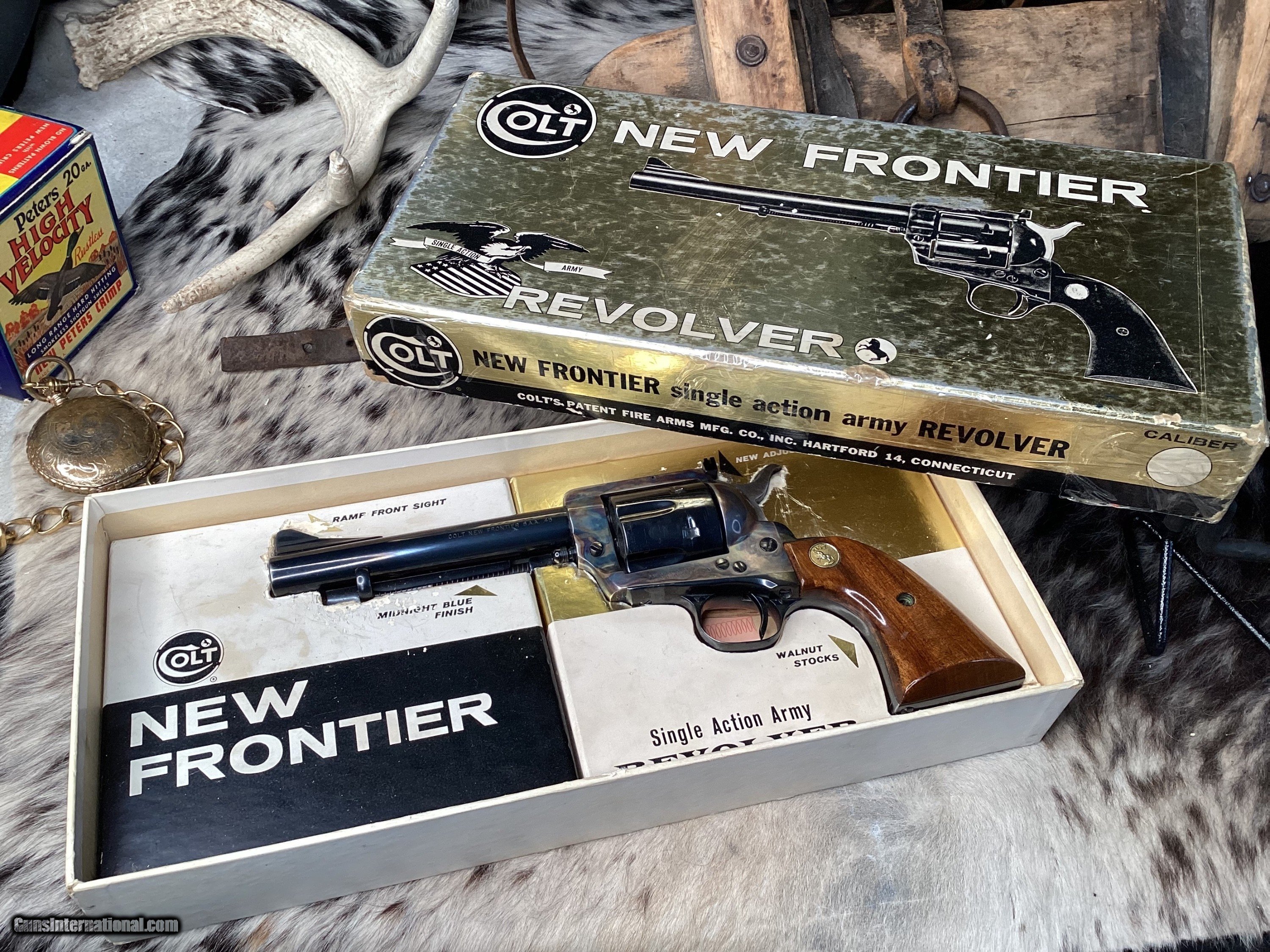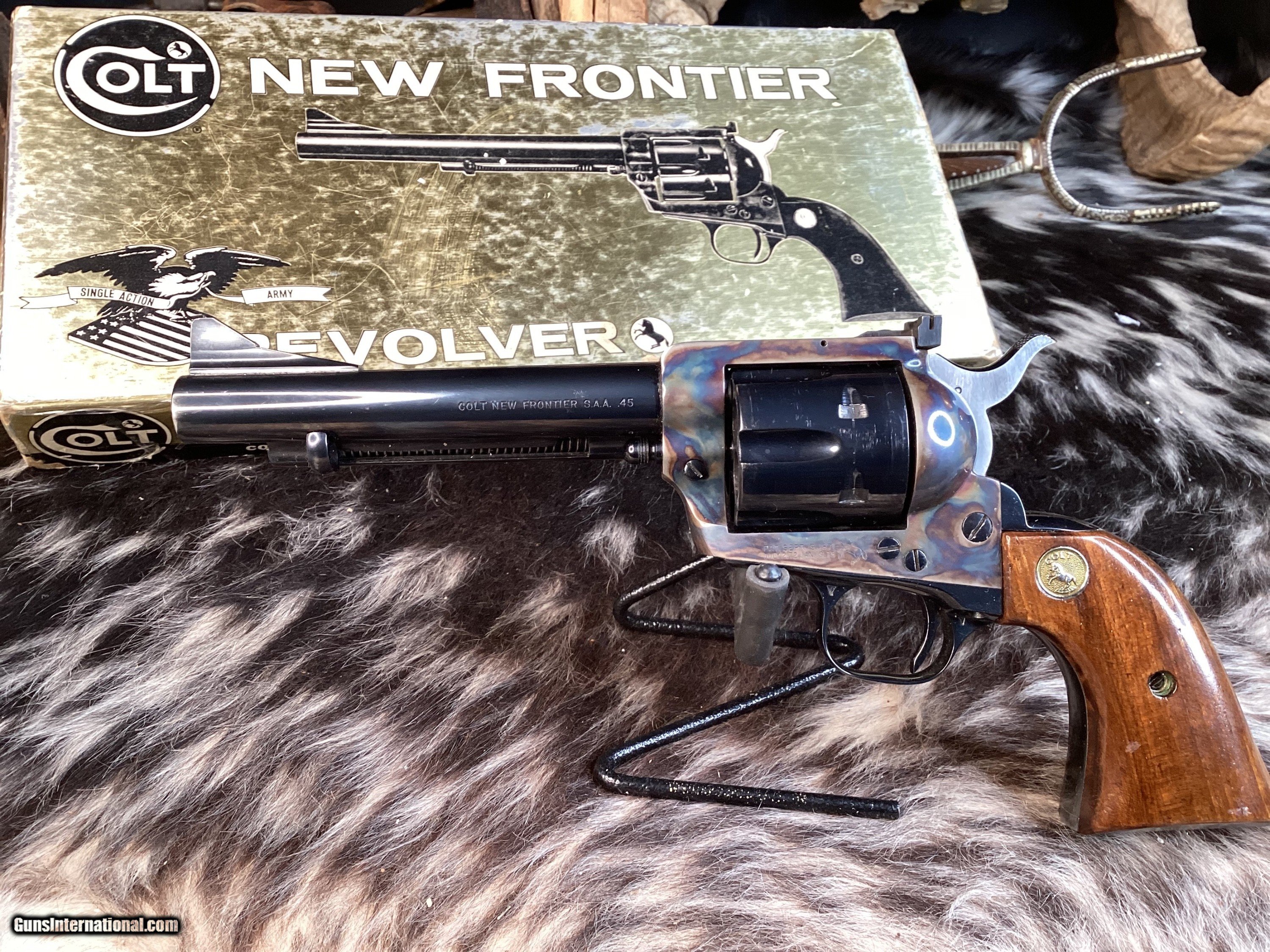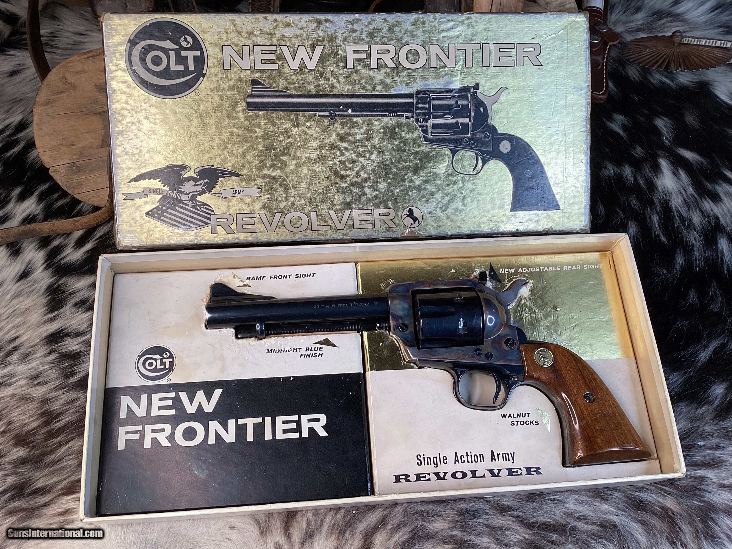 First year production Colt New Frontier Single Action Army Revolver. Built in 1962 with a 5 1/2″ barrel and smooth Walnut grips with Colt medallions. This has an adjustable rear sight, and ramp front sight. This has a beautiful case hardened frame and blue remainder. The blue rates 99% and the bore is Excellent. This is in the rarely seen black and gold cardboard box with manuals and test target, hang tag, and screwdriver. Only 1625 were made in .45 Colt.