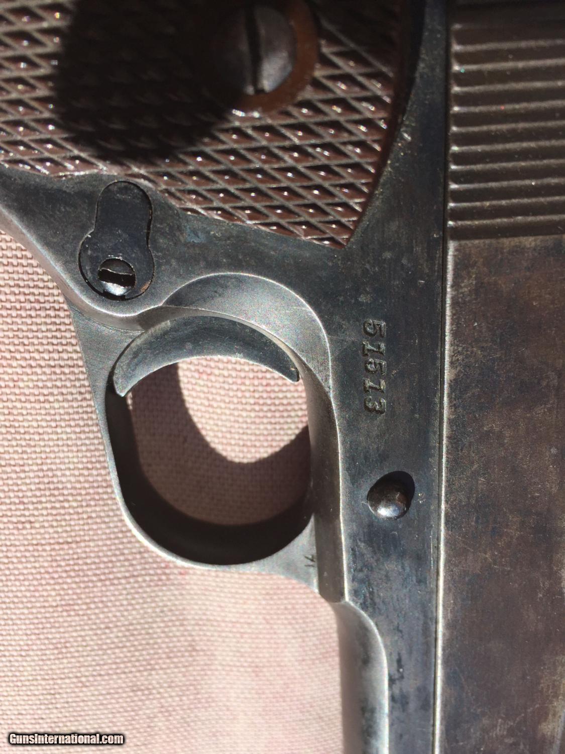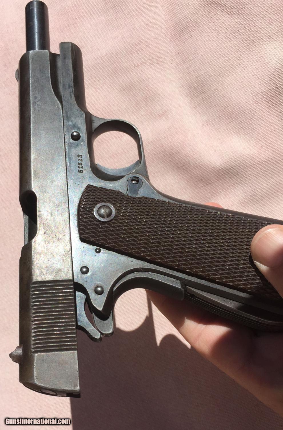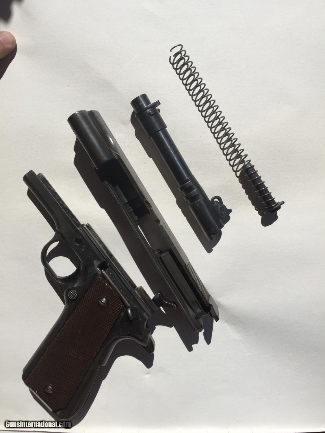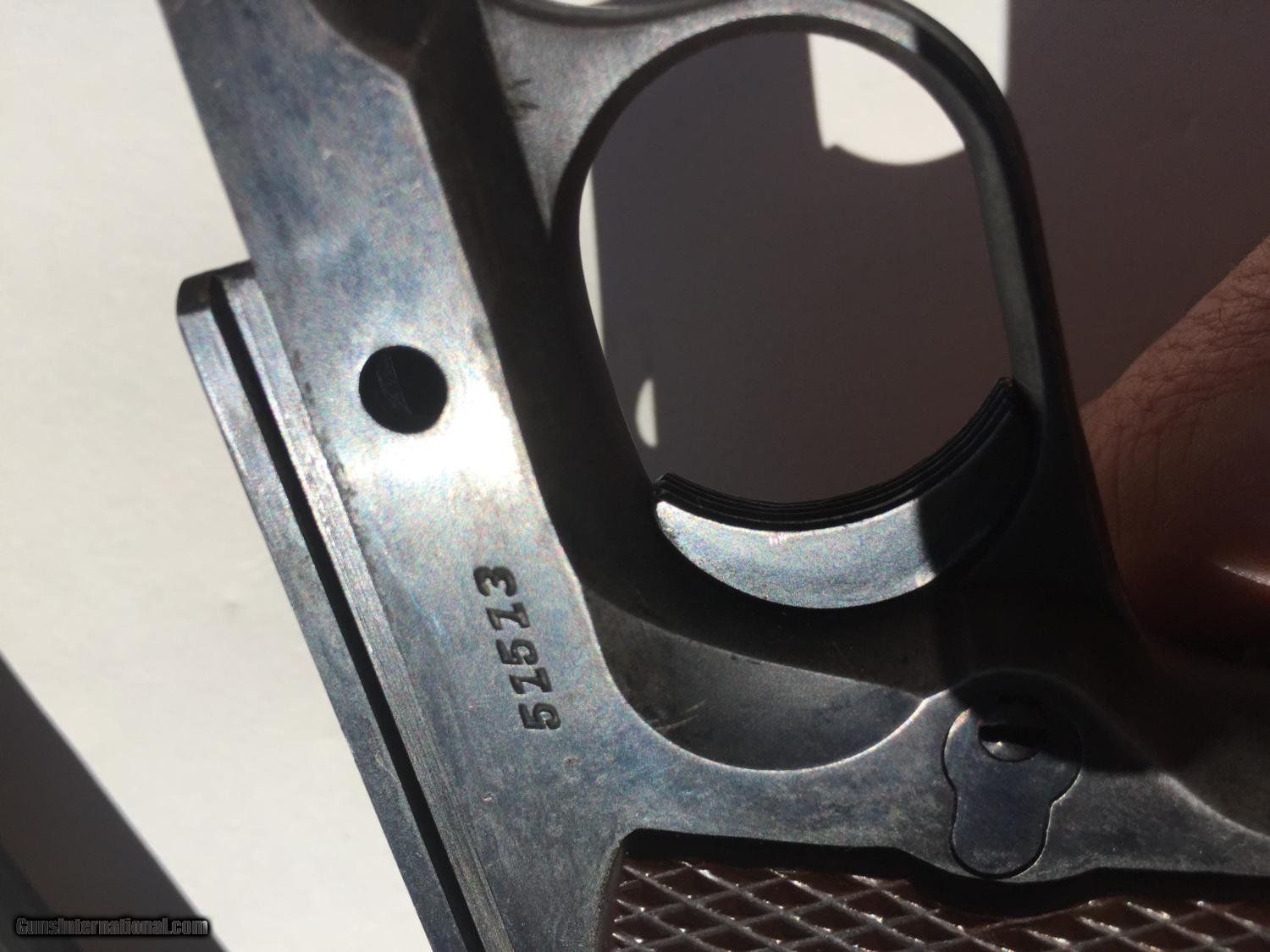 Description: I have been told this is :Colt .38 super frame and a WW2 Remington slide. An original Colt .45 frame with a five digit number would be too early for this type of frame (it's an A-1 frame) but the .38 super frame with a five digit number would be a 1930s frame. This is a piece of classic american gun history, but while not a US Military piece, it still has significance in the time it was produced. Pros: - Great project gun or to part out - Originals Low serial, no scratching off or buffing out marks - A solid gun and has been to the range before in last 5 years. - No cracks, damange or rust - Comes in neat wooden display box Cons: - Some non matching parts from a collecting perspective - Not stamped for US ordance - No parkenizing apparent, I cannot tell if it was refinished Please buy this from me to add to your collection! I'm willing to trade w cash for the right deal, looking mainly for pistols, S&W, etc. Otherwise, I'm open to offers and opinions :) SOLD Curio/Relic: Yes Manufacturer: Remington-Rand Model: 1911 Serial Number: 51513 Caliber Info: .45 Chambers: 1 Ejectors: 1 Condition: Used Action: Auto Triggers: 1 Manufacture Date: 1944 |