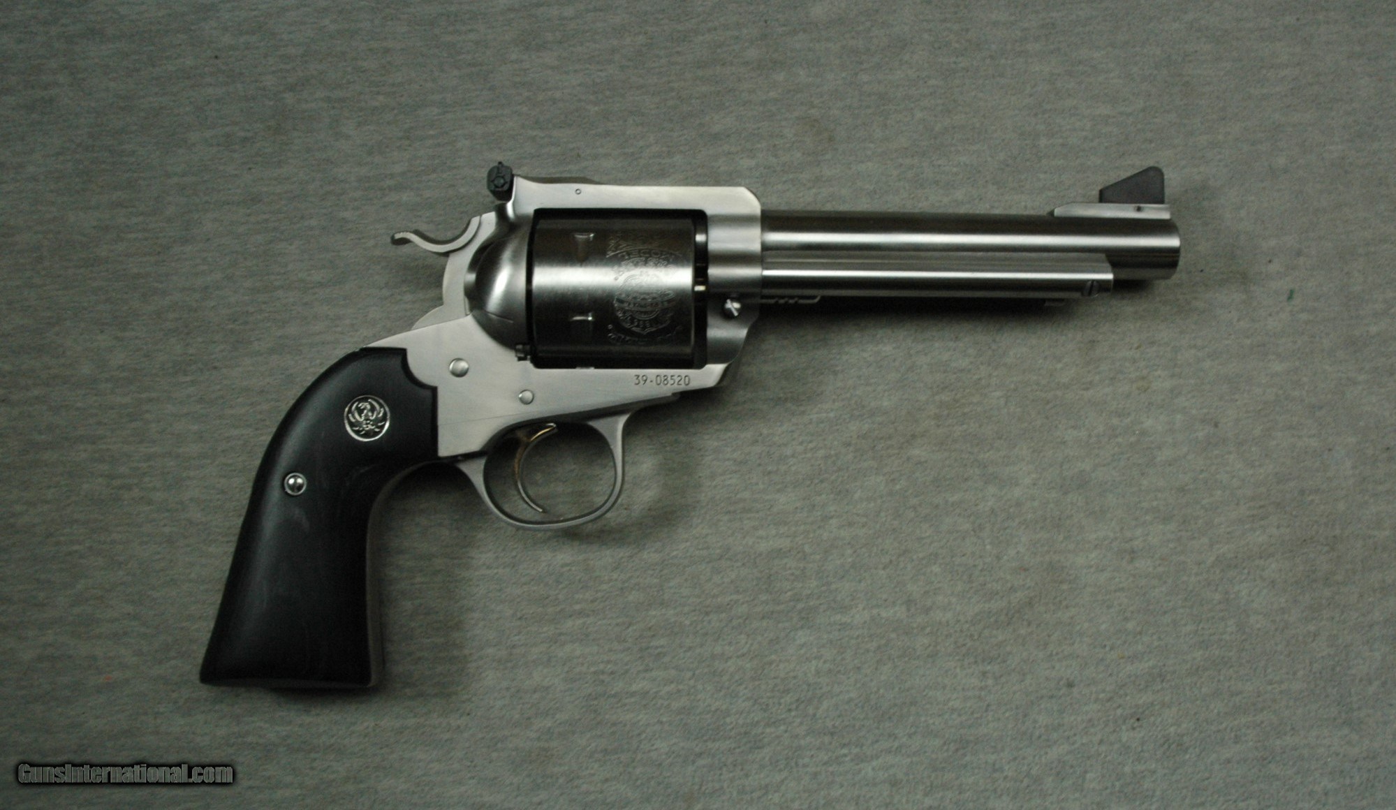 Description: Ruger New Model Blackhawk Bisley Convertible Model chambered in .45 Colt/.45 ACP. This revolver has traditional western styling with a hand-filling grip that has long been acknowledged as one of the most comfortable and natural-pointing of any grip style. It has a transfer bar mechanism and loading gate interlock that provides an unparalleled measure of security against accidental discharge. It has durable coil springs throughout for maximum reliability. It features a fixed ramp front sight and an adjustable rear sight. The cold hammer-forged barrel results in ultra-precise rifling that provides exceptional accuracy and longevity. The Bisley model has similar features of the Colt Bisley such as trigger, hammer, and grip modifications. This revolver is as new in box with 2 cylinders. .45 Colt SOLD Metal Condition: As new in box Wood Condition: As new in box Bore Condition: Bright Barrels: 5 1/2 Inches Triggers: Factory Weight: 2 lbs 14 oz Item Location: La Vista, NE |