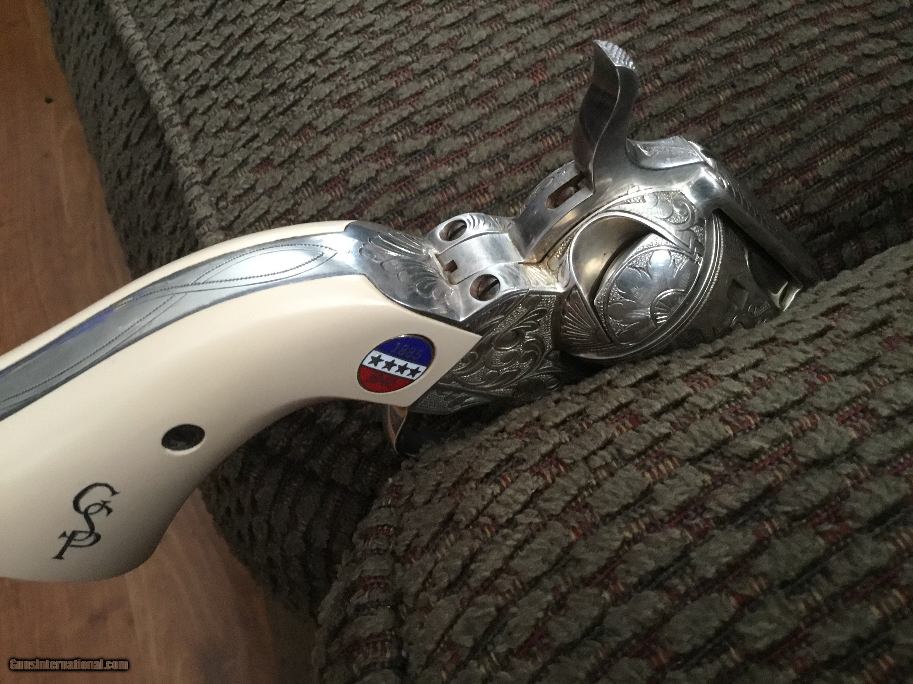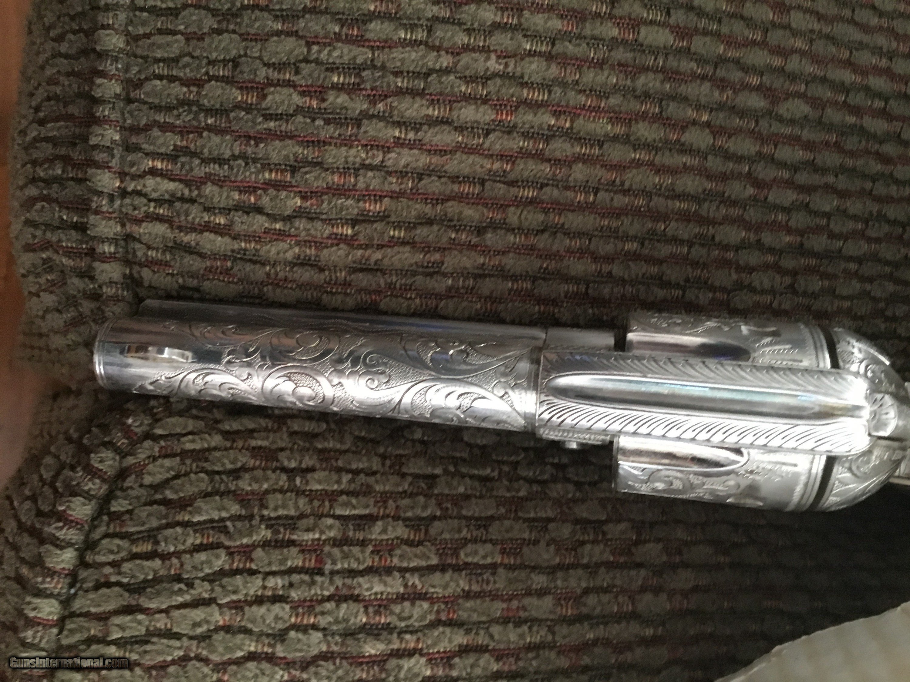 Description: 1980 George Patton replica made by uberti......factory engraved and silver plated...99%. In the original shipping carton....fired 12 times cleaned and put away....shipping $25...engraving is better than any I have ever seen including the old German masters in late 1800s..... SOLD |