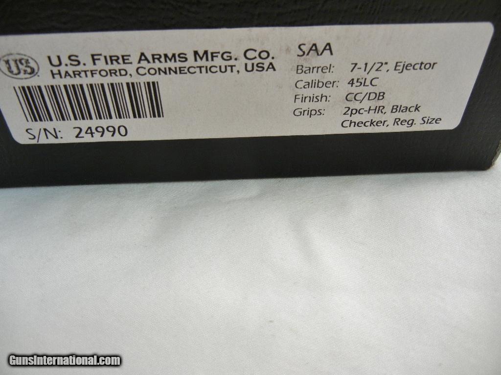 Description: This is a USFA SAA 45LC with a 7 1/2 inch barrel. This gun is 100% new in the box. Serial # is 24xxx. Buyer pays 45.00 shipping. Thank you. 38-3-2 SOLD |