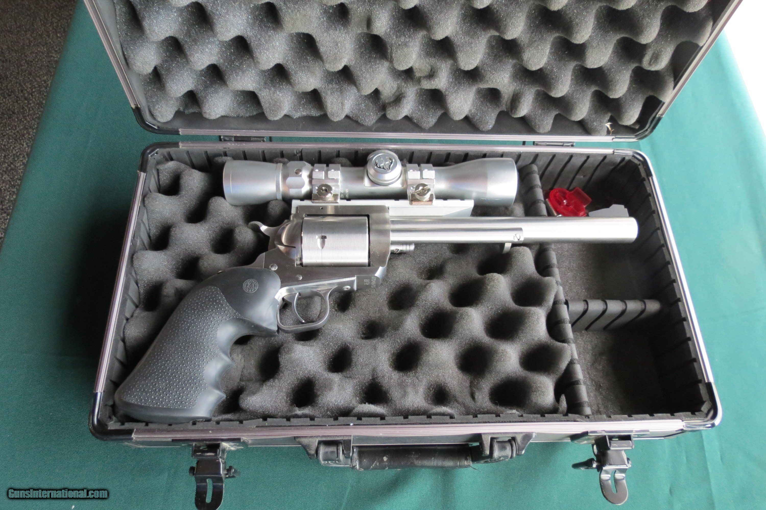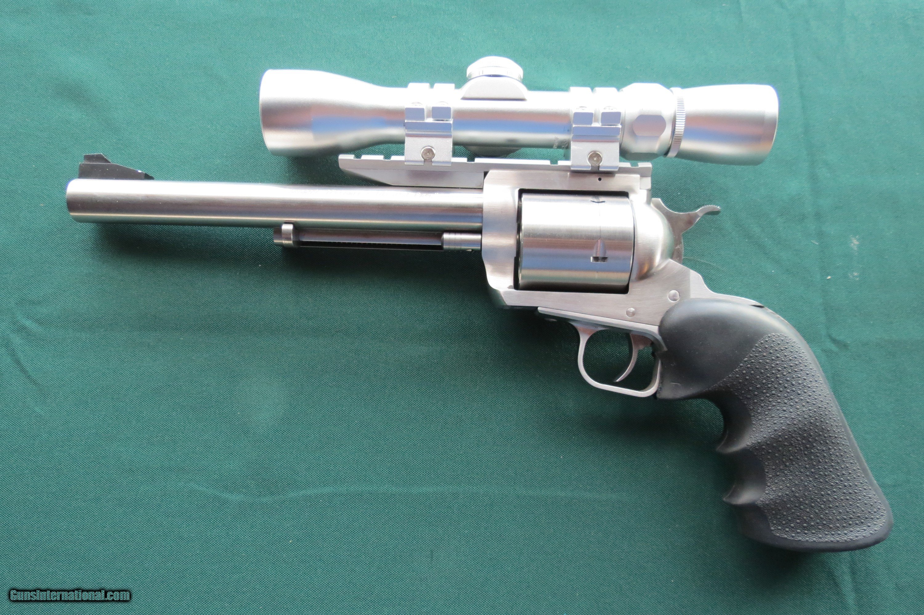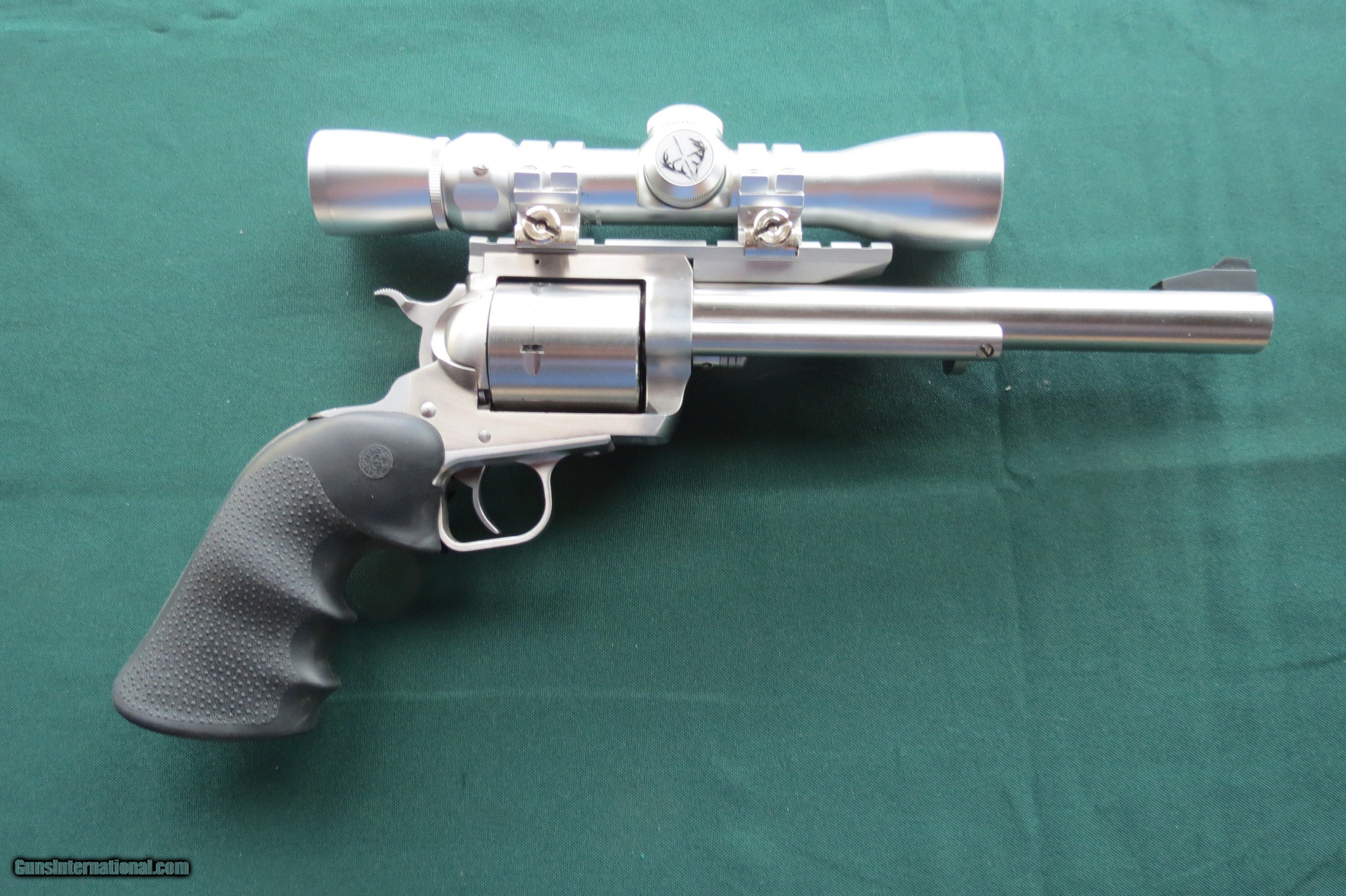 Description: Magnum Research BFR Revolver in 454 Casull. Brushed Stainless steel metal finish, 7.5" Barrel, 5 shot cylinder, Single action, 2 sets of grips, 2X6 Bushnell scope, Rear sight in case, Hard case. Revolver shows to be in very good condition with little usage. Shippping/insurance $40 SOLD Handgun Caliber: .454 Casull Manufacturer: Magnum Research Model: BFR Barrel Length: 7.5 Condition: Very Good |