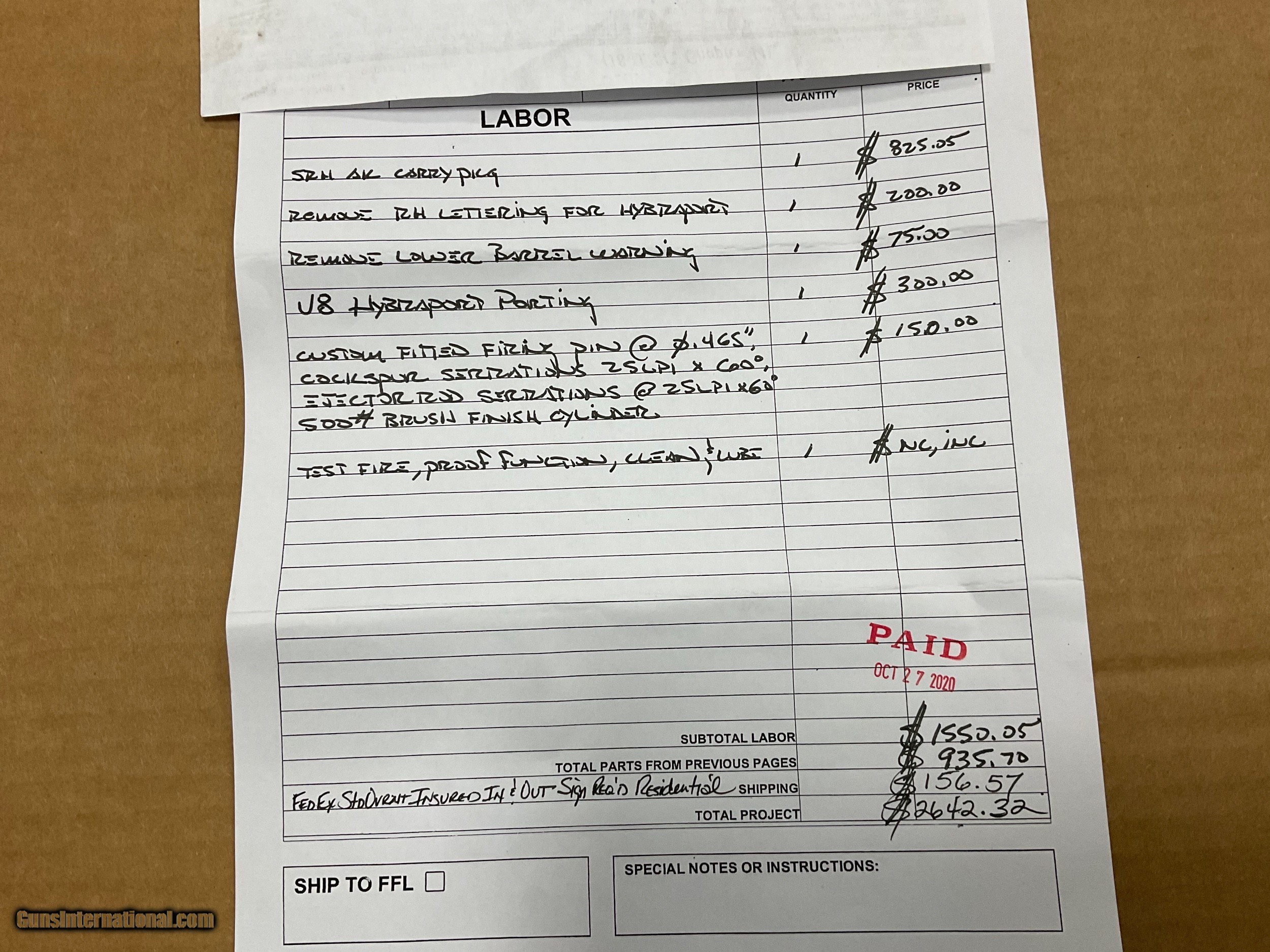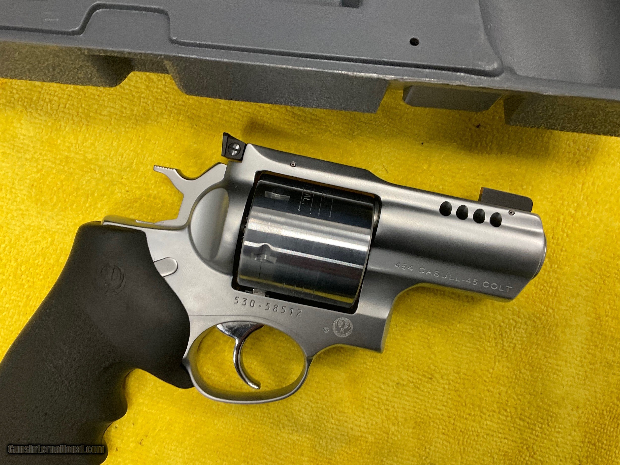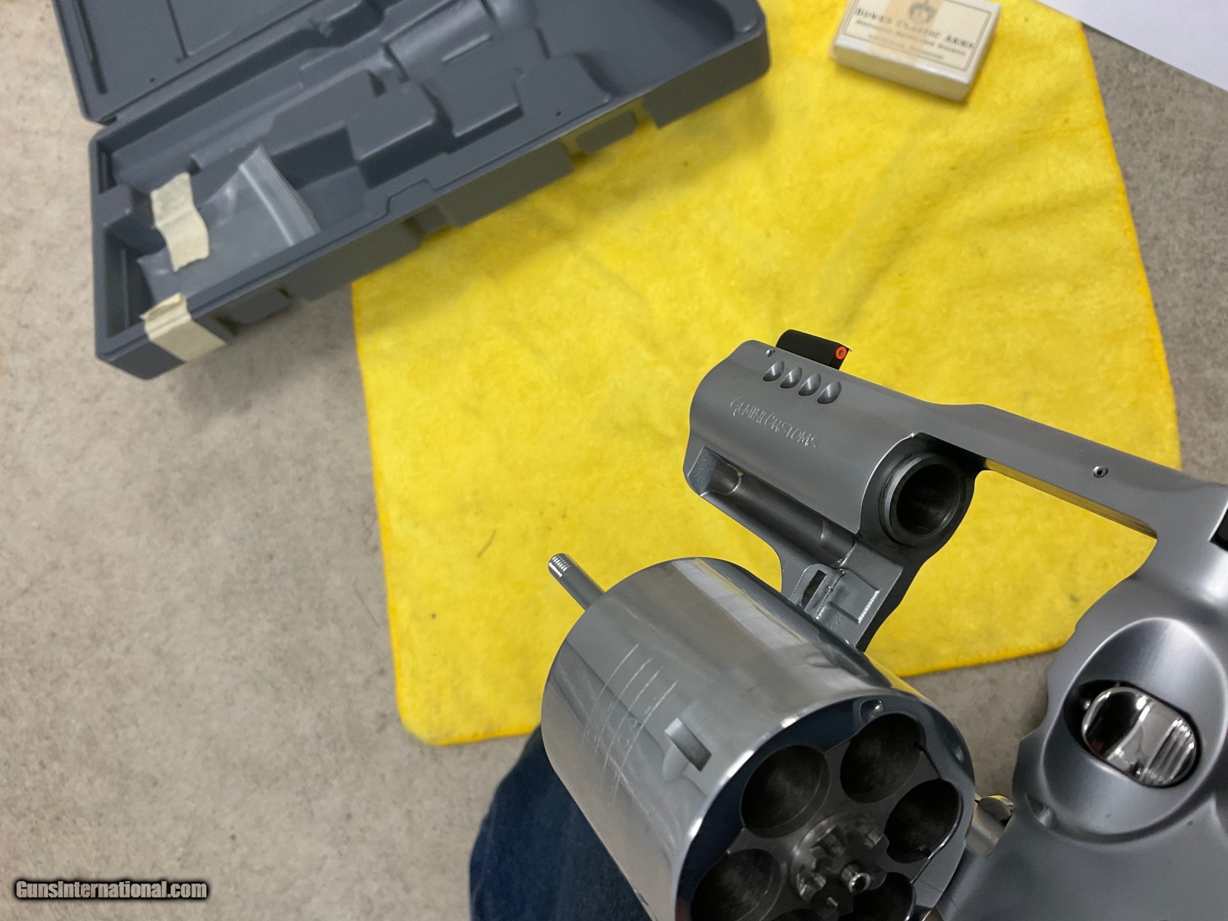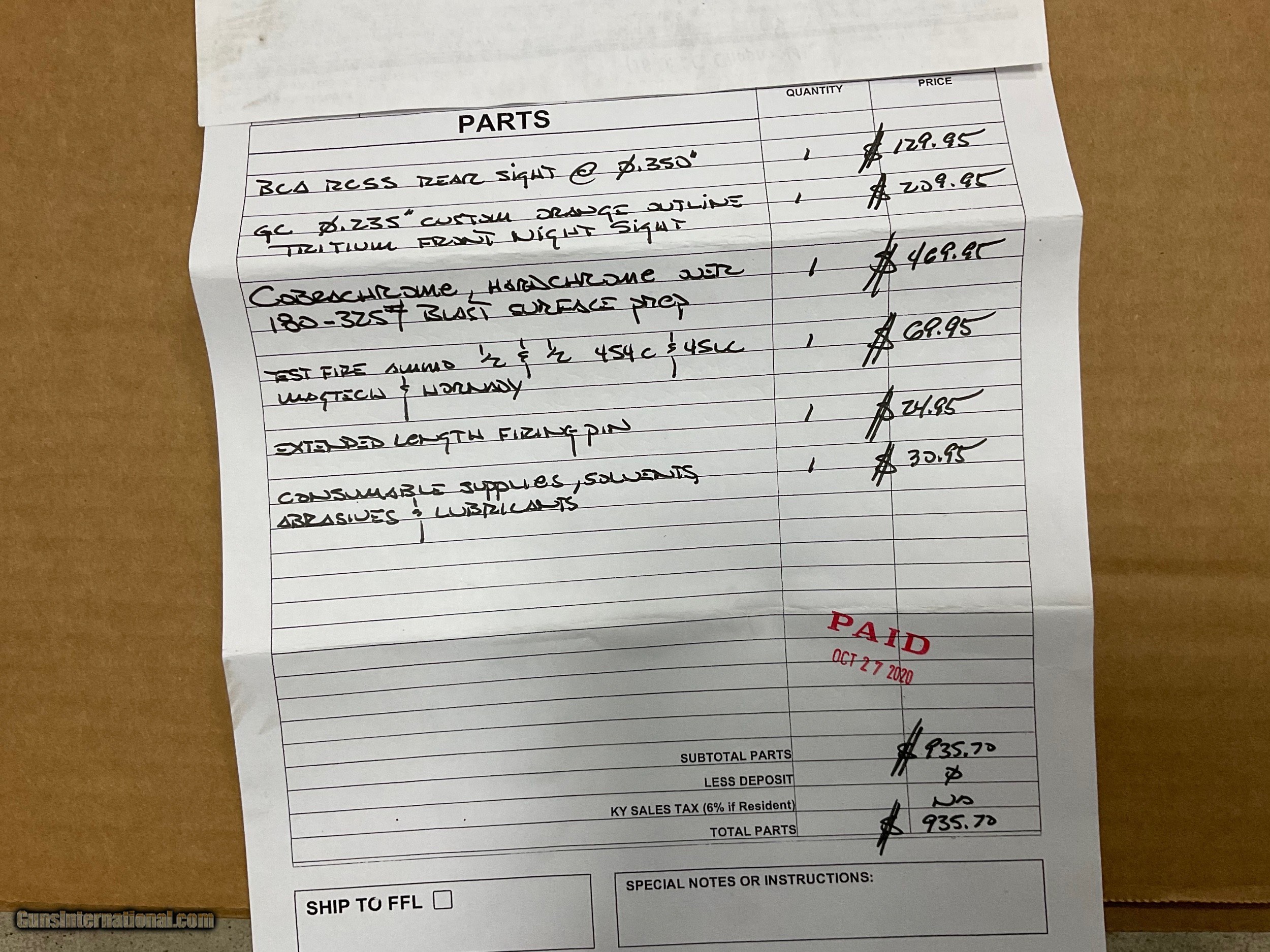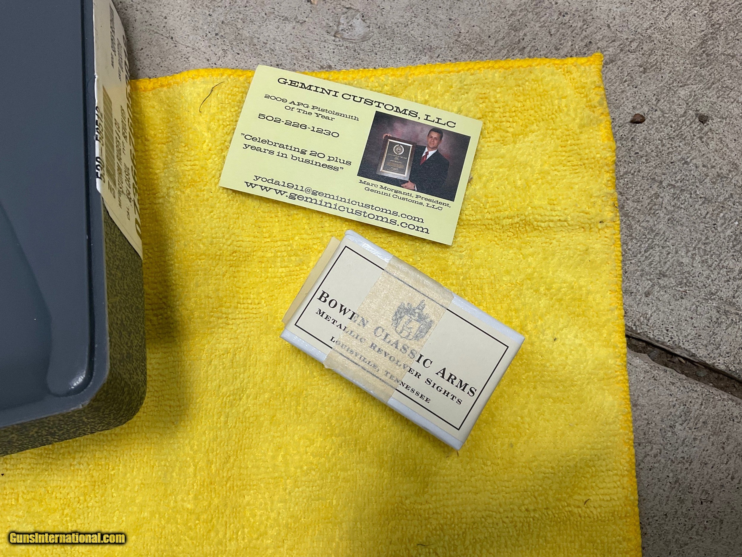 Description: This gun was sent to Gemini Customs and they performed 2600.00 dollars worth of custom gunsmithing services including HybraPort porting to reduce muzzle flip. The action is super smooth with a double action pull of 9 pounds and a single action pull of 2.25 pounds. It also has bowen sights installed. If you purchased this revolver (new) for the usual price of 1200 and had all this work done to it, you would have approximetly a 4000.00 investment, but if you buy this you will save 1500 dollars, SOLD Handgun Caliber: .454 Casull Manufacturer: Ruger Model: Alaskan Barrel Length: 2.5 Condition: Excellent |