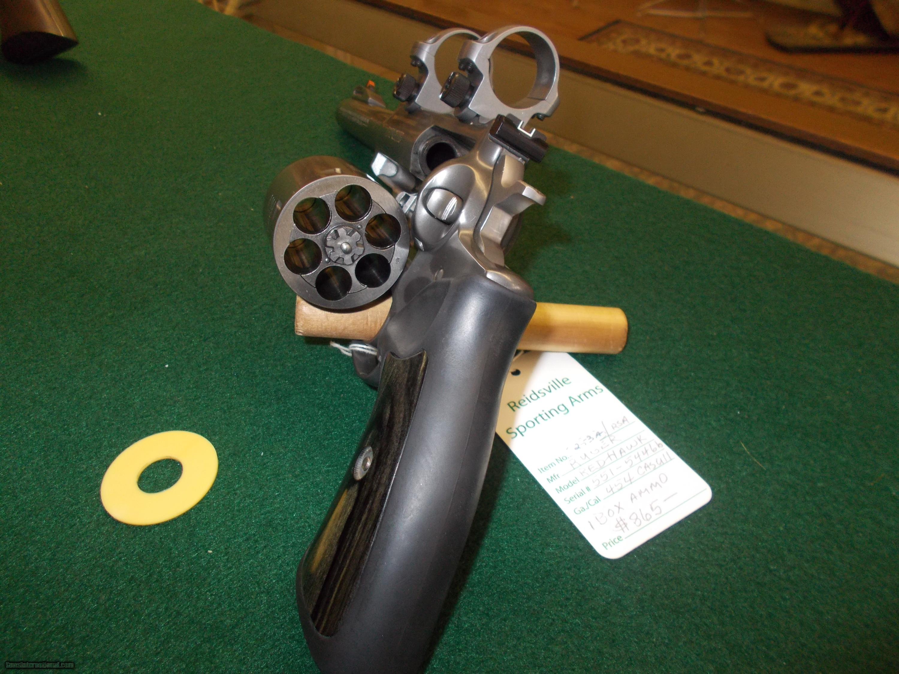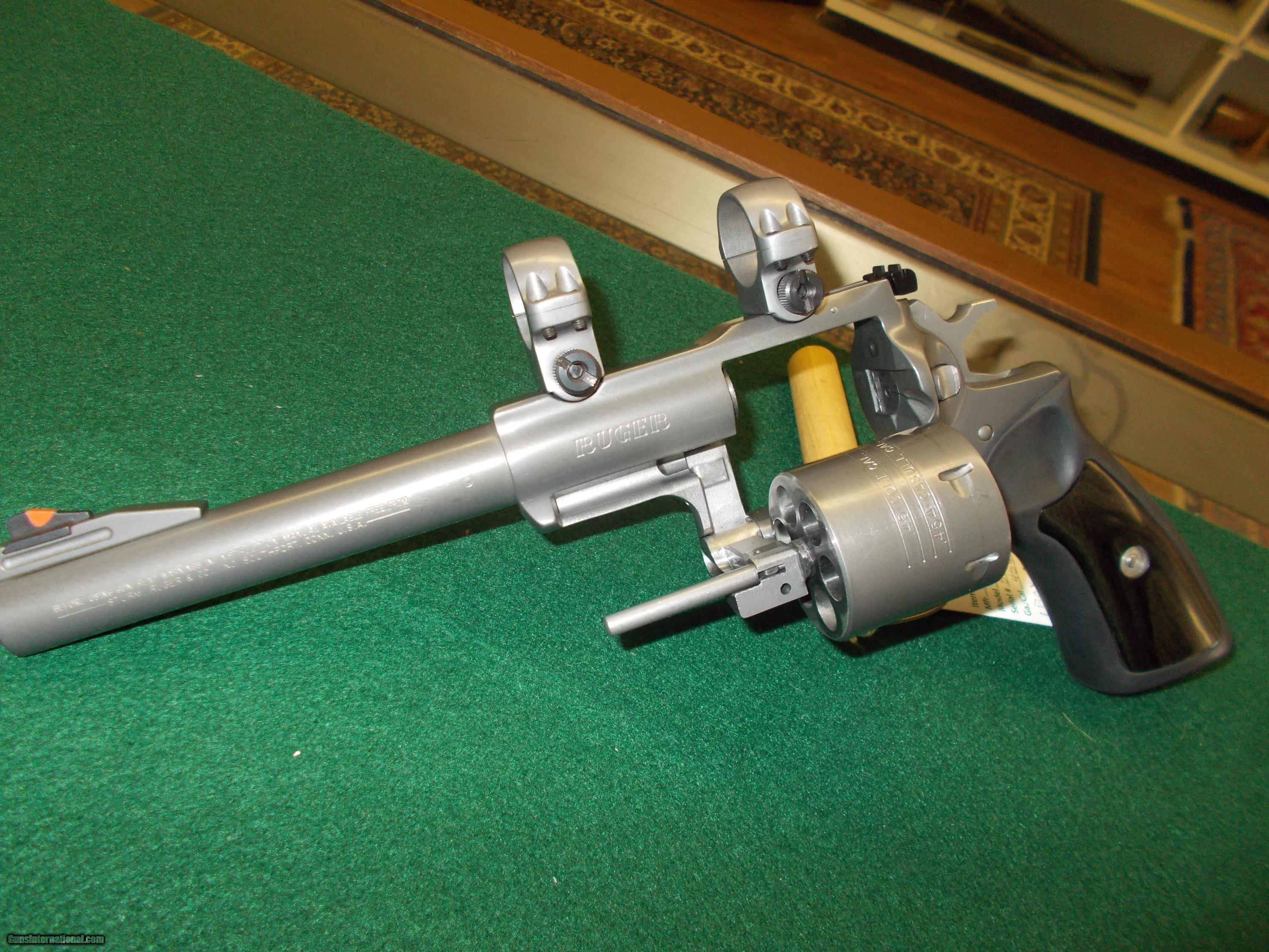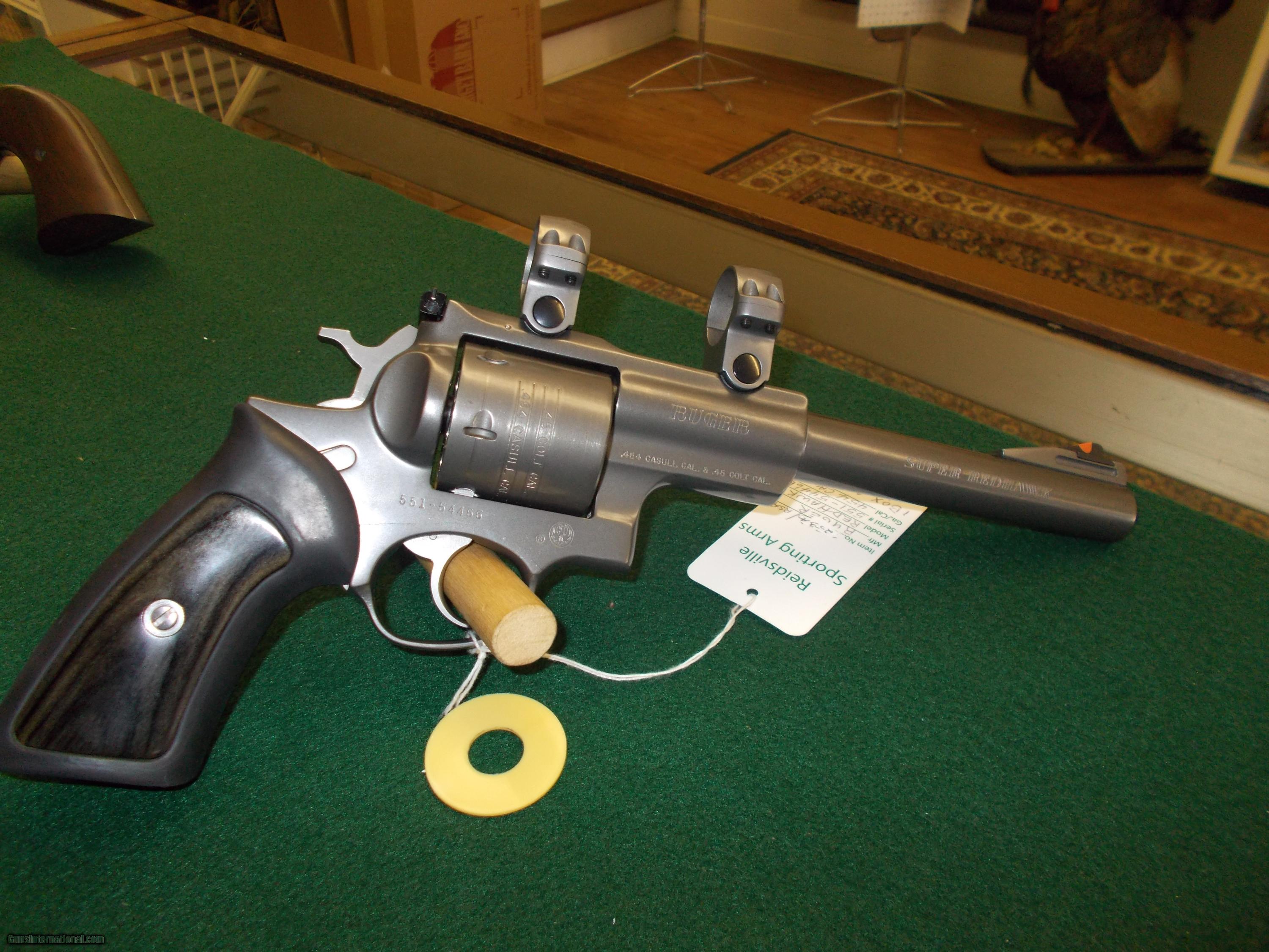 Description: .454 Casull six shot revolver, 7-1/2" barrel, Non fluted cylinder with .45 LC and .454 Casull engraved on cylinder, cusioned grip with GP 100 style panels, SS Satin Finished, test fired only new in box. Integral scope mounts and scope rings, transfer bar safety, triple locking cylinder. SOLD Manufacturer: Ruger Model: Super RedHawk Caliber Info: 454/45LC Bore: excellent Condition: Excellent Metal Condition: excellent |