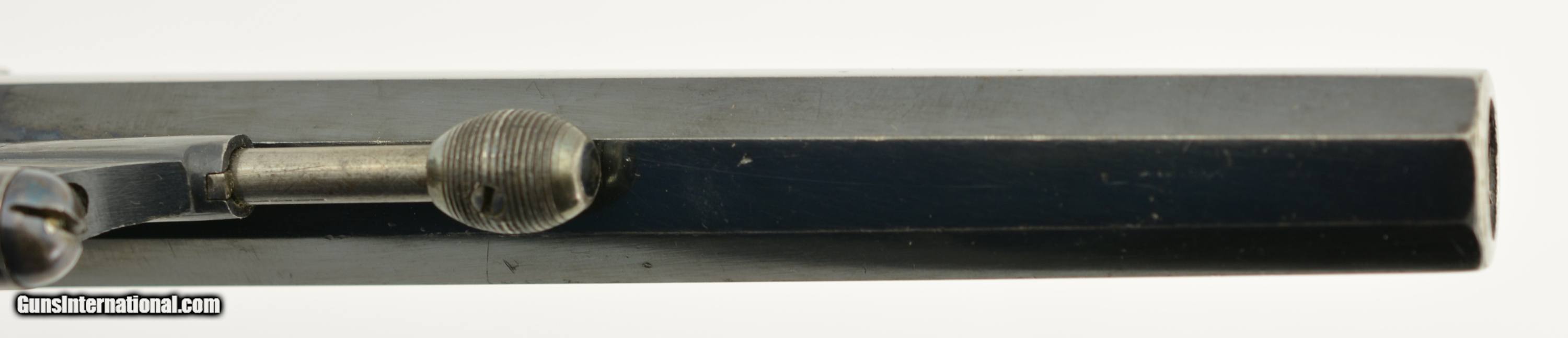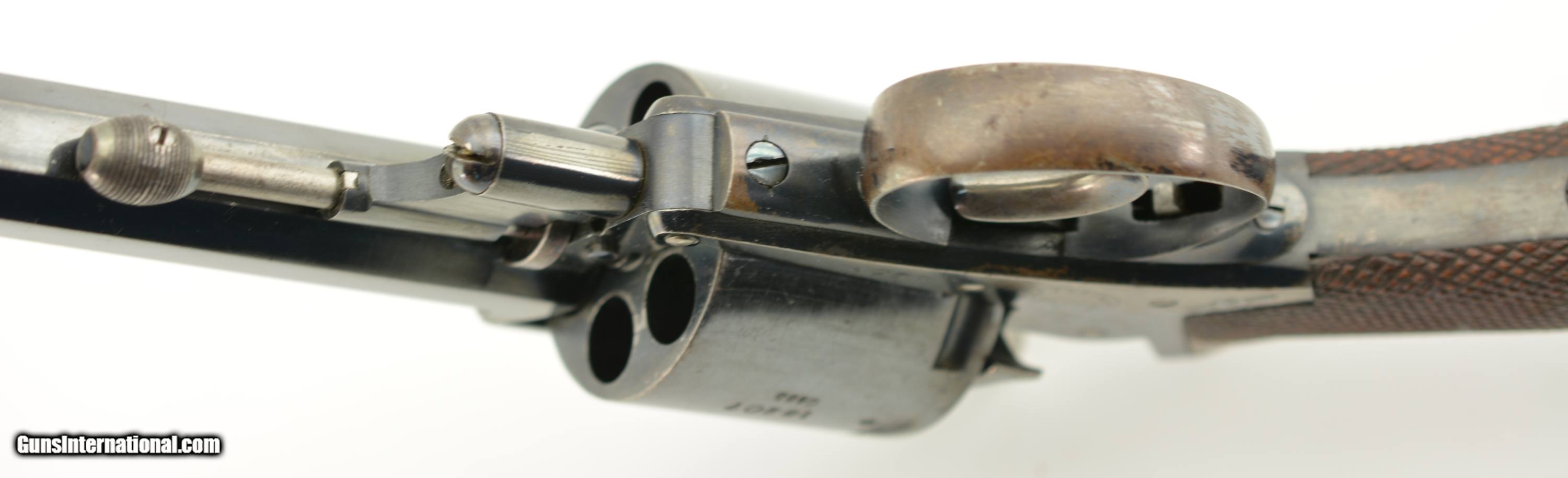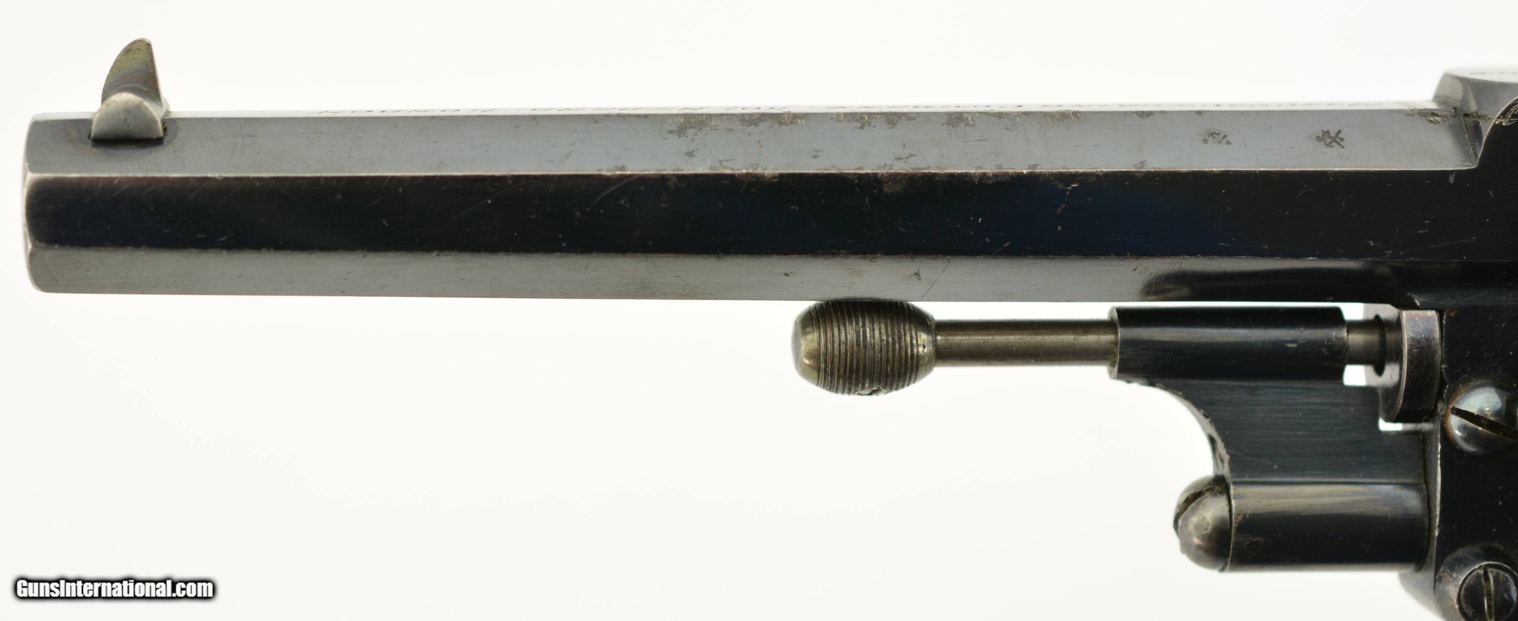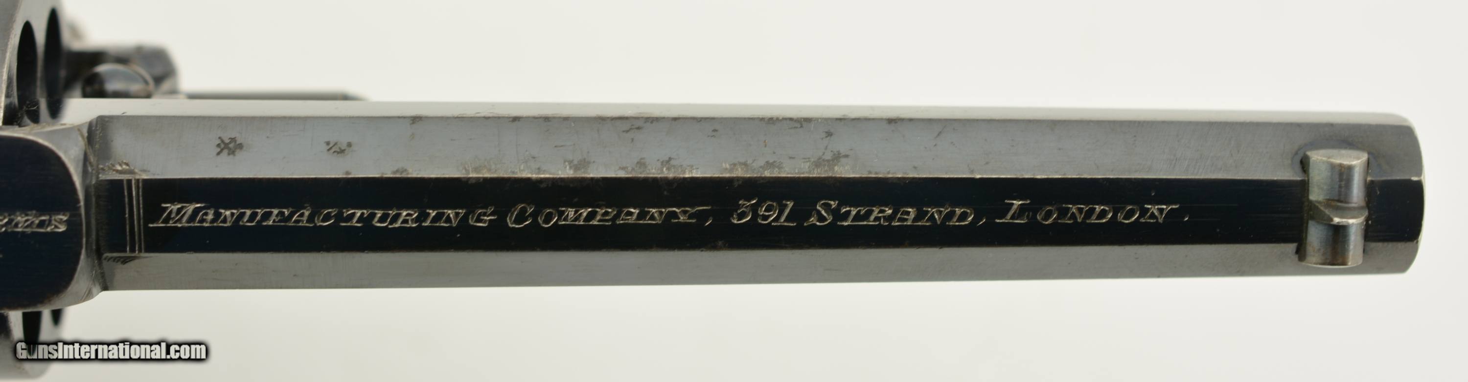 Description: Serial #18207, .455 CF, 5 3/4" octagonal barrel with a fine, bright bore that has traces of mild freckling within the grooves. This revolver retains 90-95% of the original bright blue finish, with some fading to smooth plum-brown on the rear of the frame, as well as some silvering along the edges and corners. Additionally, there is some very sparse filigree engraving at fore and aft on the sides of the topstrap, the Adams commercial markings are crisp and clear on the right side, while the topstrap and barrel are engraved: "ADAMS'S PATENT SMALL ARMS MANUFACTURING COMPANY, 391 STRAND, LONDON", along the top. The cylinder is marked "C455", and the serial number has a double-struck "2" due to improper, perpendicular alignment when initially struck. The checkered walnut grip is in very good condition without any cracks or chips, but there is some light-moderate flattening of the points. The mechanism is fully functional, and the revolver rates very fine-near excellent condition overall. This is a great looking example of a late production, .455 Adams revolver, and has lots of original finish remaining. Antique. SOLD Antique: Yes |
