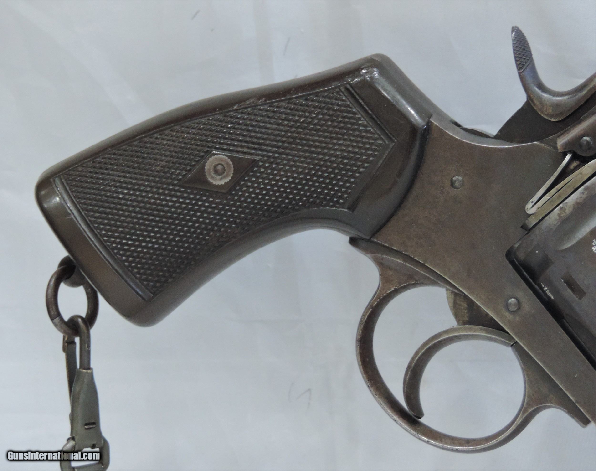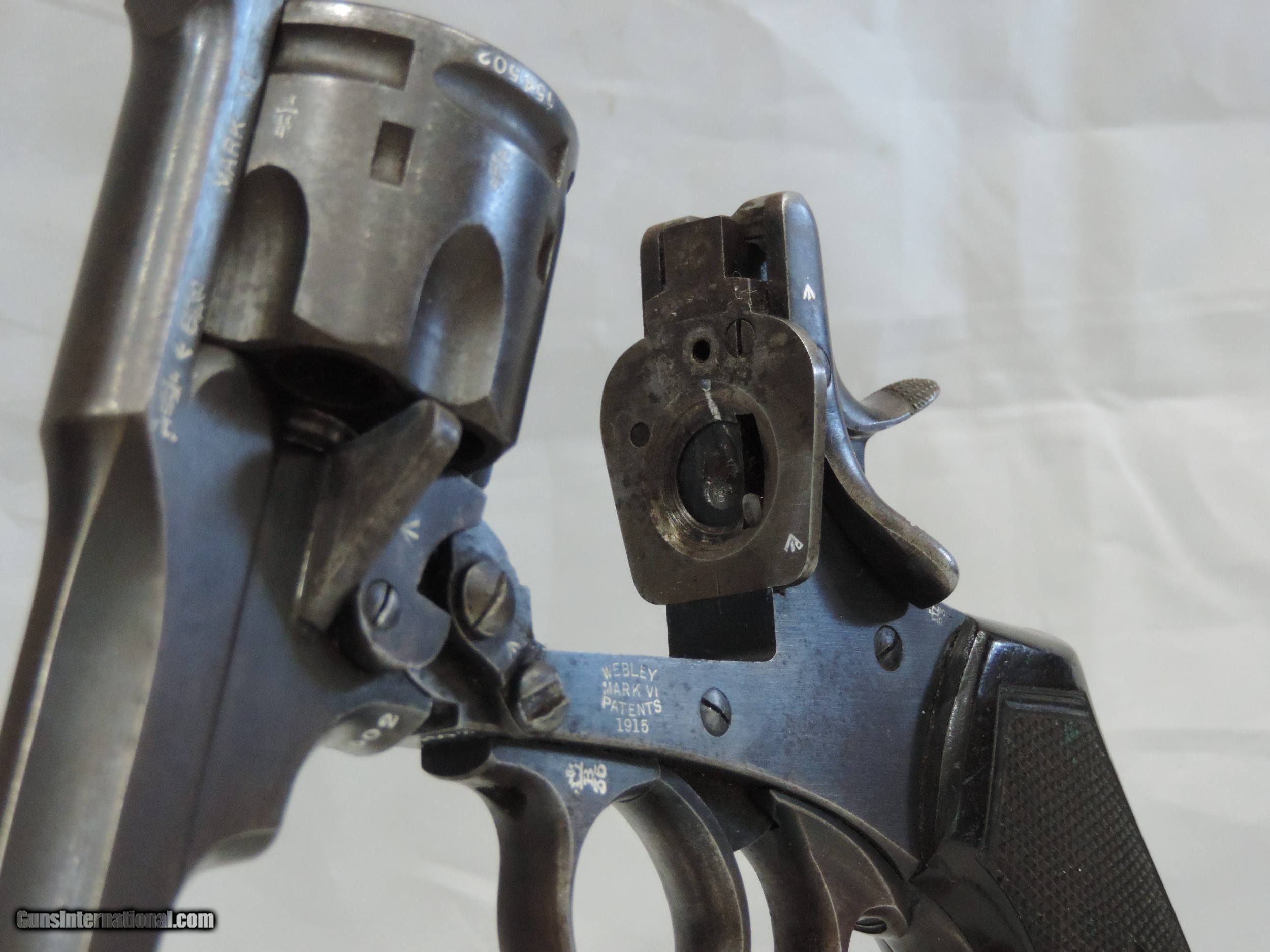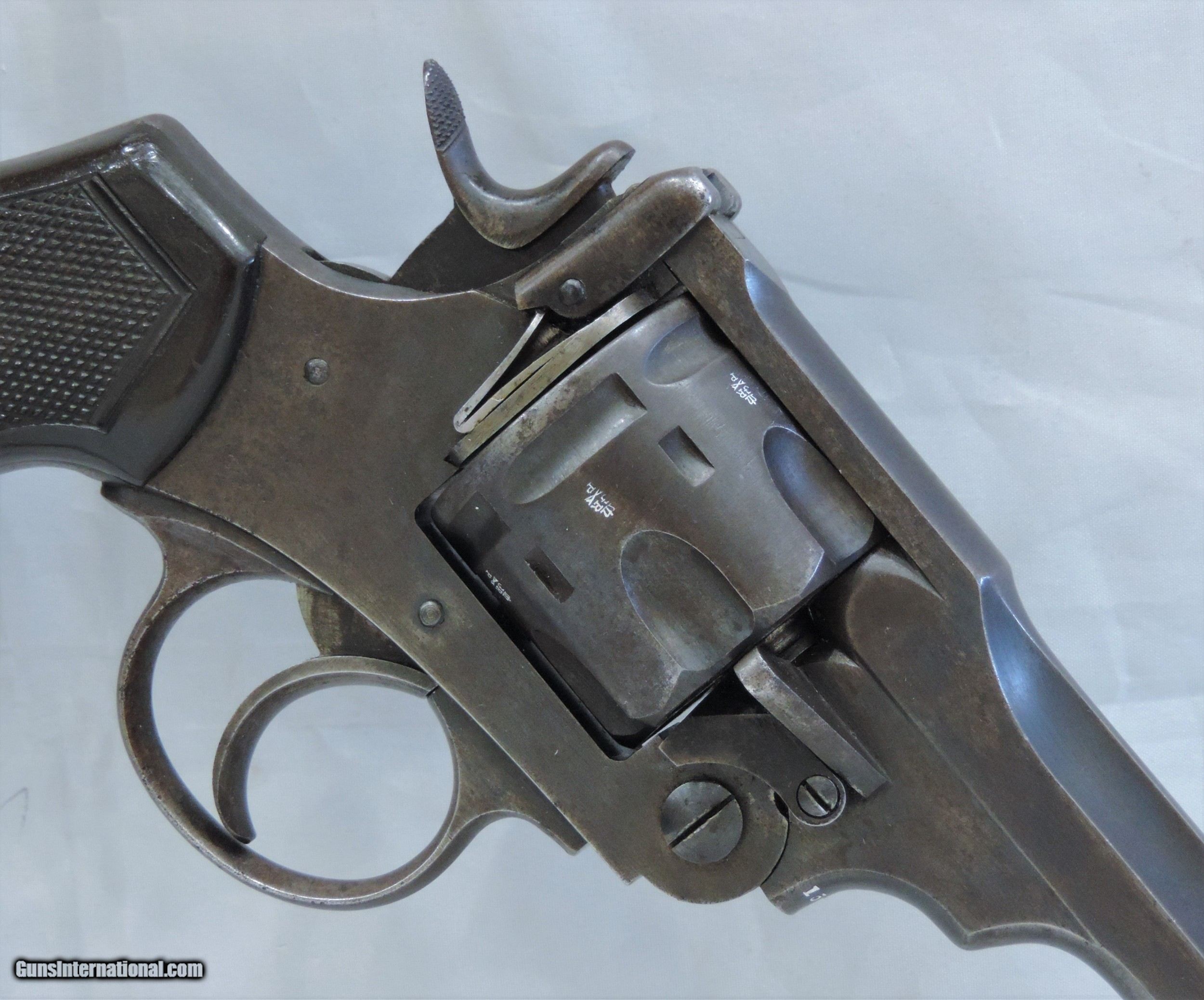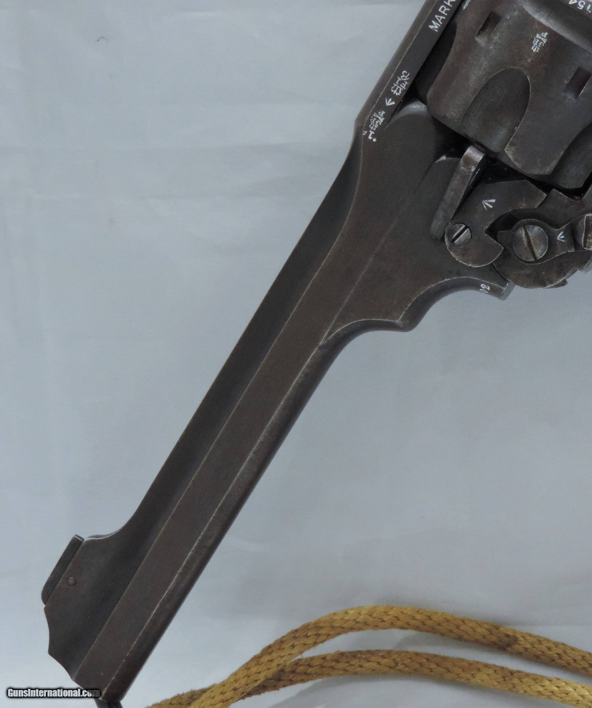 Description: INV. 7878 UNCUT WEBLEY & SCOTT MK. VI, .455, SER. 154502, MFG. 1915. THIS G.I. BRING BACK'S CONDITION IS GREAT FOR A "HOLSTER QUEEN" OF TWO WORLD WARS. IT STILL RETAINS ABOUT 85-90% 0F THE ORIGINAL BLUE. THE LOSS OF FINISH IS MOSTLY DUE AGE FLACKING AND SOME HOLSTER WEAR. THERE ARE NO RUST SPOTS RUB MARKS OR BLEMISHES. ALL PARTS MATCH. THE GRIPS AND GRIP SCREW ARE PERFECT. ALL PROOF MARKS ARE PROPER AND ARE SHOWN IN THE PICS. THE CYLINDER FACE, RECOILS SHIELD, AND FORCE CONE SHOW VERY LITTLE USE. THE GUN LOCKS UP TIGHT, INDEXES AND APPEARS TO FUNCTION PROPERLY. THE BORE IS SUNSHINE BRIGHT WITH RAZOR SHARP RIFLING. IT COMES WITH ORIGINAL LANYARD AND LANYARD RING. THIS "HOLSTER QUEEN IS A REAL FIND FOR THE INVESTOR/COLLECTOR AND REAL AND SHOULD BE REAL FUN AT THE RANGE. MODESTLY PRICED AT....SHIPPED.... $1975.*** ***PURCHASE SATISFACTION GUARANTEED. To purchase this firearm or if you want to request more information contact us at: Email ckguns[at]ymail[dot]com Phone 201-512-0002 Cell 201-575-6838 FAX 201-215-4759 We accept most major credit cards. Prices shown are Discounted 3% for Cash or Check. The buyer must be familiar with all the laws governing the purchase and the ownership of firearms in their own city and state. The Yankee Armorer, Inc is not responsible for any failure to comply with or observe these laws. The Yankee Armorer, Inc will only ship after full payment and receipt of all required documents. Shipping: Add $35.00 for handguns, $45.00 for long guns. New Jersey buyers are subject to a 7% sales tax. The Yankee Armorer, Inc offers a 3 day inspection period with full refund upon return of intact firearm and in the original condition. The Yankee Armorer, Inc offers a no interest lay away program - 25% down; 25% in 30 days; 25% in 60 days; and full payment in 90 days. Any violation of this policy is subject to restocking and forfeiture of all payments. Any variation from this policy must be agreed to in advance. Unshipped Cancelled sales are subject to a 20% restocking fee. Be advised that all firearms sold by The Yankee Armorer, Inc. or the Gun Exchange, LLC (SELLER) are sold as collector’s items. They have not been fired or tested for safety and must be examined by a license gunsmith prior to use. By purchasing any item from the (SELLER), you are agreeing to hold the (SELLER) free from any damages or lawsuits of any nature. Any item left for transfer or storage will be charged to $25.00 per month, per item from the day of its receipt. Any variation from this policy must be agreed to in advance. Store hours 10:00 am to 5:00 pm Tuesday -Saturday. It's always best to call for appointment. Store 201-512-0002, cell 201-575-6838. SOLD Handgun Caliber: .455 Webley (.455 Webley Mk I, .455 Revolver, .455 Colt, .455 Colt Mk I, .476 Enfield, .476 Eley, .476/.455) |