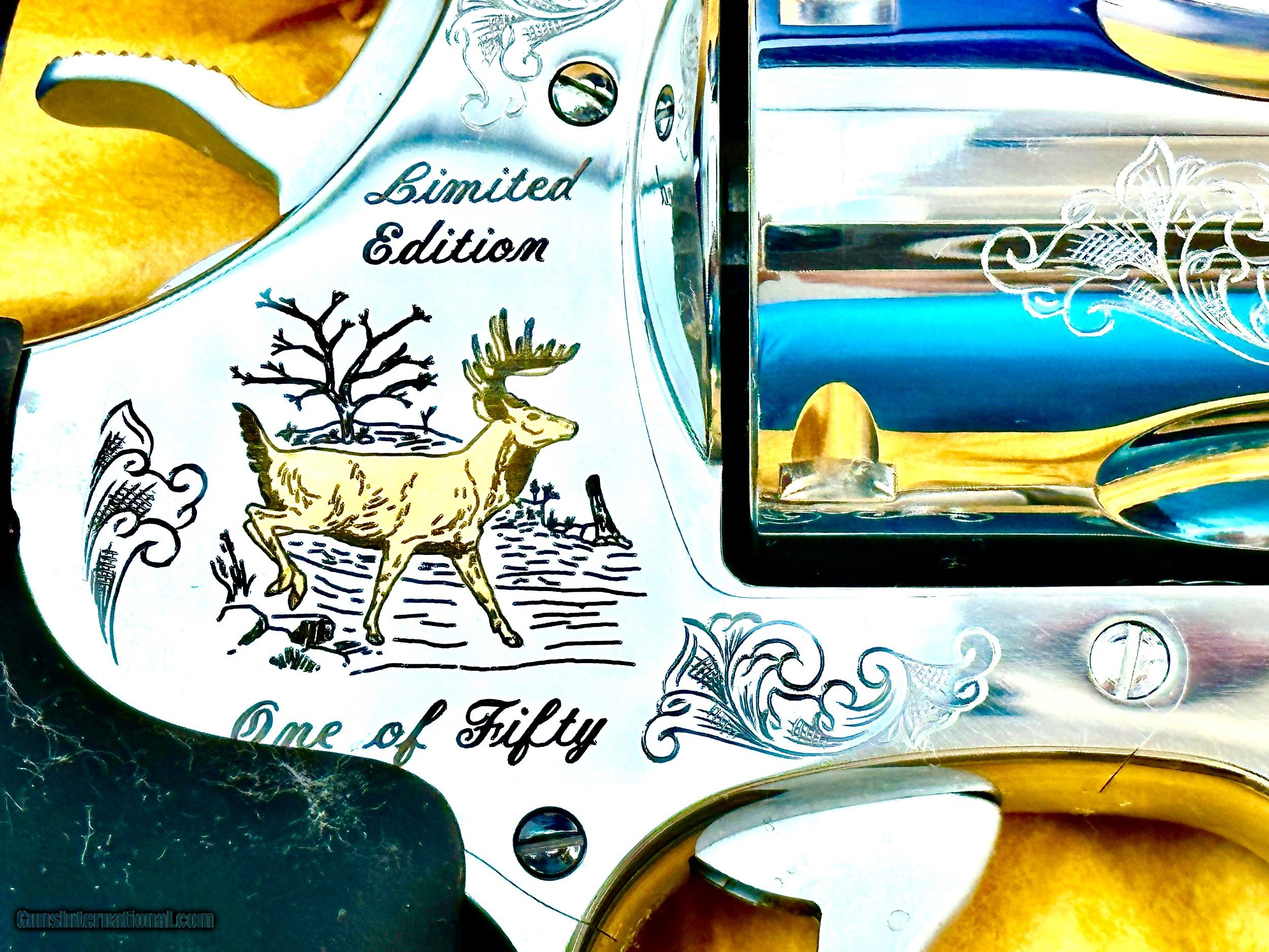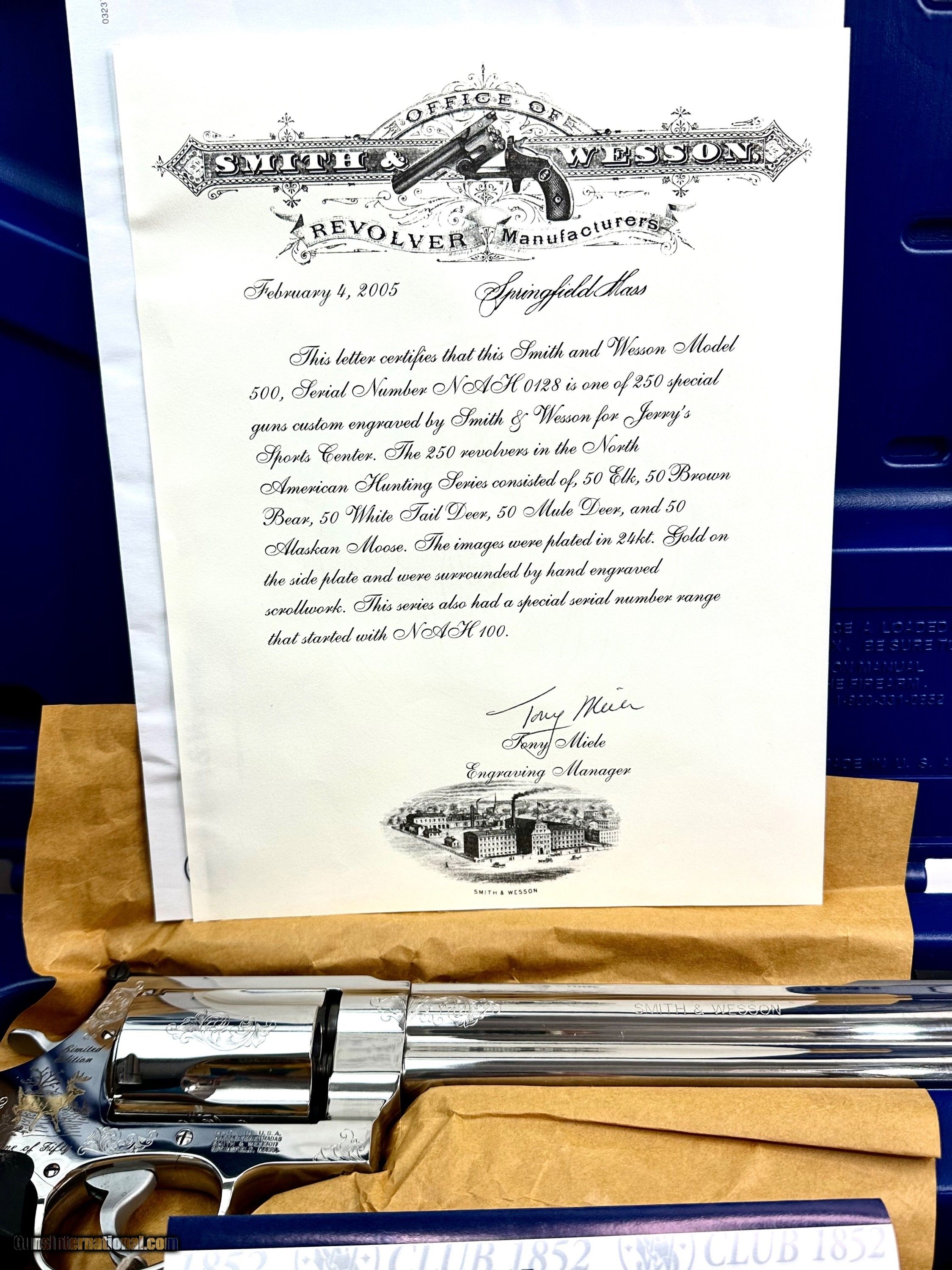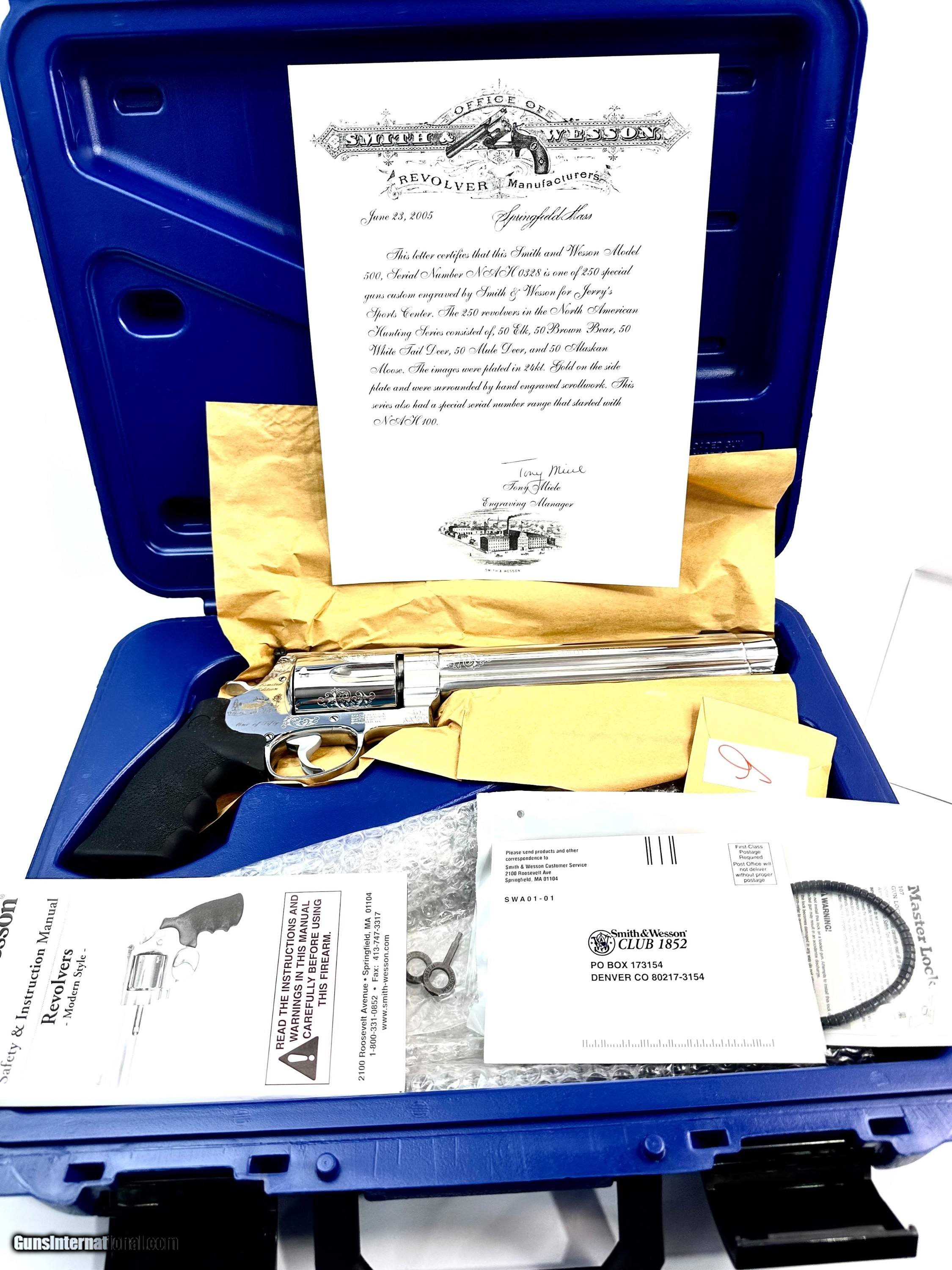 Description: This is a very rare collection of all 5 of the Smith and Wesson 1 of 50 Model 500 Limited edition NAH revolvers. The revolvers feature the big 5 north American game animals Mose, White tailed deer, Mule Deer, and Grizzle bear. These revolvers have never been sold over the counter, Making these exceptionally rare. They all come with hand signed letters from Tony Miele the engraving manager at Smith and Wesson during 2005 outlining that these were hand engraved with 24 K plating and that only 50 of each pistol with the respective game animal were produced. These guns were sold individually by Jerry's Sporting goods The Dealer who purchased these had to collect them from the distributer over a 1 year period. He had them since 2005 untill now. The presentation boxs have the S&W logo and outlining it are the words Custom Engraved etched into the glass. They were never placed in the Presentation box's and the box's dont even look to have ever been opened. Maine residents must add 5.5% Sales Tax Shipping is a flat 200.00 for all the presentation box's and pistols in the original hard cases 10 box's total. Insurance is not included but can be added for the actual cost. Price reflects a 5.5% Cash discount SOLD Handgun Caliber: .500 S&W Magnum Manufacturer: S&W Model: 500 Serial Number: NAH0128,NAH0228,NAH0328,NAH0428,NAH0528 Barrel Length: 8-7/8 Condition: Mint New (Old Stock) Metal Condition: Mint New (Old Stock) Wood Condition: Mint New (Old Stock) Bore Condition: Mint New (Old Stock) Action: Double or Single Action Finish: Nicklel / Gold Manufacture Date: 2005 Engraving: Hand engraved by S&W with Authenticity letter Extras: Display Cases and S&W Letters, Hard cases, Extra sight blades Item Location: Buxton Maine |