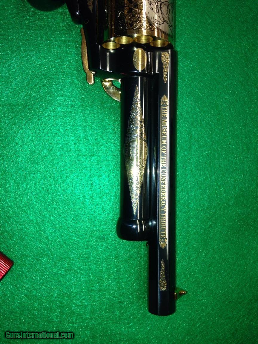 Description: #160 out of 500 The frame of the Tribute is adorned with images of the Civil War, with the original Confederate flag displayed within a field of scrollwork, and the “CS”, or Confederate States, belt buckle proudly shown. The official crest of the Museum of the Confederacy is also featured, among a wedge of matching scrollwork. Highly detailed artwork of 24-karat gold with blackened patinaed accents adorn the Tribute’s frame, cylinder and barrel. The LeMat’s unique nine-shot cylinder holds the portraits of three of the confederate’s favorite sons – President of the Confederacy Jefferson Davis, famed Confederate General Robert E. Lee, and General J.E.B. Stuart, the Civil War’s most gallant Cavalry leader who, with his trusted LeMat Revolver, wreaked havoc upon Union Forces. The portraits of these brave leaders are captured in oval cameos and surrounded by flowing scrollwork and crossed rifles of the Confederate Infantry. SOLD Antique: Yes Model: LeMat Caliber Info: 44BP, 20G Lower Barrel |
