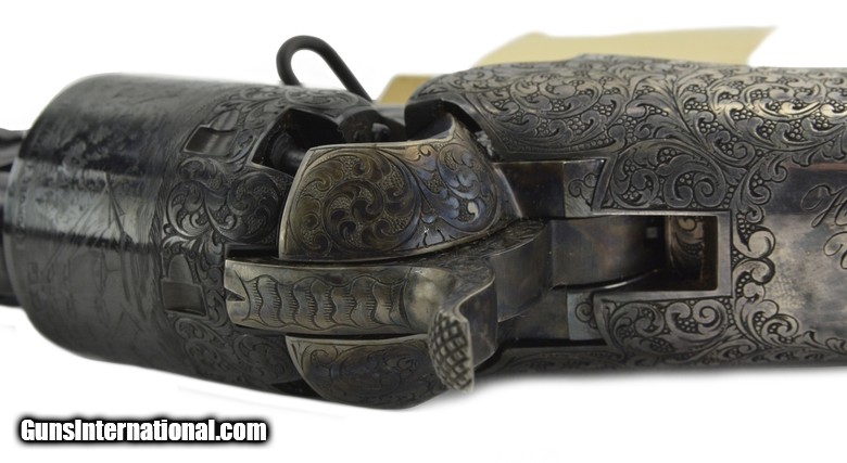 American Historical Foundation Jefferson Davis Commemorative 1851 Navy Revolver. This gun is a duplicate of the Colt 1851 Navy revolver presented by Sam Colt to Jefferson Davis, who went on to become the president of the Confederate States of America during the Civil War. The gun is beautifully engraved and has an engraved and inscribed buttstock attached. The yoke of the stock has an inscription from Sam Colt to Mr. Davis. The gun comes in a glass top presentation case with accessories. A beautiful and historical piece.