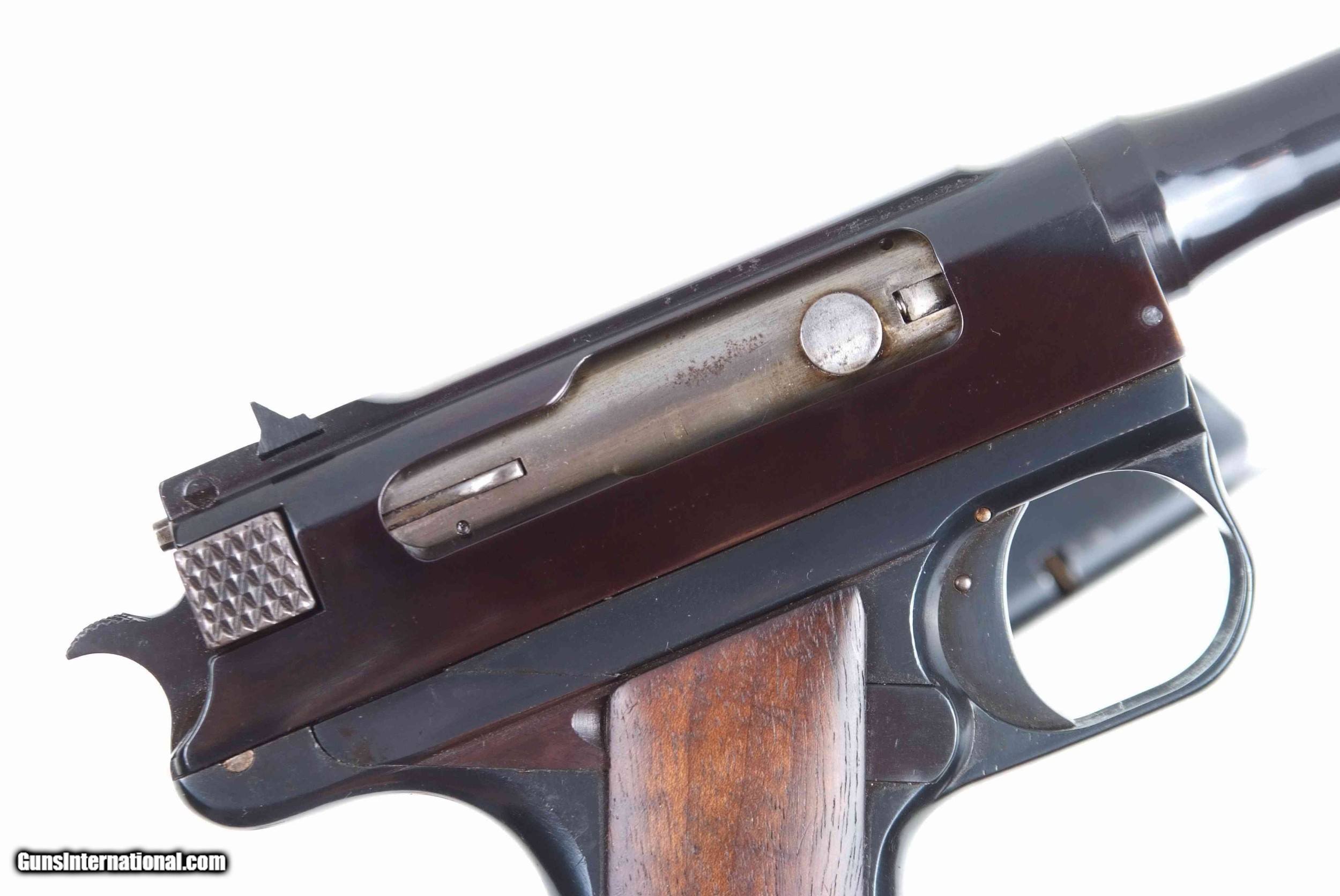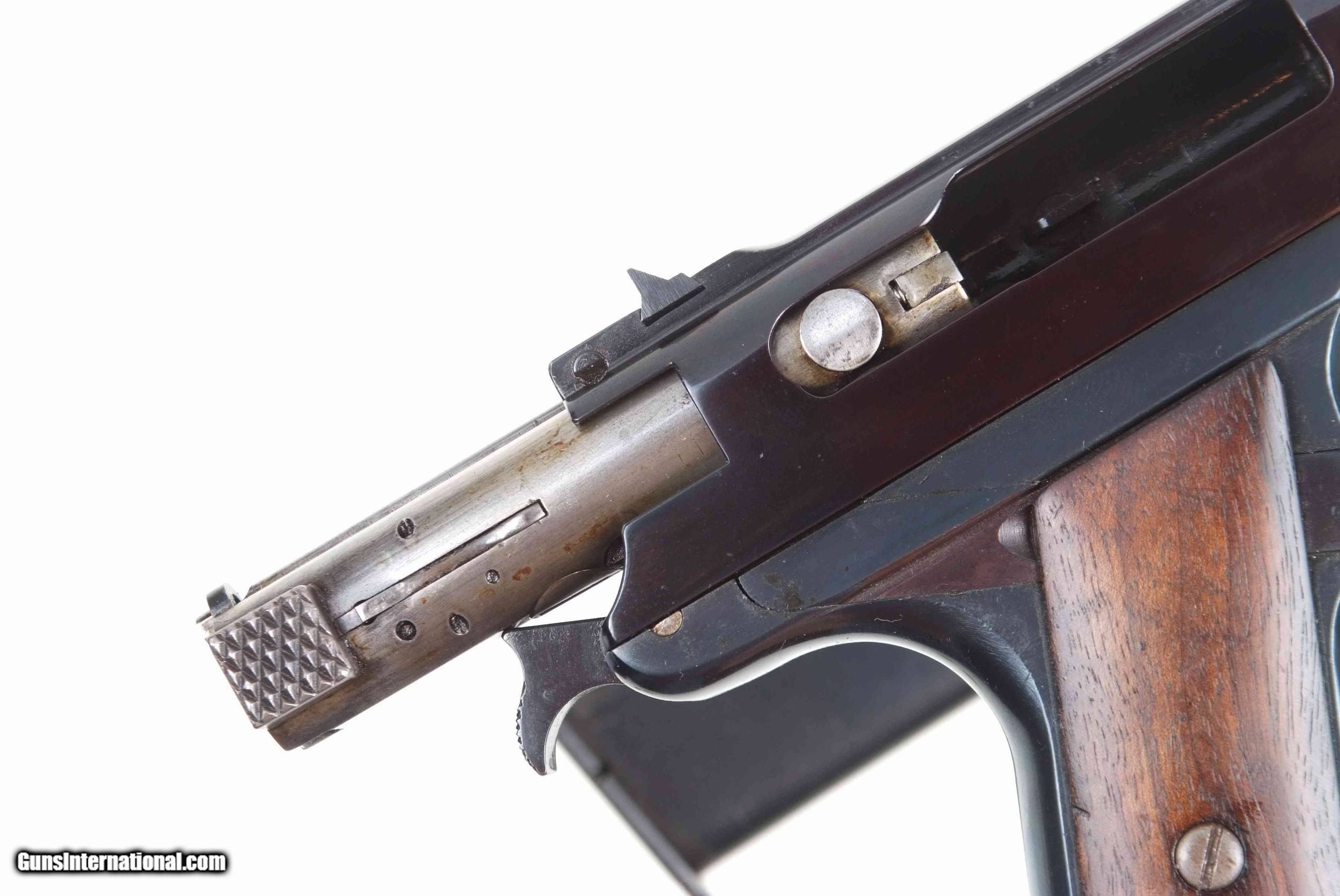 Description: This exceptionally rare US test pistol was designed by Grant Hammond and made by the Grant Hammond Manufacturing Company of Hartford, Connecticut in a plant owned by Liberty Motors of New Haven, an ownership that led to the nickname “LIBERTY PISTOL”. This single action, delayed blow back pistol was made circa 1917-1918 in two variations with an external hammer. The bolt included a spring loaded stop that protruded as a 3/8? circular extension from the right side. Towards the rear was a stiff retarding spring that assisted in the final lock-up. After the last cartridge was fired, the bolt would lock open while the magazine was automatically expelled out of the pistol via a spring loaded accelerator loaded under the left panel. Inserting a loaded magazine released the bolt to a chamber the first cartridge. The gun was tested on two occasions in 1917, and then sent to Springfield Armory for additional testing in early 1918. In several respects, the gun was superior to the Colt; the Grant Hammond was more accurate and had a higher magazine capacity (8 versus 7). Unfortunately, there were a number of malfunctions during the Army and later Navy testing and concerns regarding fabrication and endurance precluded its being selected as a standard service arm. Nevertheless, the Grant Hammond was a well documented contender that was taken very seriously by the US military. This particular is pistol is a 2nd variation Grant Hammond with a 5? round barrel (most were 6.75"), fixed front sight and drift adjustable rear sight. Unlike most second variation guns the top of receiver and the right side are unmarked. The left side marked “PATENTED MAY 4, 1915 OTHER PATENTS PENDING”. The receiver just below the bbl is numbered “13” and is repeated immediately below on the frame that has a push button magazine release behind the trigger. The magazine accelerator is in place under left grip. Original unnumbered wood panels. Replacement Llama magazine, serving as a "placeholder" that does not secure or function with the accelerator. A super rare gun, total production of both the first and second variation Grant Hammond was fewer than 20 pistols. Synopsis: Extremely Rare Grant Hammond, U.S. Military Test, .45ACP, 5" barrel, with replacement magazine. Condition: Better than 98% high polish salt blue refurbishment with sharp edges, flat planes, and crisp lettering. Oil darkened original grips, faded grip screws. Excellent replacement magazine. Bright bore with sharp rifling. Perfect manual mechanics except related to magazine securement and accelerated ejection. A phenomenal pistol, in an unusual barrel length, a key gun to every U.S. Military pistol collection. ~~Insured shipping fee of $155; most packages shipped using FedEx 2nd Day.~~ SOLD Manufacturer: Grant Hammond Serial Number: 13 Caliber Info: .45 ACP |