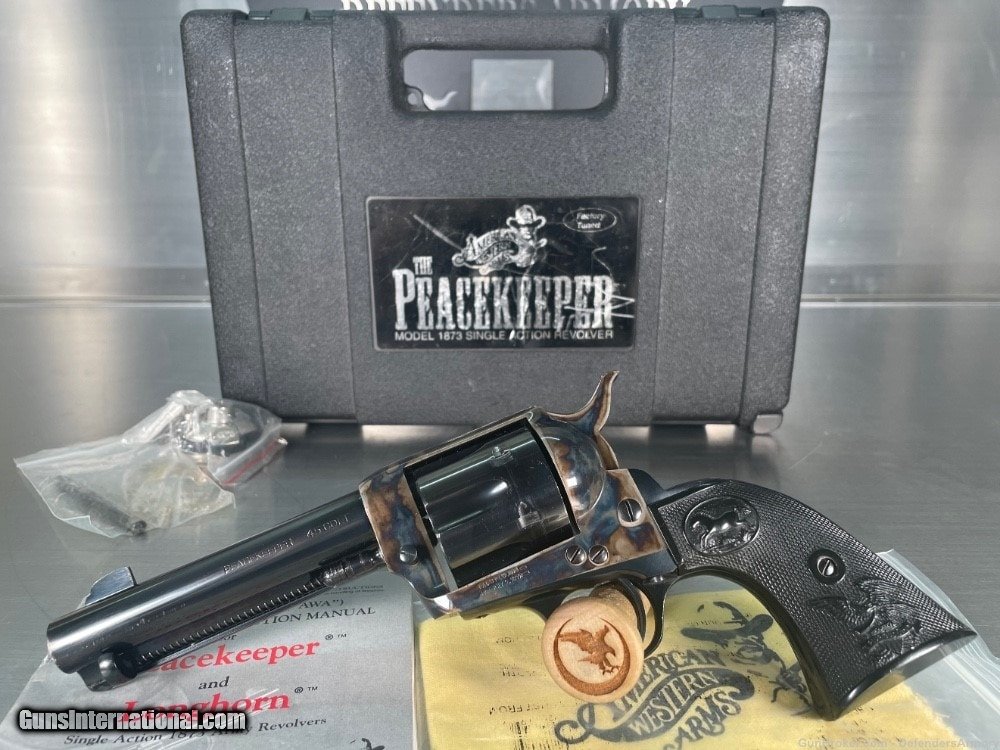 Description: Guns Listing ID: 997529 Used American Western Arms Peacekeeper Model 1873 Single Action Revolver .45 Colt Color Case Hardened 4.75\" Barrel W/ Factory Case Condition: Very good overall. Shiny bore with strong rifling. SOLD Manufacturer: AMERICAN WESTERN ARMS Model: PEACEKEEPER Caliber Info: .45 COLT/.45 ACP Condition: Used - Non-Certified Barrels: 4.75 BARREL Finish: COLOR CASE |