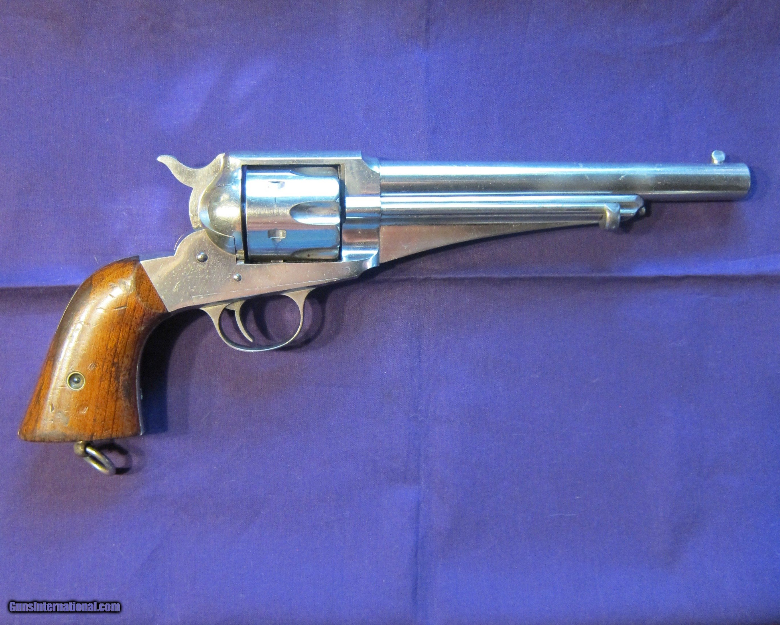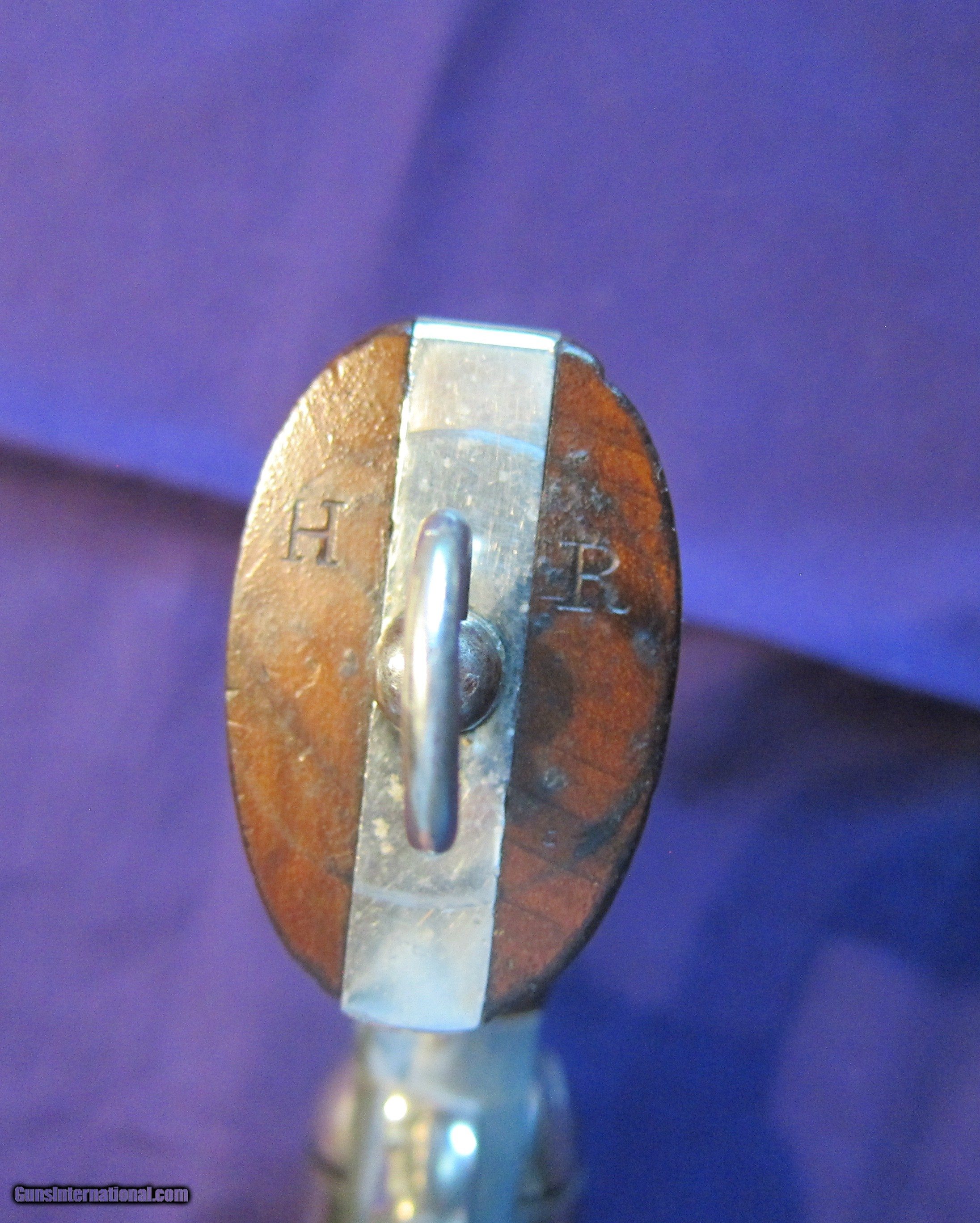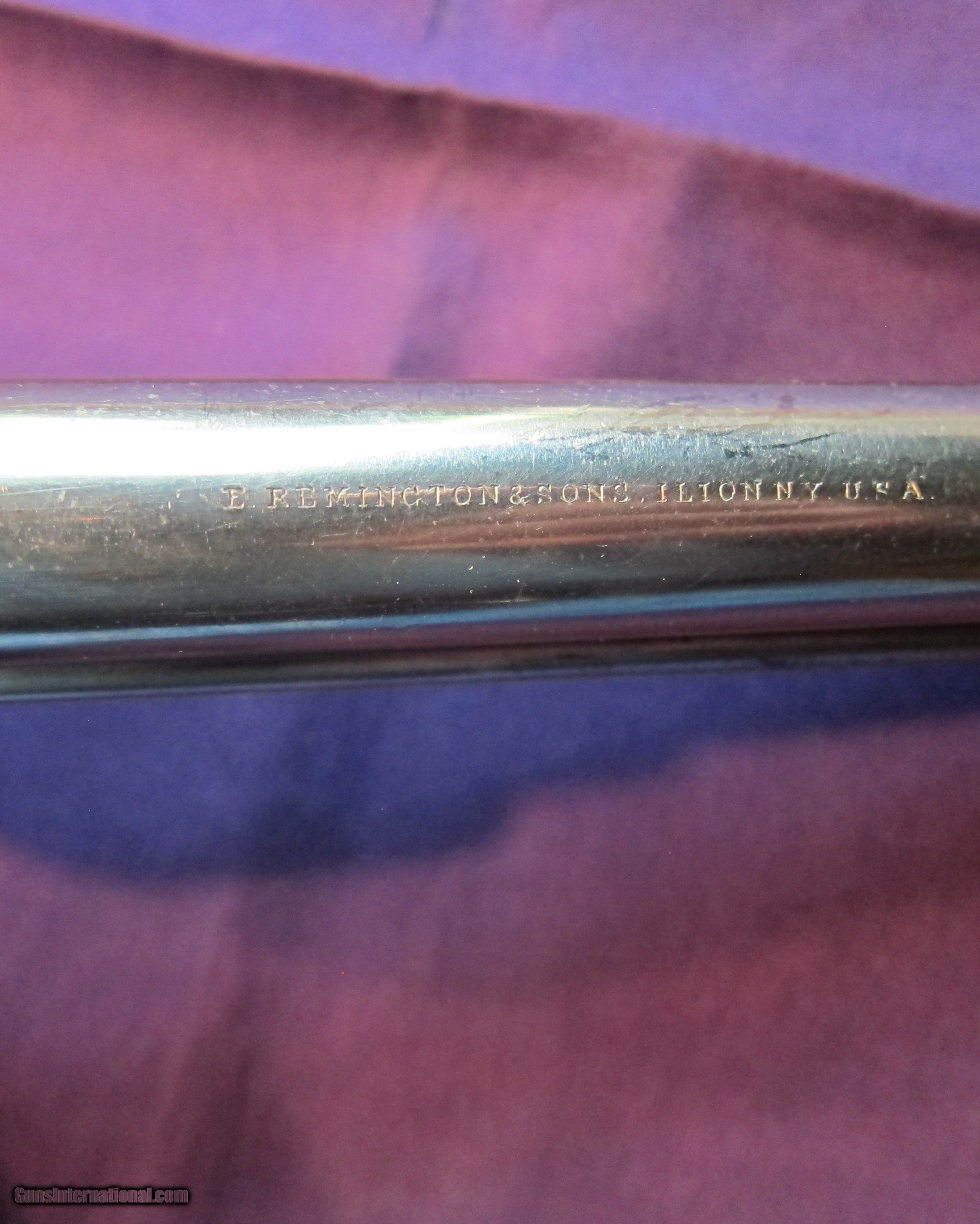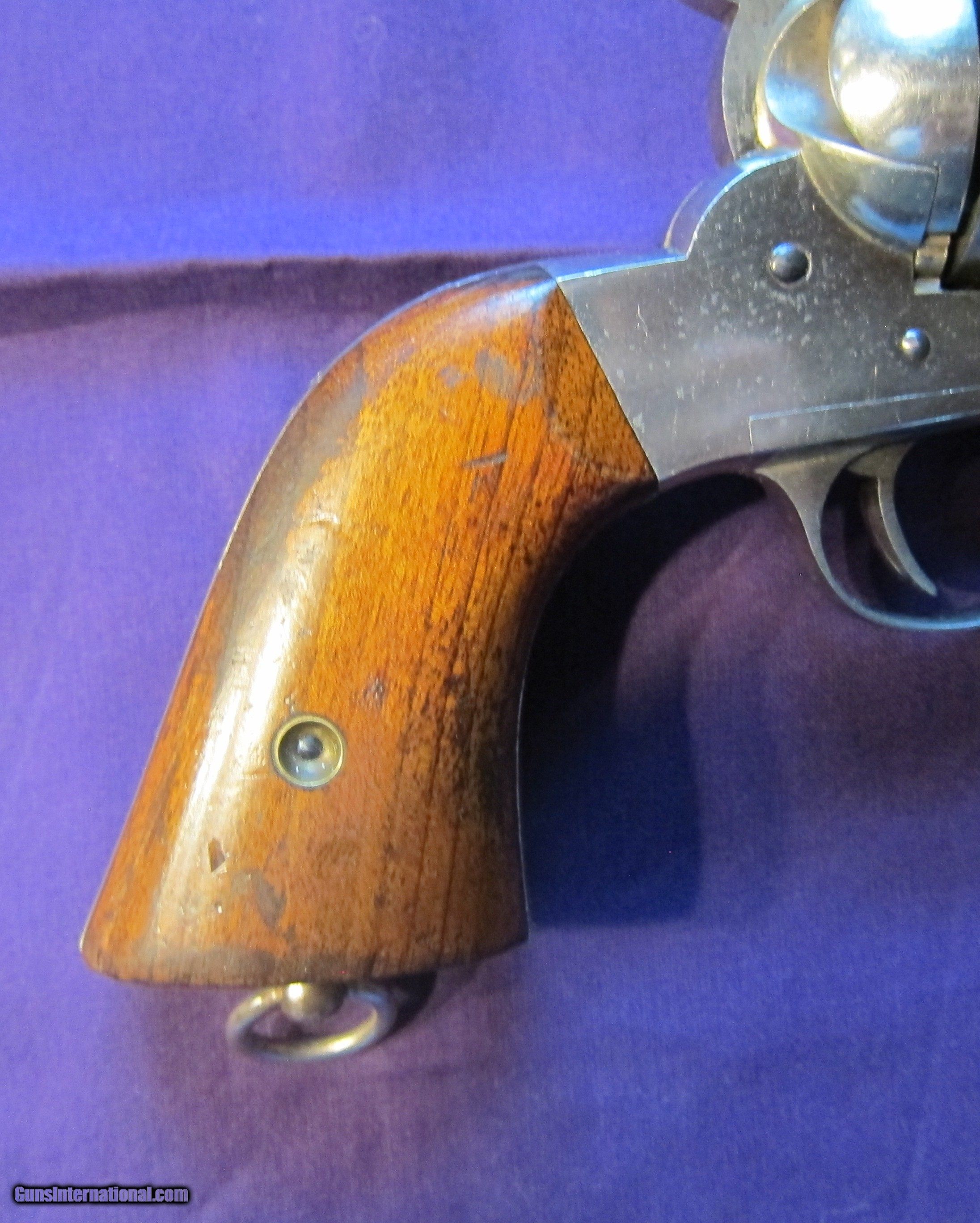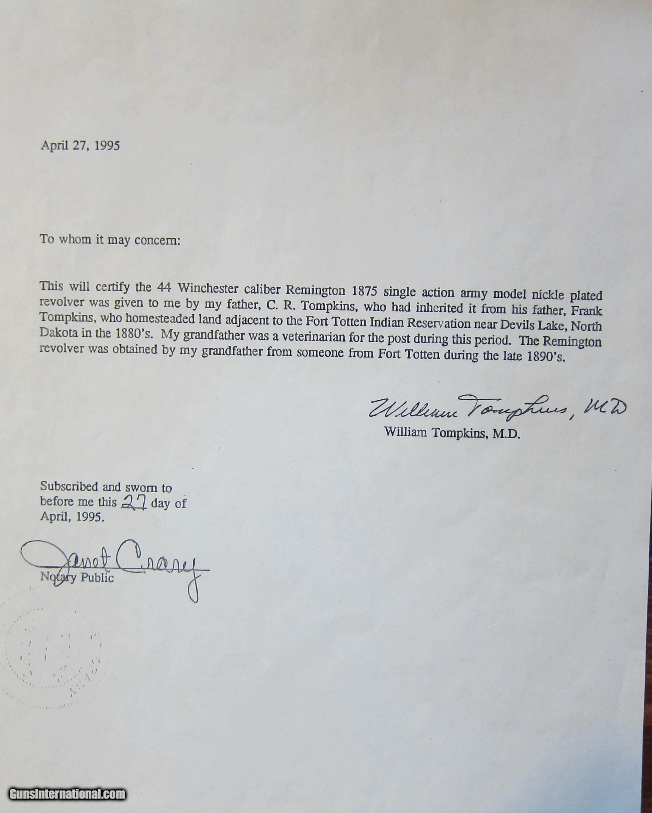 Description: Up for review is an 1875 Remington revolver. These guns were produced somewhere between 1875 and 1889. The exact date for each pistol is a bit difficult to determine due to the fact that they were made in several batches and the serial numbers were occasionally duplicated. The serial numbers are not commonly on the external surface of the revolvers but rather they appear under the grips on the frame of the pistol. Many of these numbers appear to me to be batch numbers rather than actual serial numbers but I could be mistaken. Most had 7 1/2 inch barrels and were either blued or nickel plated. A few were produced with 5 1/2 inch barrels. Three calibers were produced over the course of time and these included the .44 Remington, the .44 WCF and the .45 Colt. Remington stepped imto the western revolver market a couple years too late for effective competition with Colt's 1873 single action pistol and so with Colt's Government contracts already established these revolvers failed to sell as well as might have been anticipated. Only about 25-30 thousand of these Remington guns were ever produced with many being sold into the civilian market to very satisfied customers not the least of which were Jesse and Frank James. The photos in this communication will describe the pistol perhaps better than words can but the interesting part of this revolver is its likely history. When Custer of Little Big Horn fame made his way into Dakota Territory in 1873 a contract physician by the name of Henry Hobart Ruger accompanied the Seventh Calvary to Fort Rice. Dr. Ruger traveled with the seventh Calvary on the Yellowstone expedition in 1873 led by General Stanley. This group of 1500 men provided protection for the Northern Pacific survey party, which made it as far south as the mouth of the Big Horn river that year. During the fall of the same year Dr. Ruger returned with the Seventh Calvary to Fort Abraham Lincoln near Bismark which was their headquarters at the time. Soon there after he was transfered to the 17th infantry and so avoided the Black Hills expedition of 1874 and even more importantly the Battle of the little Big Horn two years later. Following several more transfers within the Army structure acting as a contract physician he moved to Fort Totten where he provided his brand of medicine for the Indians on the reservation near the fort. He remained in practice there until 1884 and then retired from military service. In 1887 he moved to Devil's Lake right outside of Fort Totten where he ranched and lived for the rest of his life dying of a stroke in 1906. Of particular interest in the story at this time is his most likely association with the veterinarian who took care of the calvary horses at Fort Totten during the time he was in practice there. This man's name was Dr. Frank Tompkins. After retirement these men farmed juxtaposed land just outside of the fort. It is highly likely that they not only knew each other but were close friends. According to the affidavit enclosed and signed by a notary the pistol now being discussed was passed down through the Tompkins family over several generations with the initials HR on the butt stock. I would suspect that this Remington revolver at one time belonged to Dr. Hobart Ruger a contract physician that traveledd with George Custer and the seventh Calvary just prior to the battle of the Little Big Horn. Thanks for taking a look and listening to perhaps a little history. Will answer questions to the best of my ability through the G.I. site or by phone. SOLD |