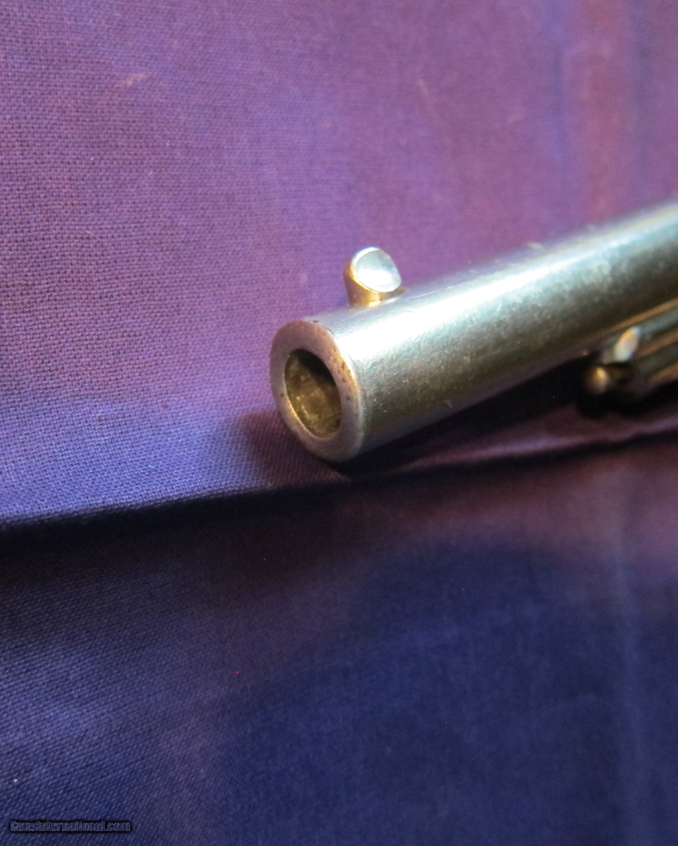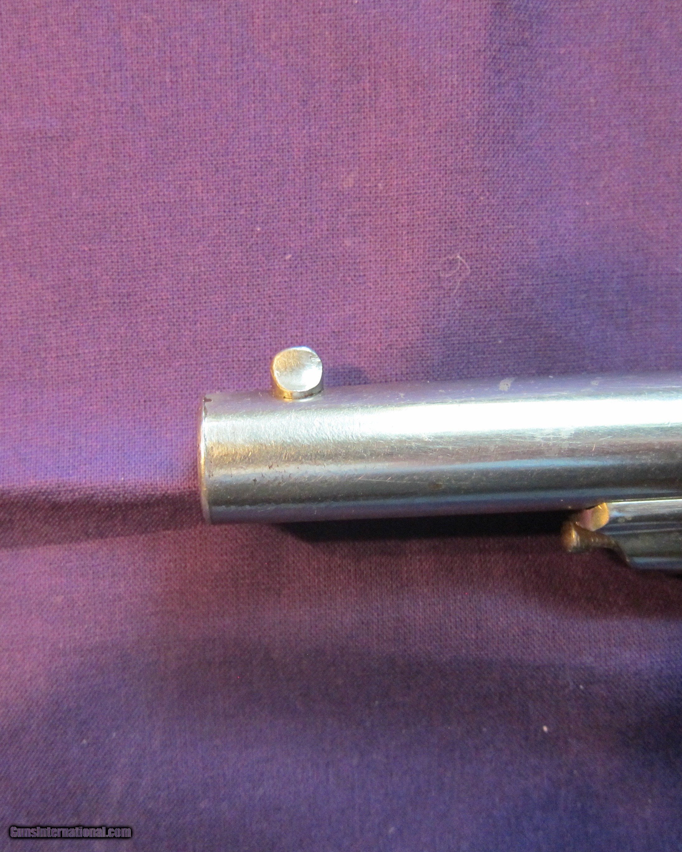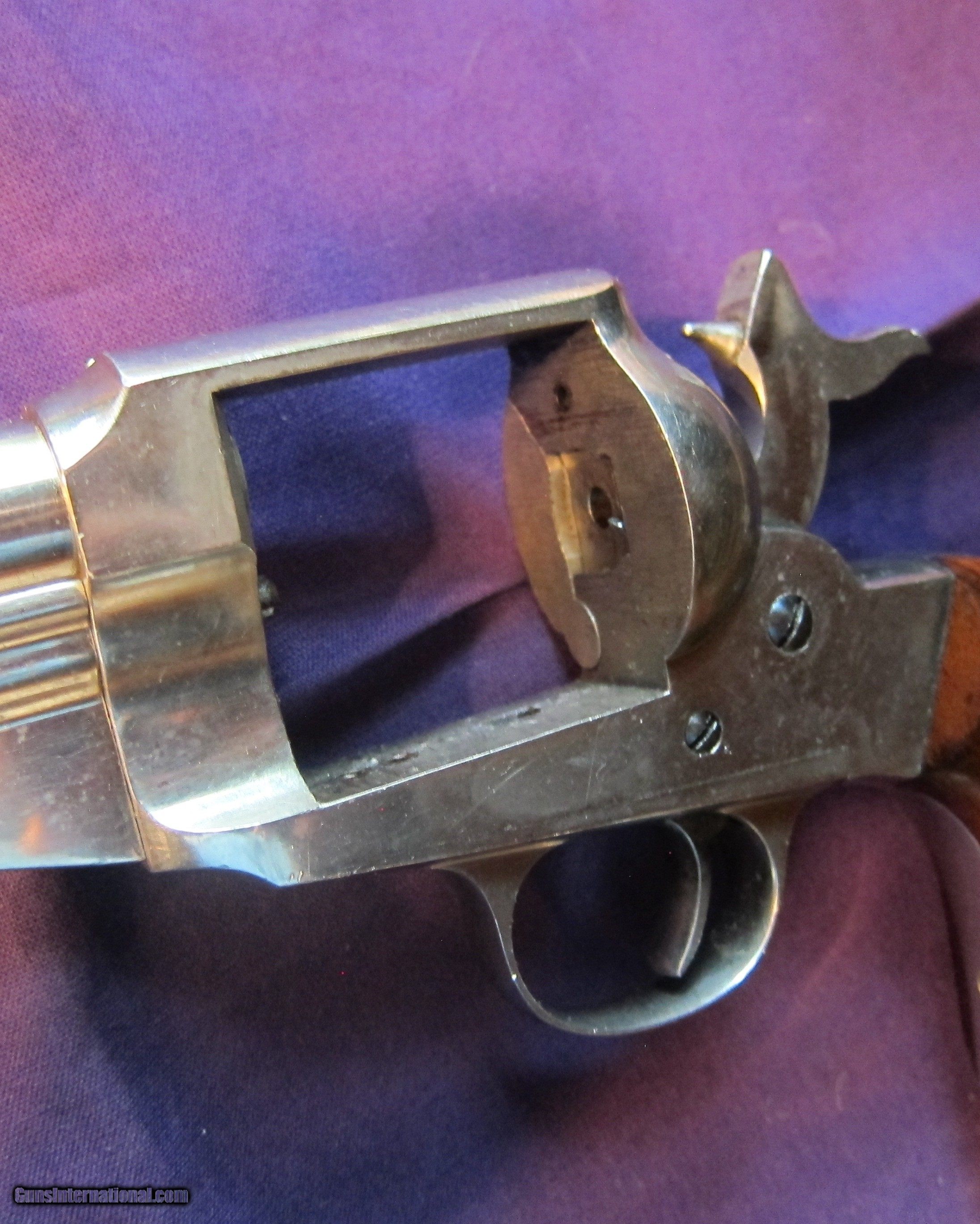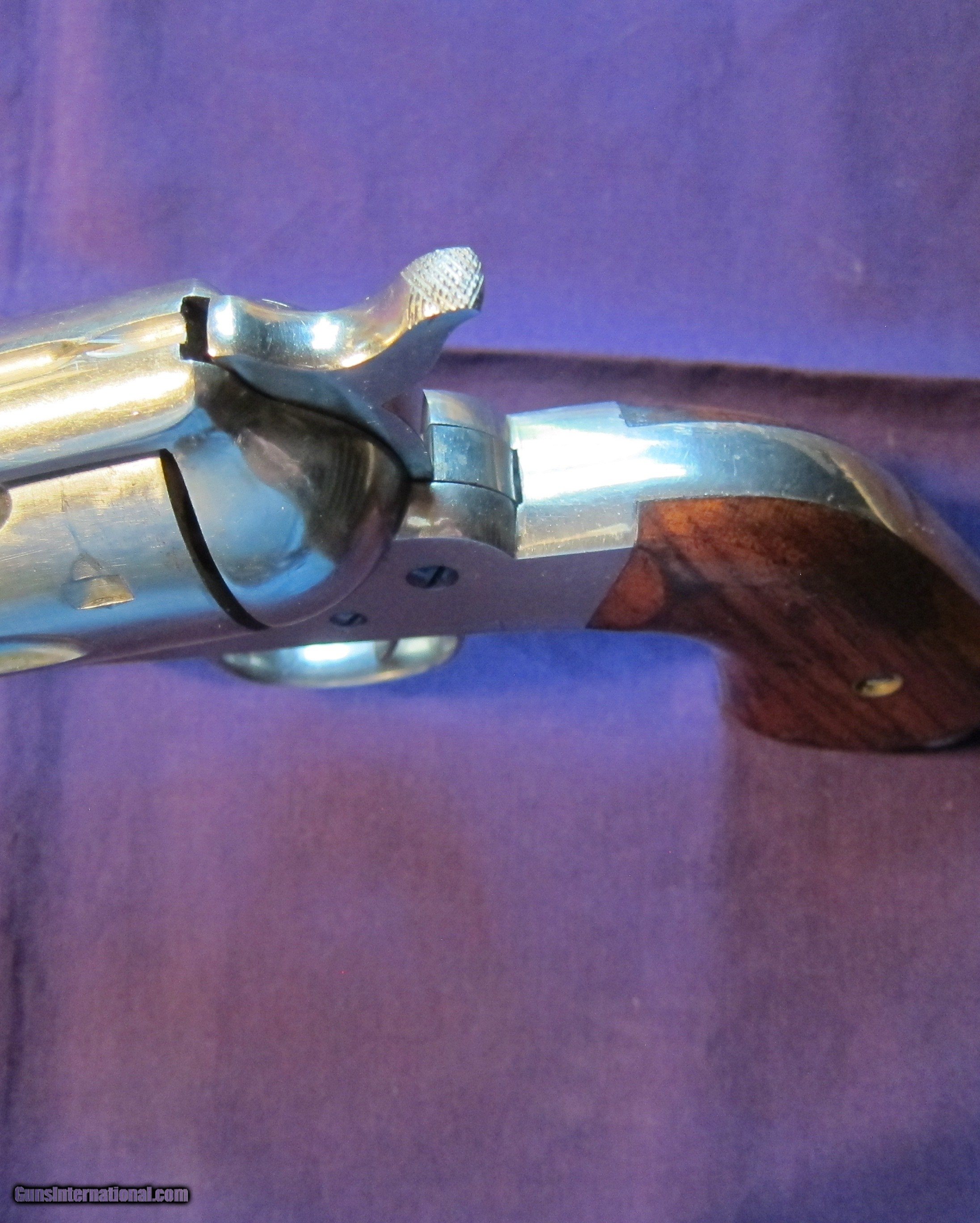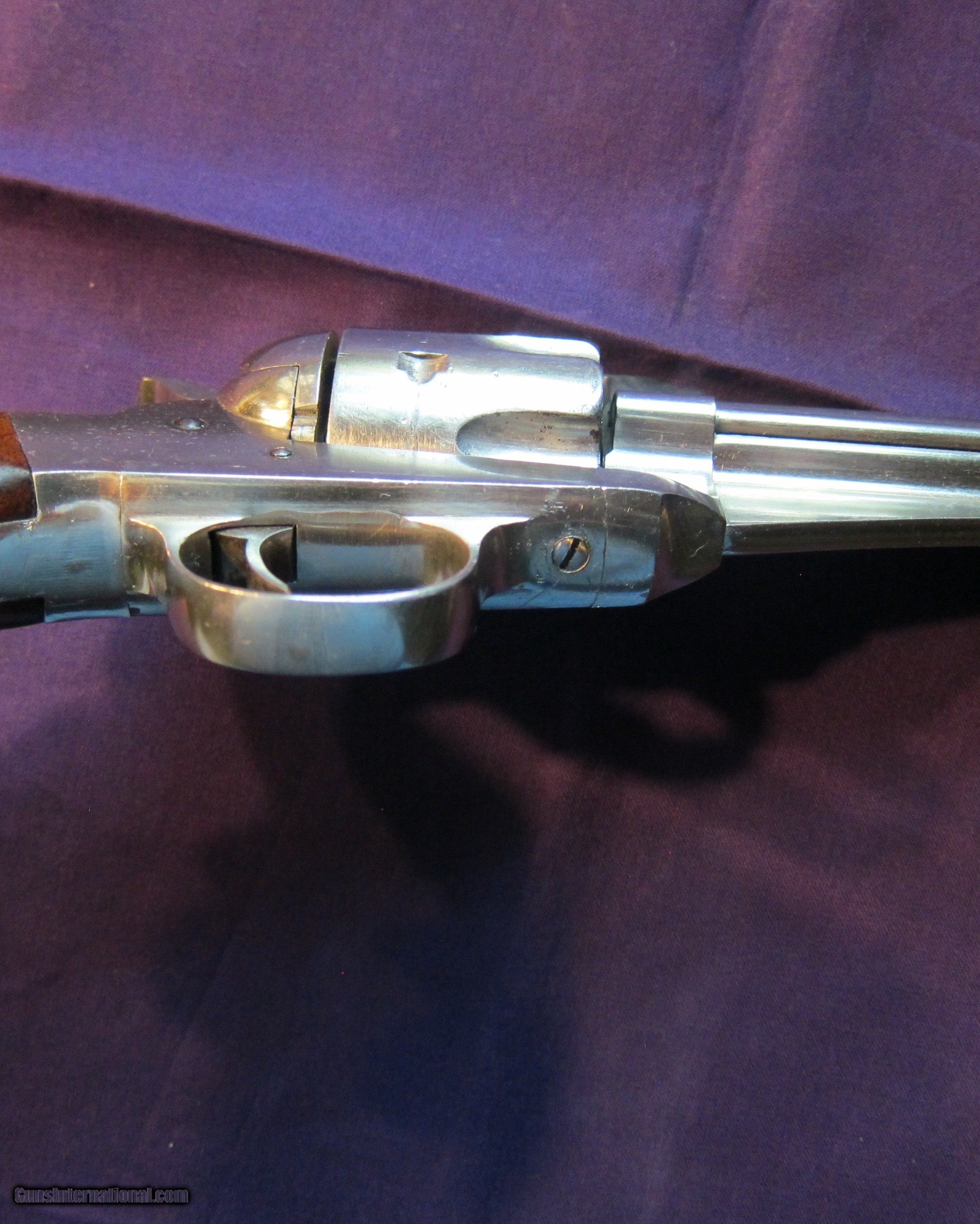 Description: Up for review is an 1875 Remington revolver. These guns were produced somewhere between 1875 and 1889. The exact date for each pistol is a bit difficult to determine due to the fact that they were made in several batches and the serial numbers were occasionally duplicated. The serial numbers are not commonly on the external surface of the revolvers but rather they appear under the grips on the frame of the pistol. Many of these numbers appear to me to be batch numbers rather than actual serial numbers but I could be mistaken. Most had 7 1/2 inch barrels and were either blued or nickel plated. A few were produced with 5 1/2 inch barrels. Three calibers were produced over the course of time and these included the .44 Remington, the .44 WCF and the .45 Colt. Remington stepped imto the western revolver market a couple years too late for effective competition with Colt's 1873 single action pistol and so with Colt's Government contracts already established these revolvers failed to sell as well as might have been anticipated. Only about 25-30 thousand of these Remington guns were ever produced with many being sold into the civilian market to very satisfied customers not the least of which were Jesse and Frank James. The photos in this communication will describe the pistol perhaps better than words can but the interesting part of this revolver is its likely history. When Custer of Little Big Horn fame made his way into Dakota Territory in 1873 a contract physician by the name of Henry Hobart Ruger accompanied the Seventh Calvary to Fort Rice. Dr. Ruger traveled with the seventh Calvary on the Yellowstone expedition in 1873 led by General Stanley. This group of 1500 men provided protection for the Northern Pacific survey party, which made it as far south as the mouth of the Big Horn river that year. During the fall of the same year Dr. Ruger returned with the Seventh Calvary to Fort Abraham Lincoln near Bismark which was their headquarters at the time. Soon there after he was transfered to the 17th infantry and so avoided the Black Hills expedition of 1874 and even more importantly the Battle of the little Big Horn two years later. Following several more transfers within the Army structure acting as a contract physician he moved to Fort Totten where he provided his brand of medicine for the Indians on the reservation near the fort. He remained in practice there until 1884 and then retired from military service. In 1887 he moved to Devil's Lake right outside of Fort Totten where he ranched and lived for the rest of his life dying of a stroke in 1906. Of particular interest in the story at this time is his most likely association with the veterinarian who took care of the calvary horses at Fort Totten during the time he was in practice there. This man's name was Dr. Frank Tompkins. After retirement these men farmed juxtaposed land just outside of the fort. It is highly likely that they not only knew each other but were close friends. According to the affidavit enclosed and signed by a notary the pistol now being discussed was passed down through the Tompkins family over several generations with the initials HR on the butt stock. I would suspect that this Remington revolver at one time belonged to Dr. Hobart Ruger a contract physician that traveledd with George Custer and the seventh Calvary just prior to the battle of the Little Big Horn. Thanks for taking a look and listening to perhaps a little history. Will answer questions to the best of my ability through the G.I. site or by phone. SOLD |