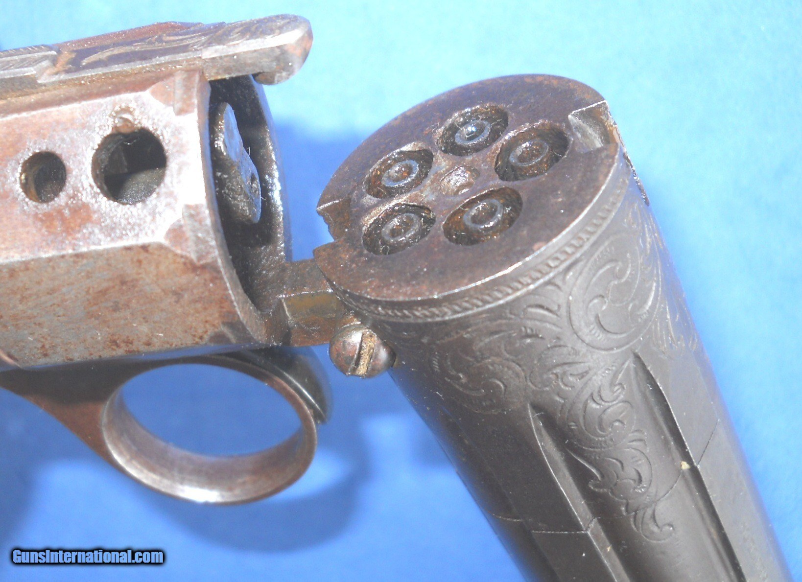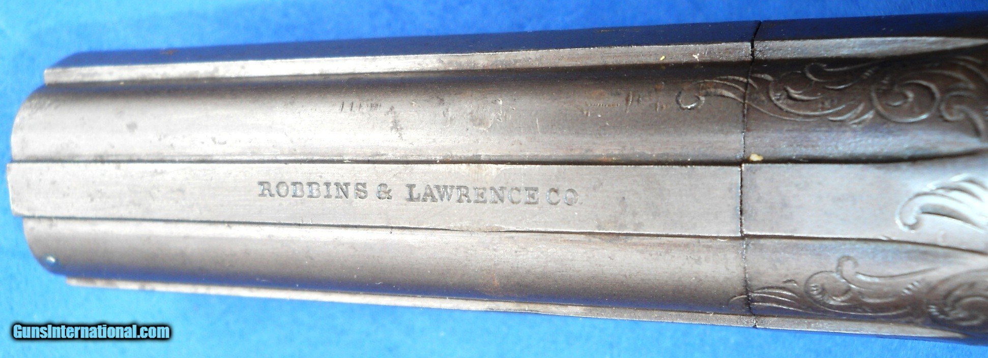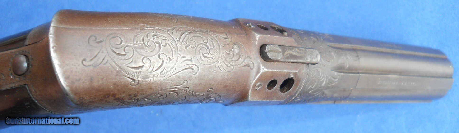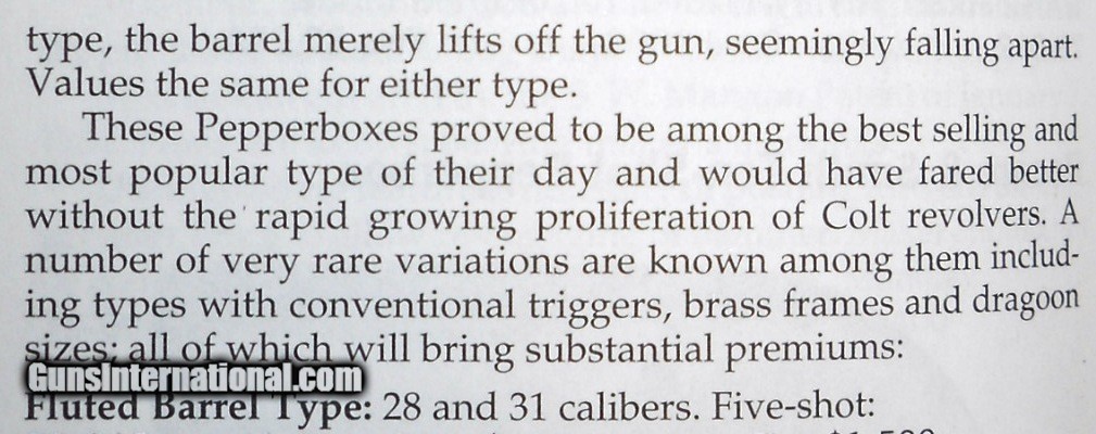 Description: ROBBINS & LAWRENCE, WINDSOR, VT .31 CALIBER PEPPERBOX PISTOL WITH EARLY "LEONARDS PATENT 1849" MARKING. 9 1/4" OVERALL WITH 4 1/2" BARREL, ORIGINAL SMOOTH BROWN FINISH & FACTORY ENGRAVING. VERY NICE BORES WITH DISTINCT RIFLING & NIPPLES ARE CLEAR. FRAME AGED TO A GRAYISH BROWN PATINA HAVING SOME STAINS MOSTLY ON THE RIGHT SIDE. WALNUT GRIPS ARE CORRECTLY STAMP NUMBERED MATCHING THE GUN. ACTION WORKS FINE CRISP & ROBUST. I PERSONALLY WOULD HAVE NO PROBLEM SHOOTING IT. VERY NICE EARLY EXAMPLE OVERALL, AS PICTURED. LIKELY A FIRST YEAR GUN ! SEE ALL "ESTATE ANTIQUES" LISTINGS FOR MORE ITEMS AT REALISTIC PRICES FROM OLD COLLECTIONS & ESTATES. $20.00 S&H DIRECT TO BUYER ANYWHERE THAT'S OK. NO LICENSE NEEDED. SOLD Antique: Yes Handgun Caliber: .31 Manufacturer: ROBBINS & LAWRENCE Model: PEPPERBOX Serial Number: 856 Barrel Length: 4 1/2 Bore: SHARP RIFLING Chambers: CLEAR Condition: NRA FINE Metal Condition: ORIGINAL Wood Condition: FINE Bore Condition: NEAR EXCELLENT Barrels: 5 SHOT Barrel Type: CLUSTER Action: CRISP Triggers: RING TRIGGER Stock: WALNUT Finish: ORIGINAL Manufacture Date: 1851-1854 Engraving: FACTORY HAND ENGRAVED |