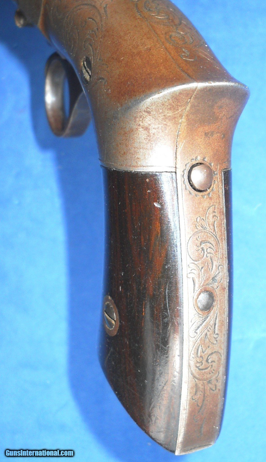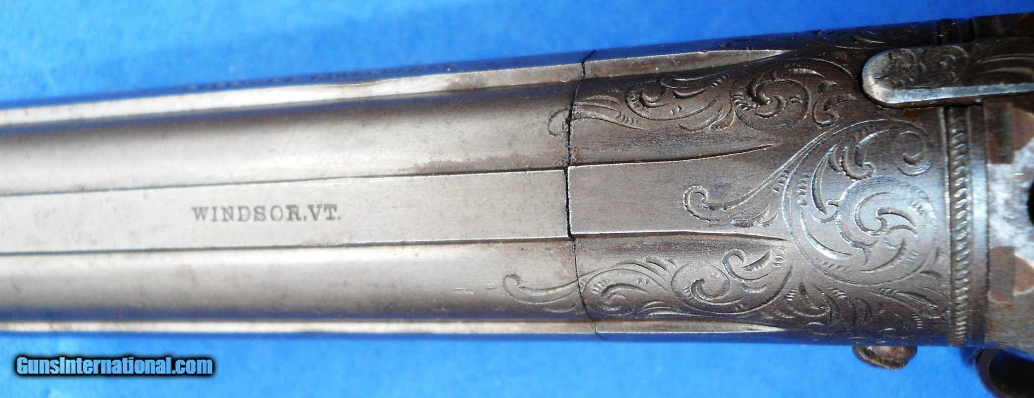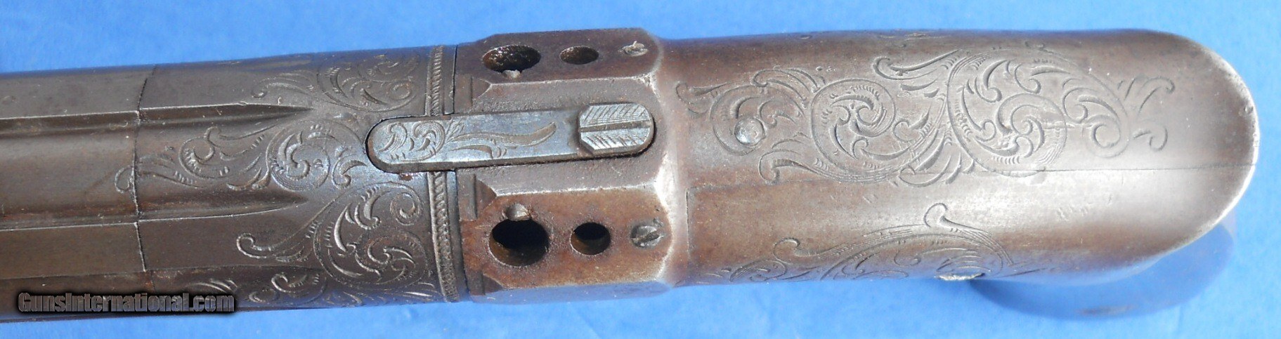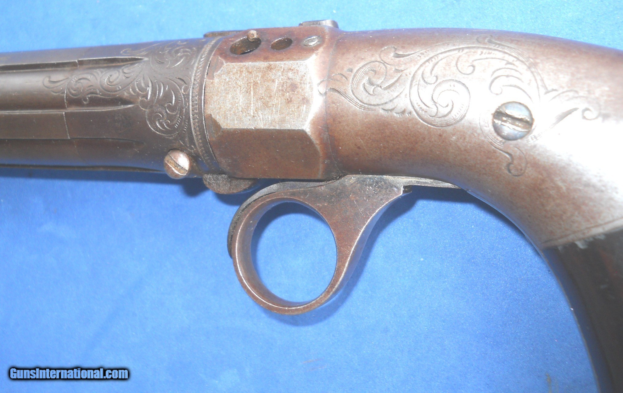 Description: ROBBINS & LAWRENCE, WINDSOR, VT .31 CALIBER PEPPERBOX PISTOL WITH EARLY "LEONARDS PATENT 1849" MARKING. 9 1/4" OVERALL WITH 4 1/2" BARREL, ORIGINAL SMOOTH BROWN FINISH & FACTORY ENGRAVING. VERY NICE BORES WITH DISTINCT RIFLING & NIPPLES ARE CLEAR. FRAME AGED TO A GRAYISH BROWN PATINA HAVING SOME STAINS MOSTLY ON THE RIGHT SIDE. WALNUT GRIPS ARE CORRECTLY STAMP NUMBERED MATCHING THE GUN. ACTION WORKS FINE CRISP & ROBUST. I PERSONALLY WOULD HAVE NO PROBLEM SHOOTING IT. VERY NICE EARLY EXAMPLE OVERALL, AS PICTURED. LIKELY A FIRST YEAR GUN ! SEE ALL "ESTATE ANTIQUES" LISTINGS FOR MORE ITEMS AT REALISTIC PRICES FROM OLD COLLECTIONS & ESTATES. $20.00 S&H DIRECT TO BUYER ANYWHERE THAT'S OK. NO LICENSE NEEDED. SOLD Antique: Yes Handgun Caliber: .31 Manufacturer: ROBBINS & LAWRENCE Model: PEPPERBOX Serial Number: 856 Barrel Length: 4 1/2 Bore: SHARP RIFLING Chambers: CLEAR Condition: NRA FINE Metal Condition: ORIGINAL Wood Condition: FINE Bore Condition: NEAR EXCELLENT Barrels: 5 SHOT Barrel Type: CLUSTER Action: CRISP Triggers: RING TRIGGER Stock: WALNUT Finish: ORIGINAL Manufacture Date: 1851-1854 Engraving: FACTORY HAND ENGRAVED |