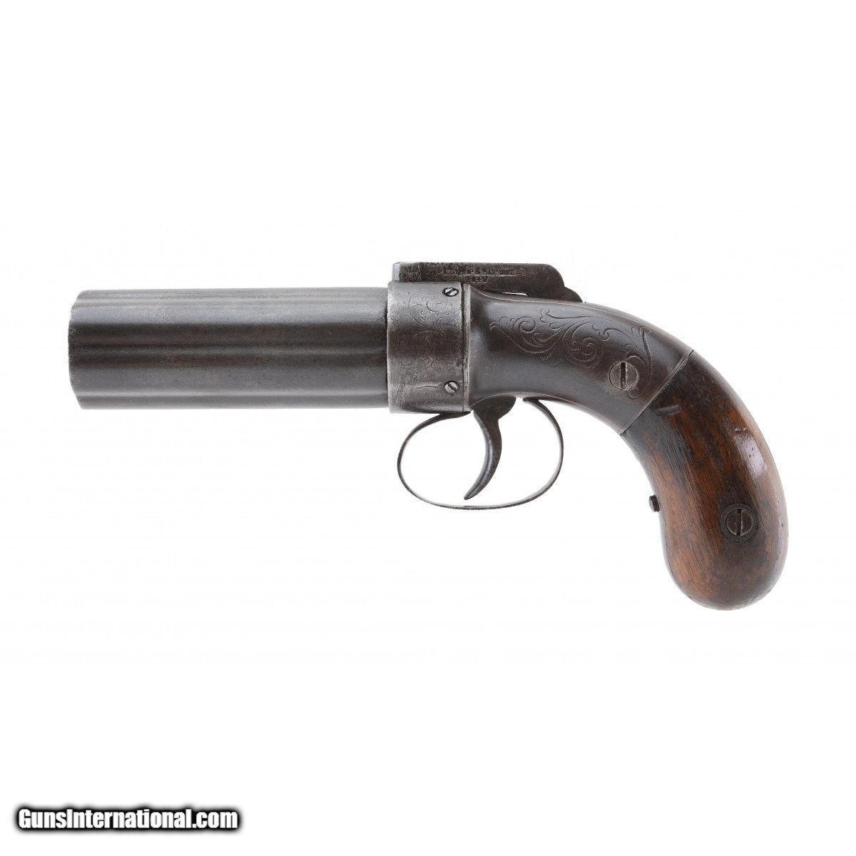 Barrels are marked ""Allen & Whellock Worchester Patented April 16"". Six shot bar hammer pepperbox with engraved nipple shield. Frame is also engraved with a broad leaf floral motif. Barrels are 4"". Bag shaped grips are original and in good condition. Metal has a mostly brown patina. Action works properly. Very good overall condition with eye appeal.