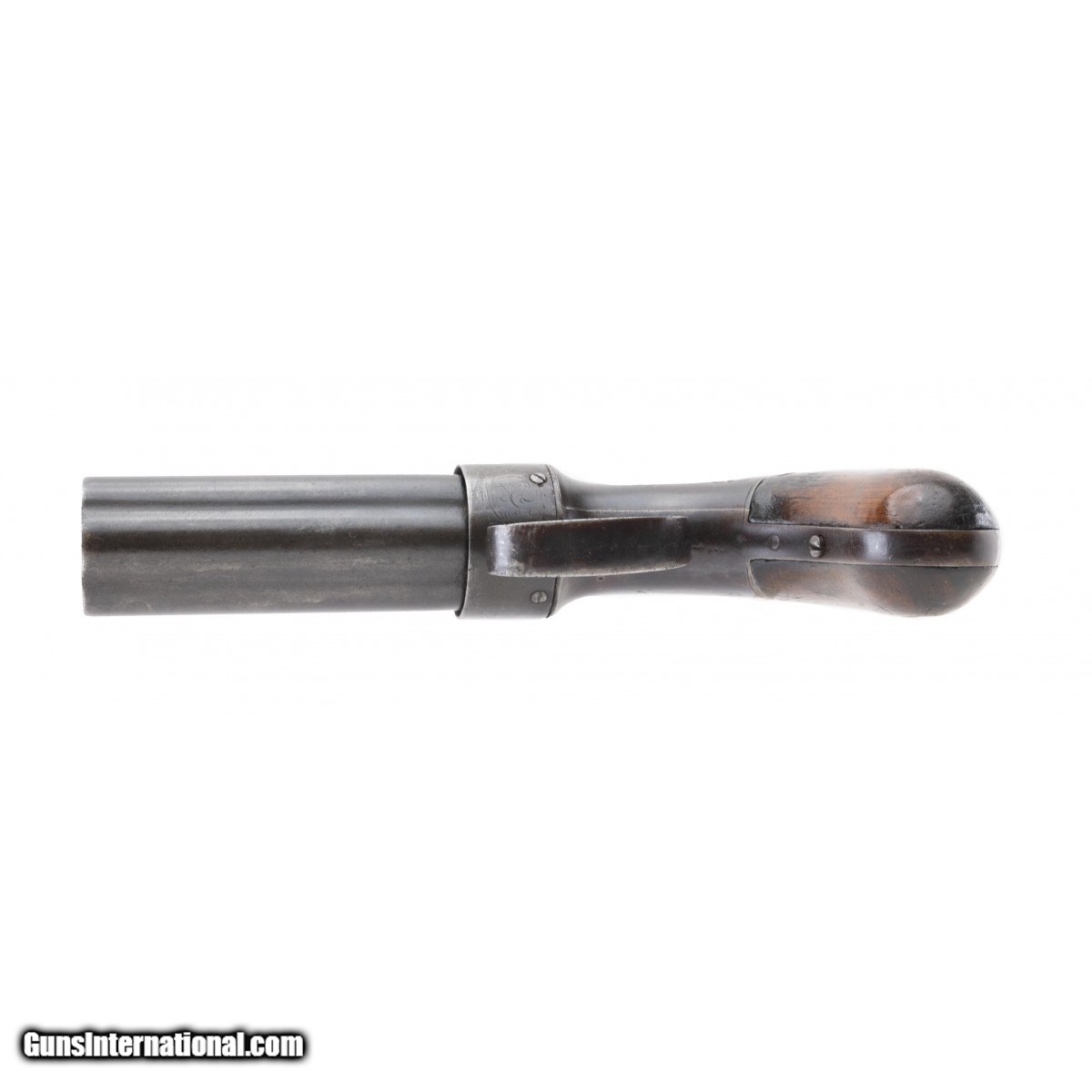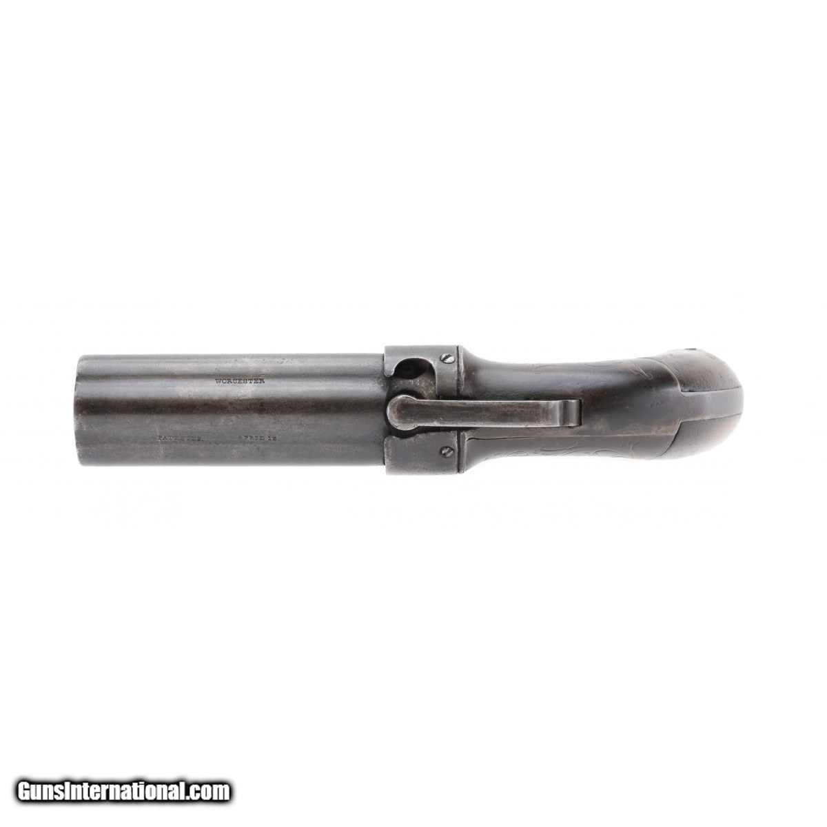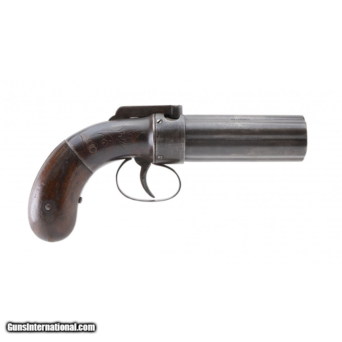 Description: " Barrels are marked ""Allen & Whellock Worchester Patented April 16"". Six shot bar hammer pepperbox with engraved nipple shield. Frame is also engraved with a broad leaf floral motif. Barrels are 4"". Bag shaped grips are original and in good condition. Metal has a mostly brown patina. Action works properly. Very good overall condition with eye appeal. SOLD Antique: Yes |