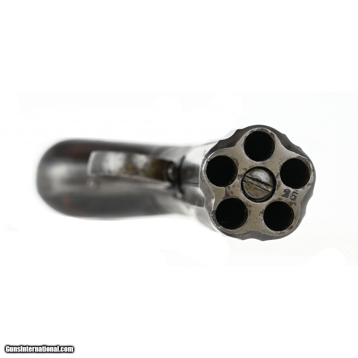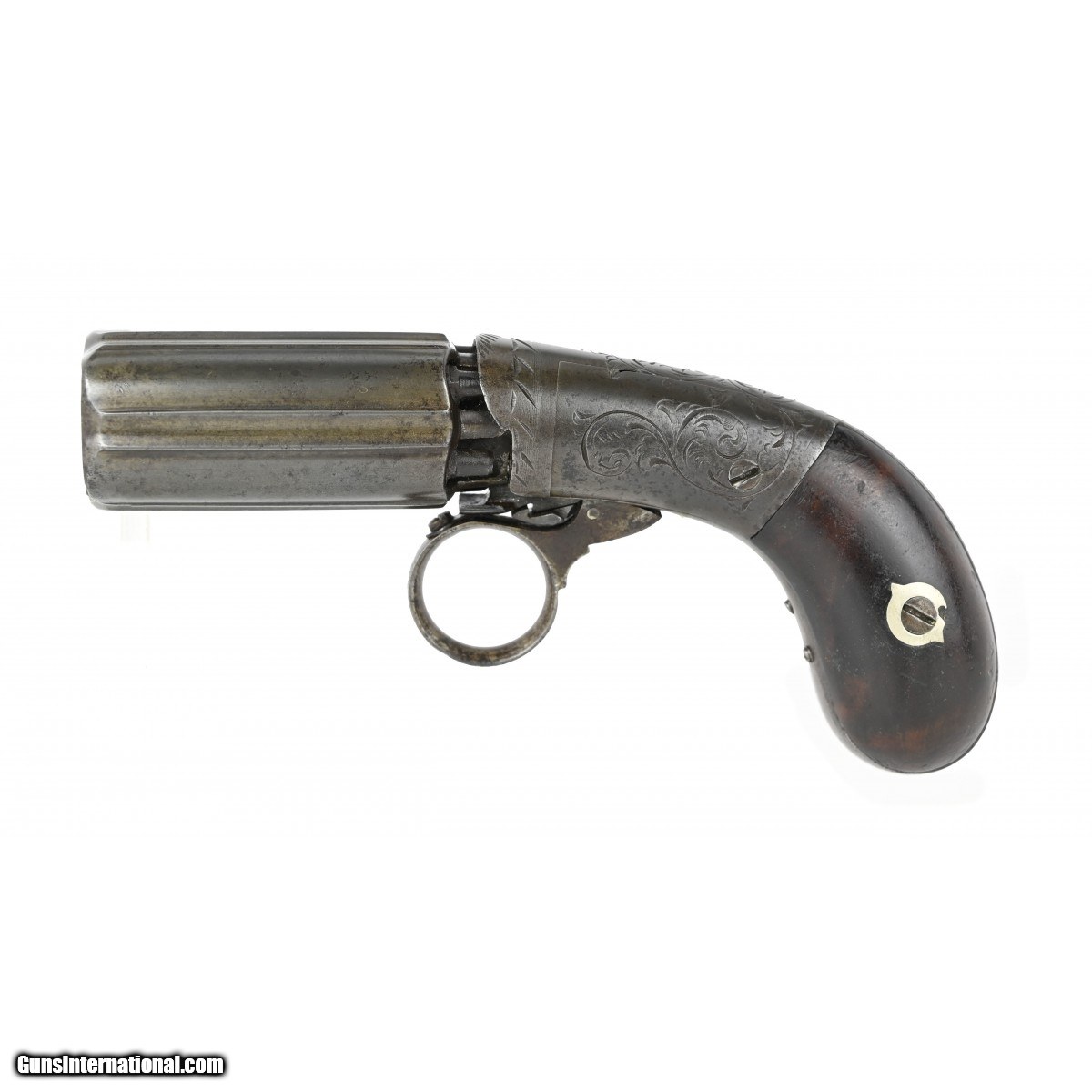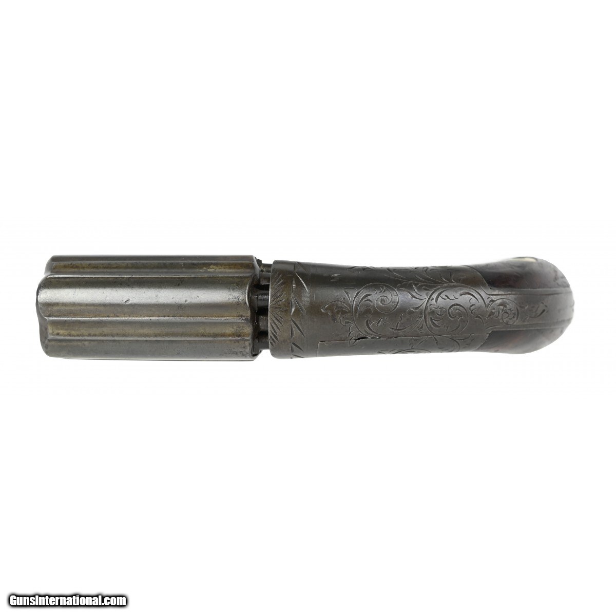 Description: "Blunt & Syms Small Frame Under Hammer Pepperbox Revolver. 5-Shot .28 caliber percussion. Frame is scroll engraved. Barrel length is 2 ¼". Front of barrel is marked with the number 25. Action works perfectly. Grips are very good to excellent, no chips or cracks. Overall, this is a fine small frame revolver that is sharp with little wear. SOLD Antique: Yes |