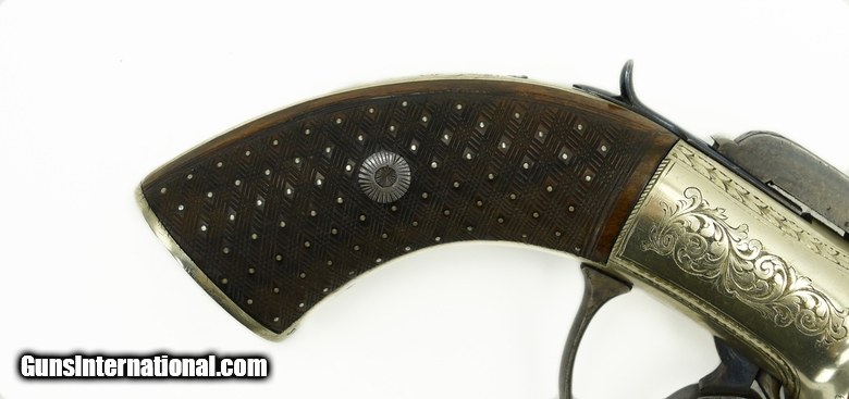 Description: "British Percussion ""6-Shot"" Pepperbox by Harley of Exeter. 6-shot, approximately .36 caliber. Barrels are nicely case colored and have approximately 90-95% vivid colors. The frame is scroll engraved and has all of its original finish. The hammer bar is engraved and has all of its case color. The grips are skipline checkered and are accented by silver tacks. Grips are perfect. Gun appears to have little or no actual use. Barrel length is 3", and overall length is 8". Gun is in a fine mahogany case with bullet mold, ramrod, flask lead balls, and Eley canon caps. Very fine cased pepperbox! SOLD |