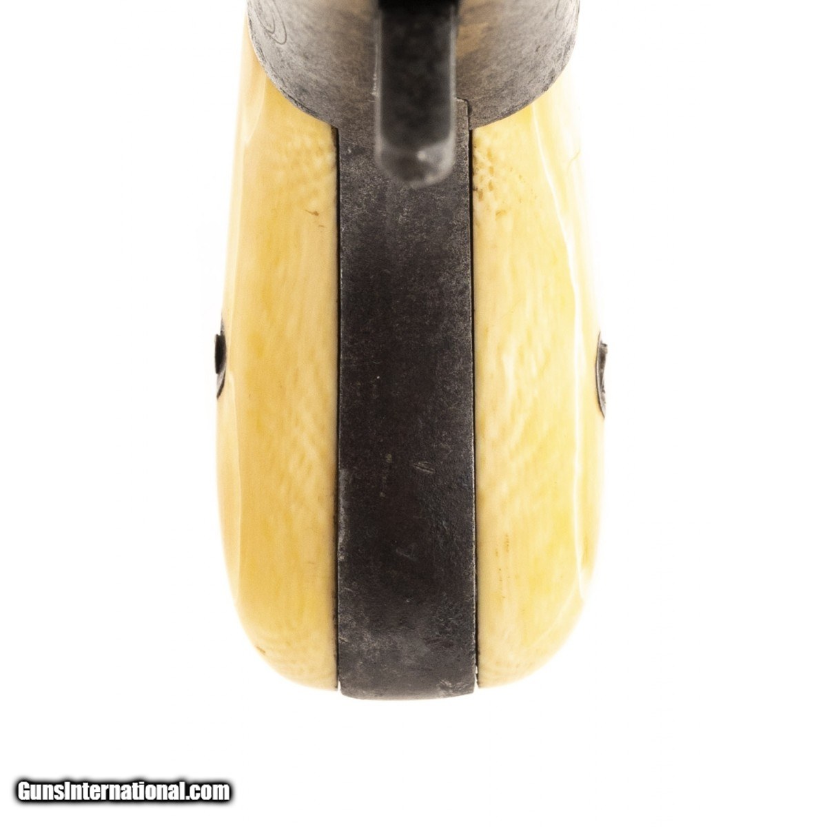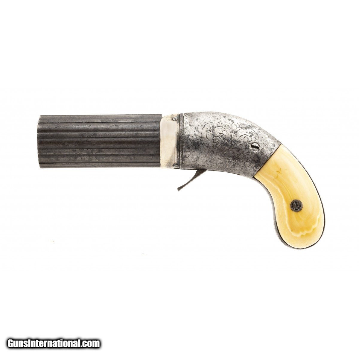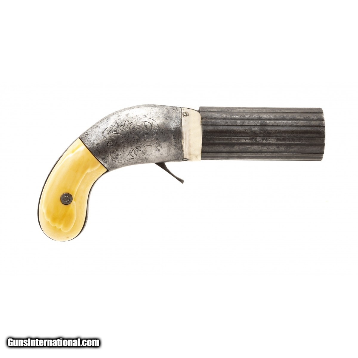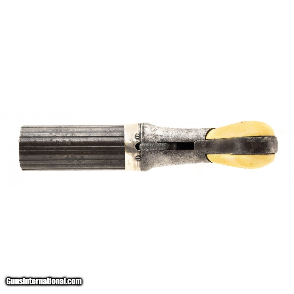 Description: "Made in the 1840s – 1850s. 28 caliber with 3 ½" 10 shot barrels. This is the scarcer model with the ribbed barrels. Frame is engraved. Barrels have a dark brown patina and frame has a light gray patina. Grips are very fine original ivories. The recoil shield may be an old replacement. Very fine desirable Pecare & Smith Pepperbox! SOLD Antique: Yes |